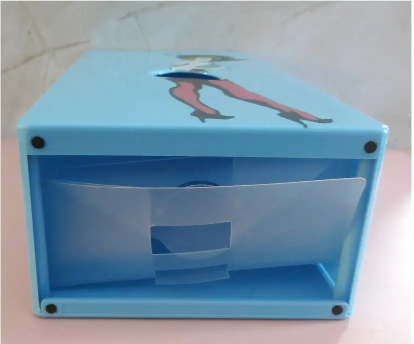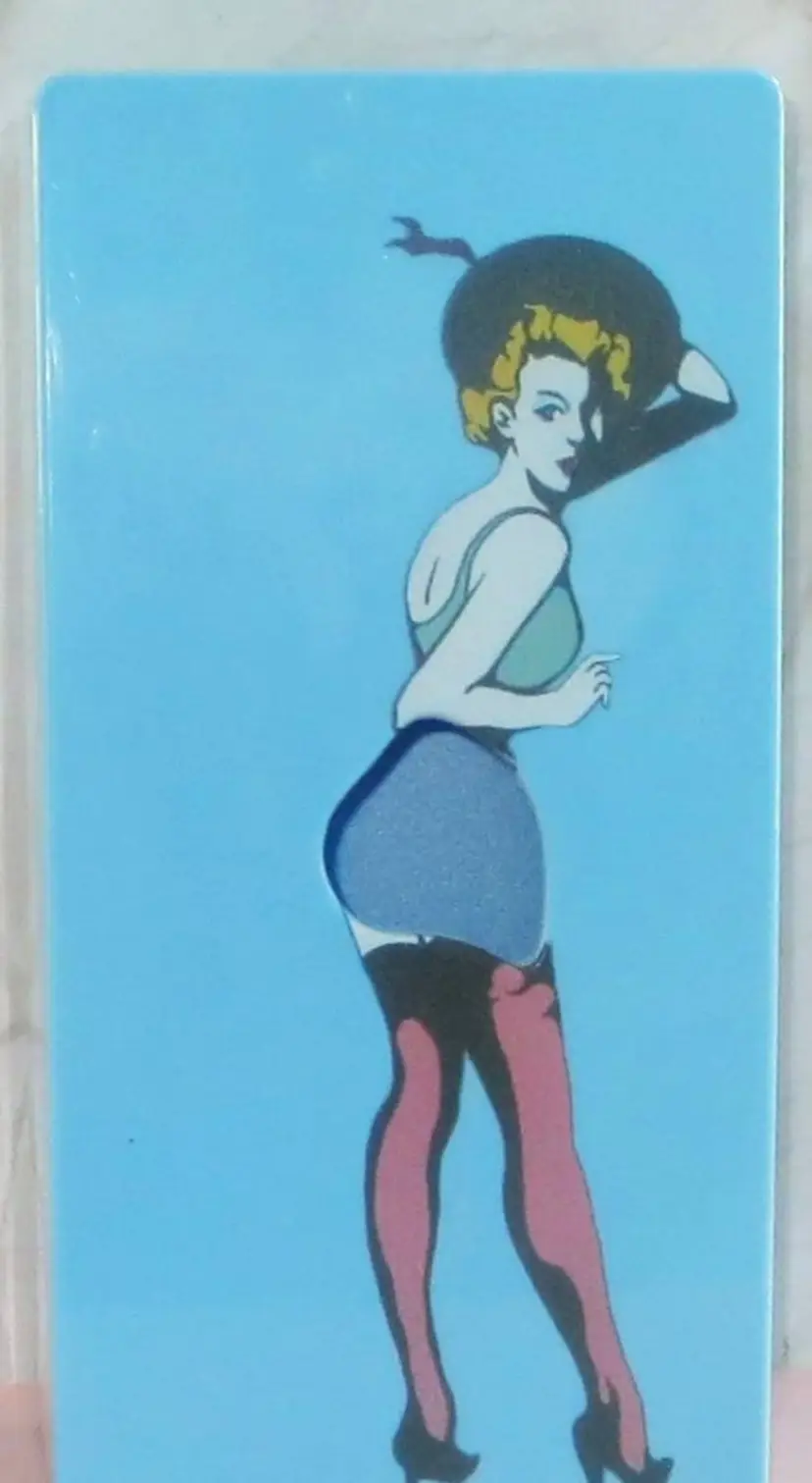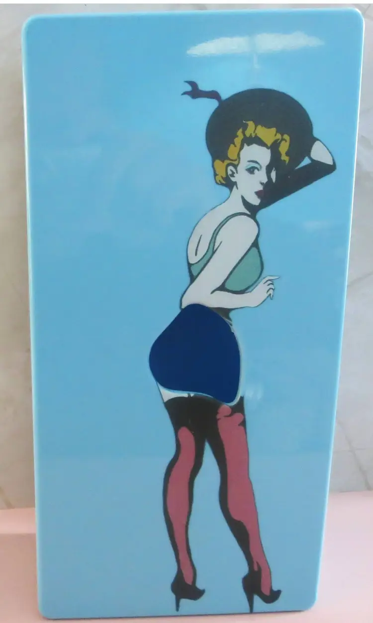 Vintage Pin Up Girl tissue box made of hard plastic. Can use on flat surface or wall mount. 10 inches long, 5 wide, and 3 inches high.
