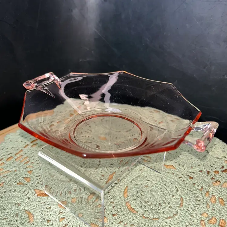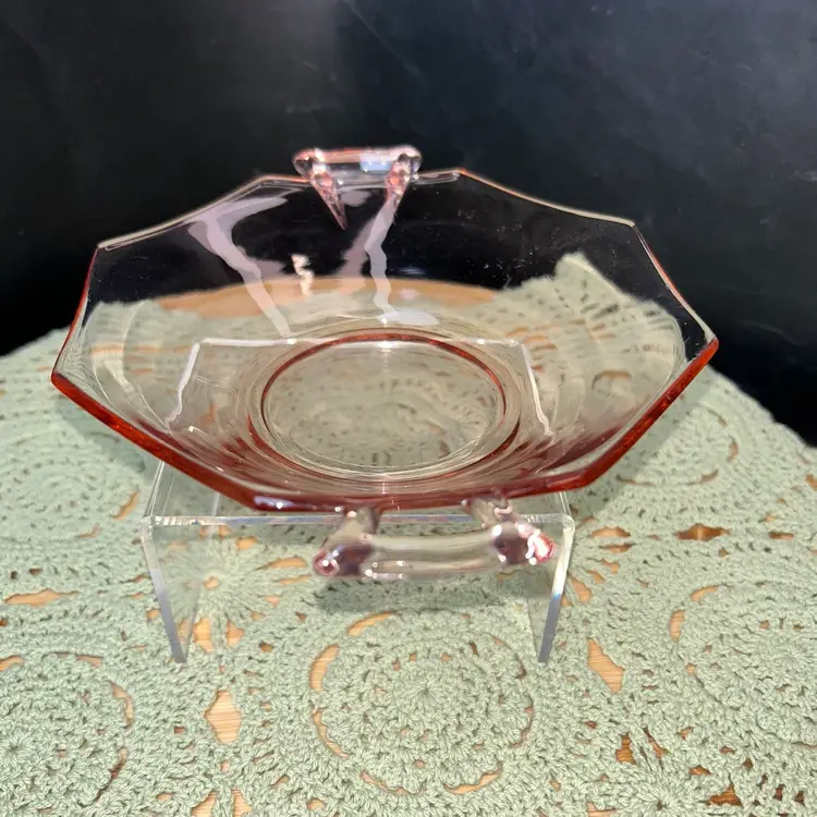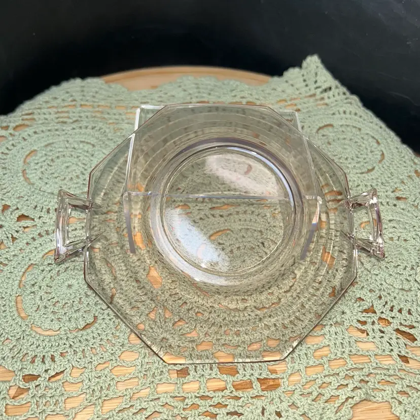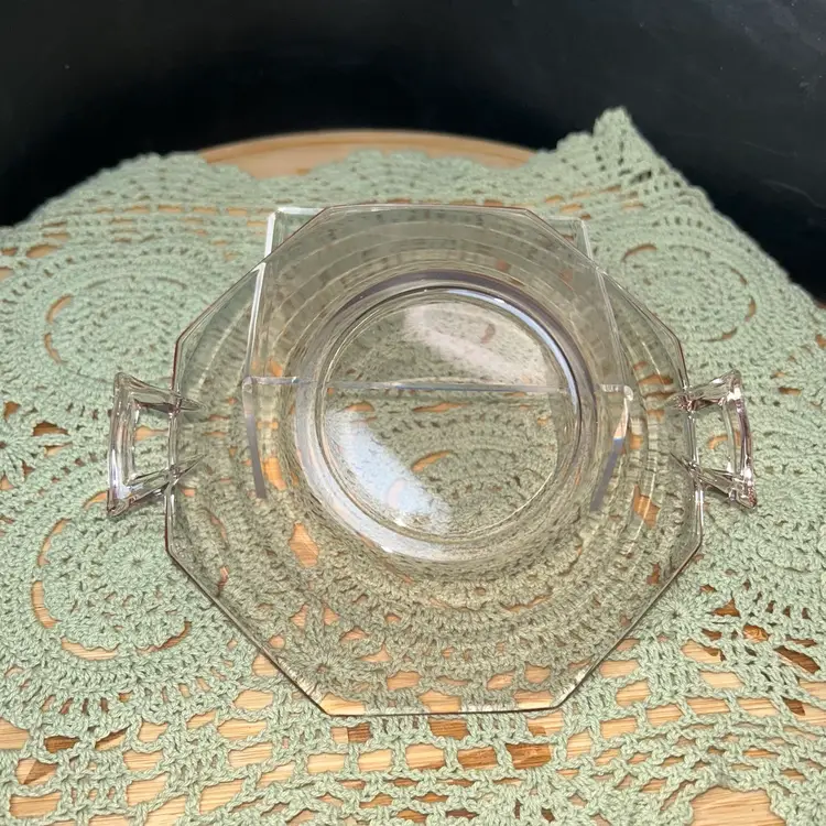 Octagon shaped dish. 6” in diameter across top, base is 2.75” in diameter, 7.25” wide from outside of one handle to other, 1.5” tall. Excellent condition.