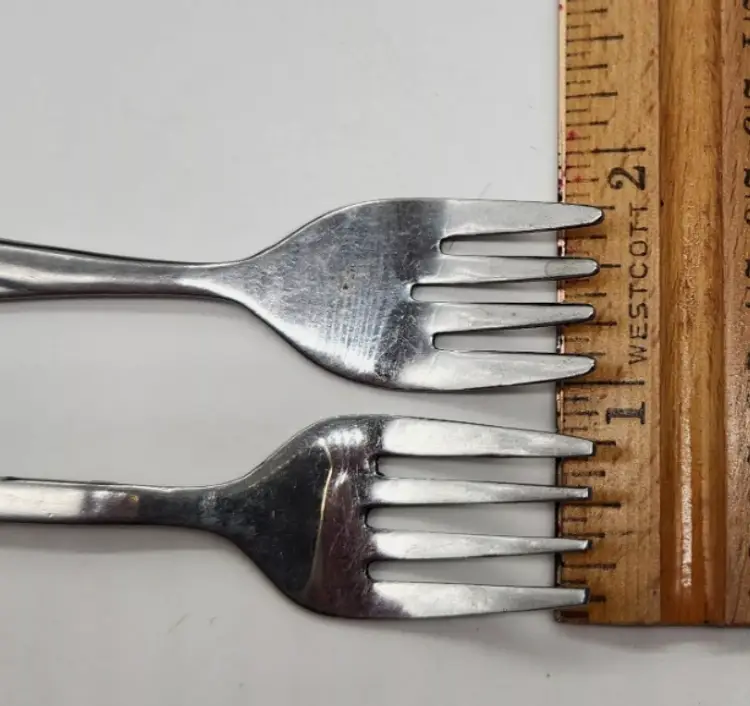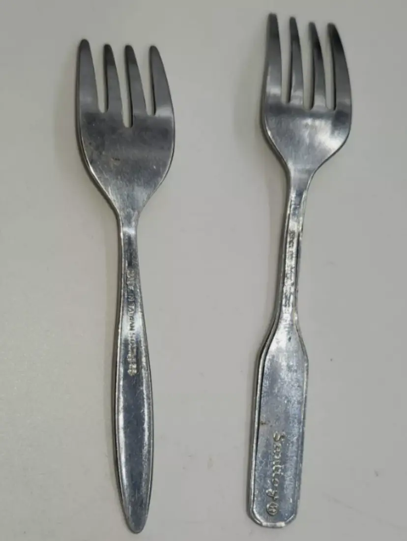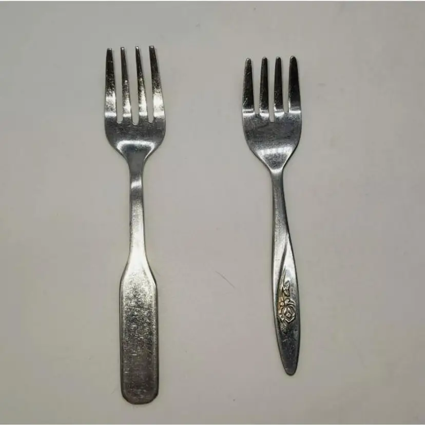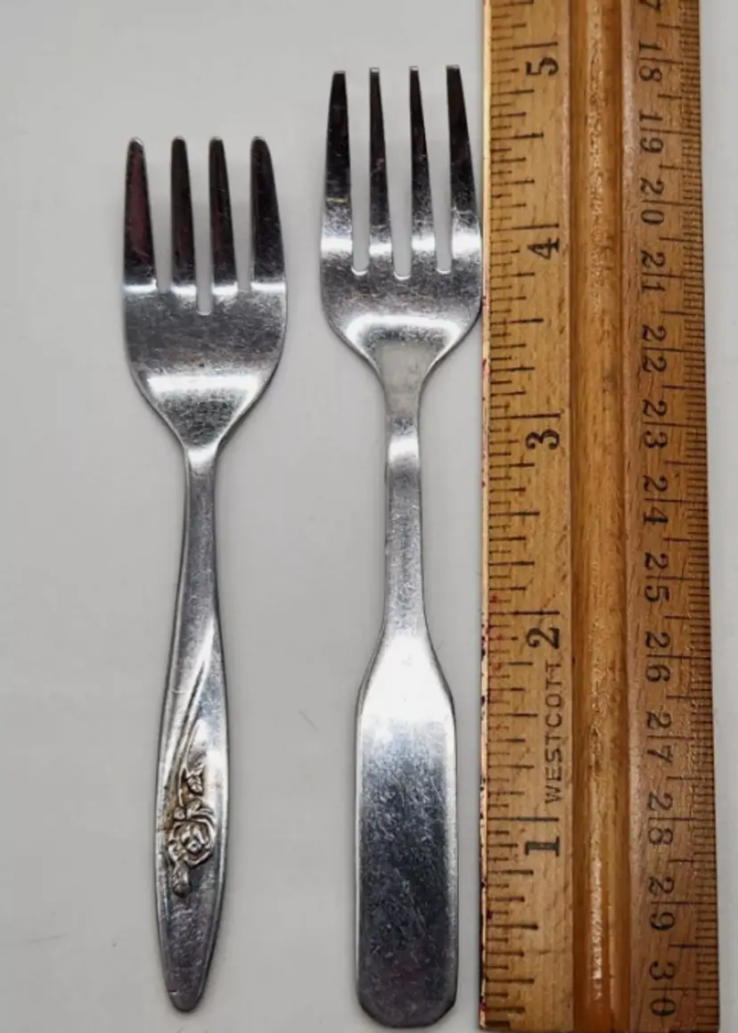 Pictures are part of my description with measurements. These were from my toddler years over 40 years ago One fork measure 5 inches in length and the other is 4.5 inches in length. Both are owned by me since 1980s. Does have wear marks from use. One is undecorated with Sanitoy, Taiwan & stainless steel on the back and the other has no makers mark, just marked stainless steel and with a rose on the front handle.