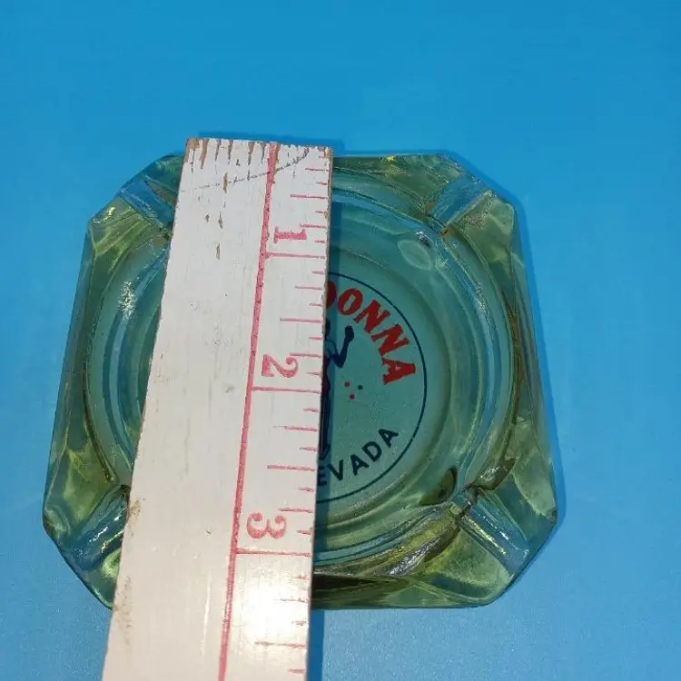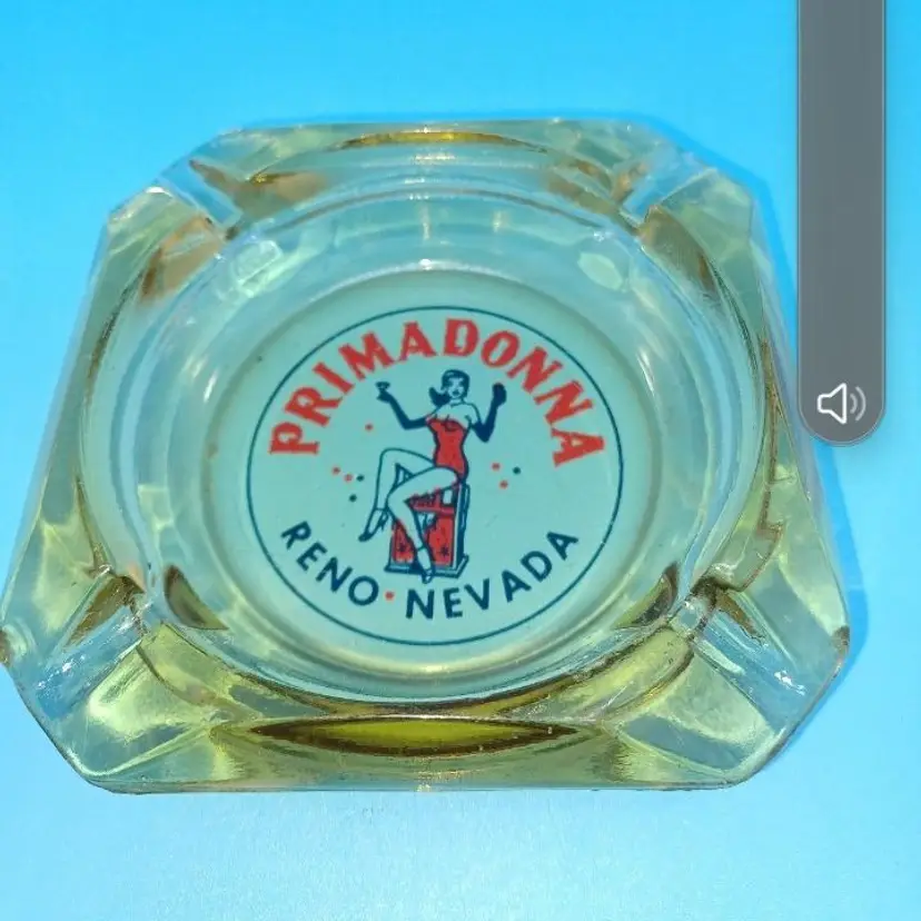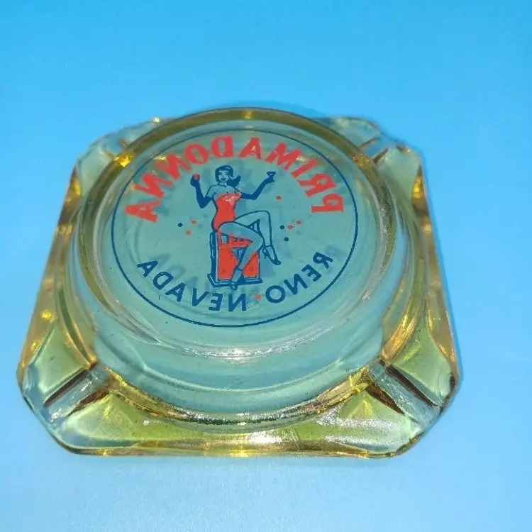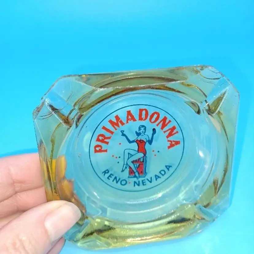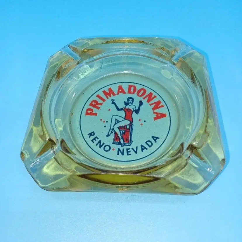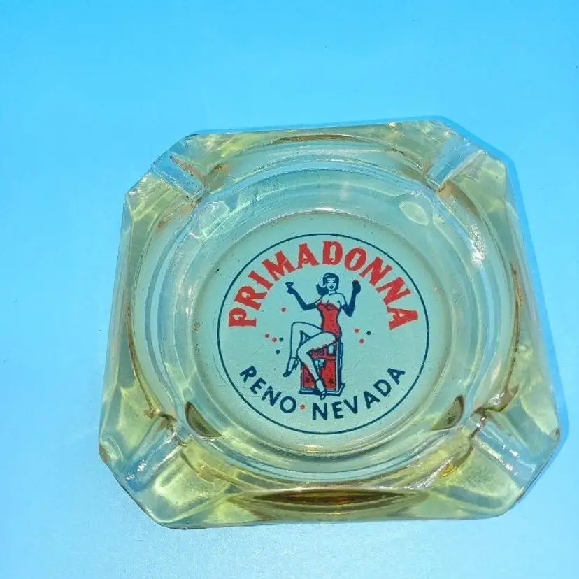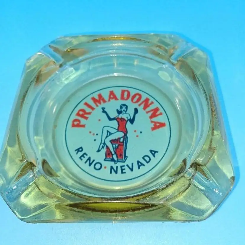 Vintage Primadonna Casino Reno Nevada amber glass ashtray. This casino closed ages ago in Reno Nevada. I remember as a child driving by with their big feather plumed showgirl statues out in front. Nice red and blue pin-up design on the amber glass ashtray measures 3 1/2 in by 3 1/2 in Ashtray is in fair condition does have chips to the corners which I did try to picture but the graphic is still in really great shape all items from a smoke-free home with pets (I know that's funny since it's an ashtray) experienced glass shipper Please see pictures as they're the best description