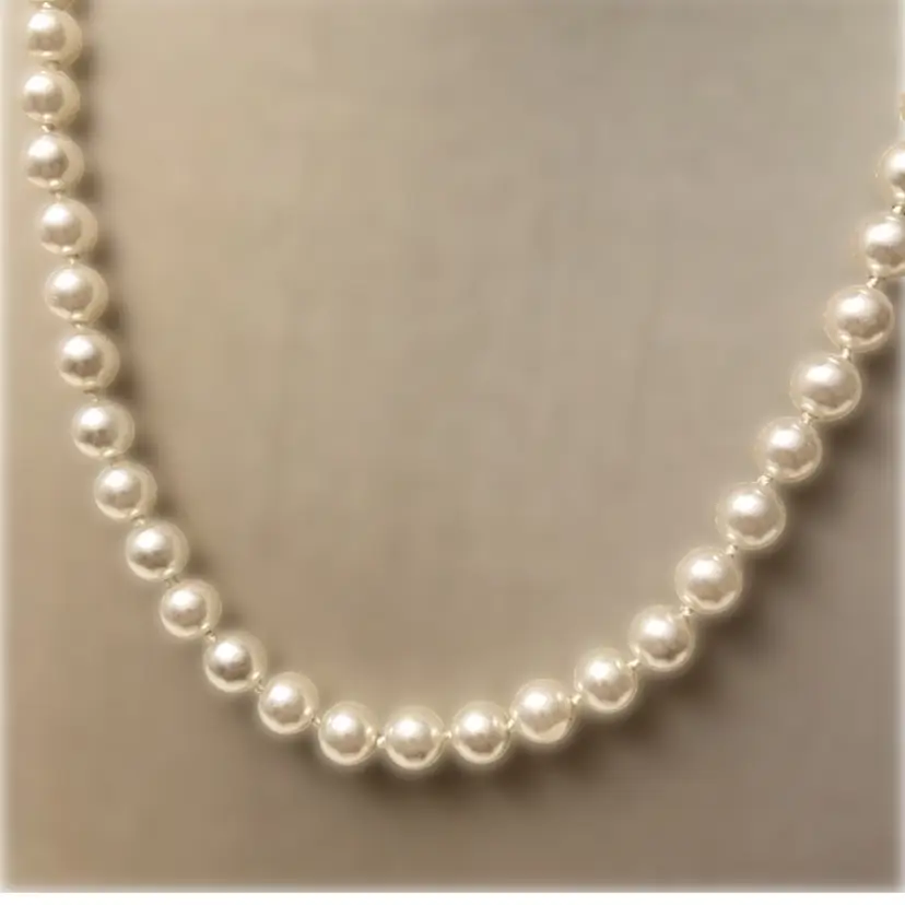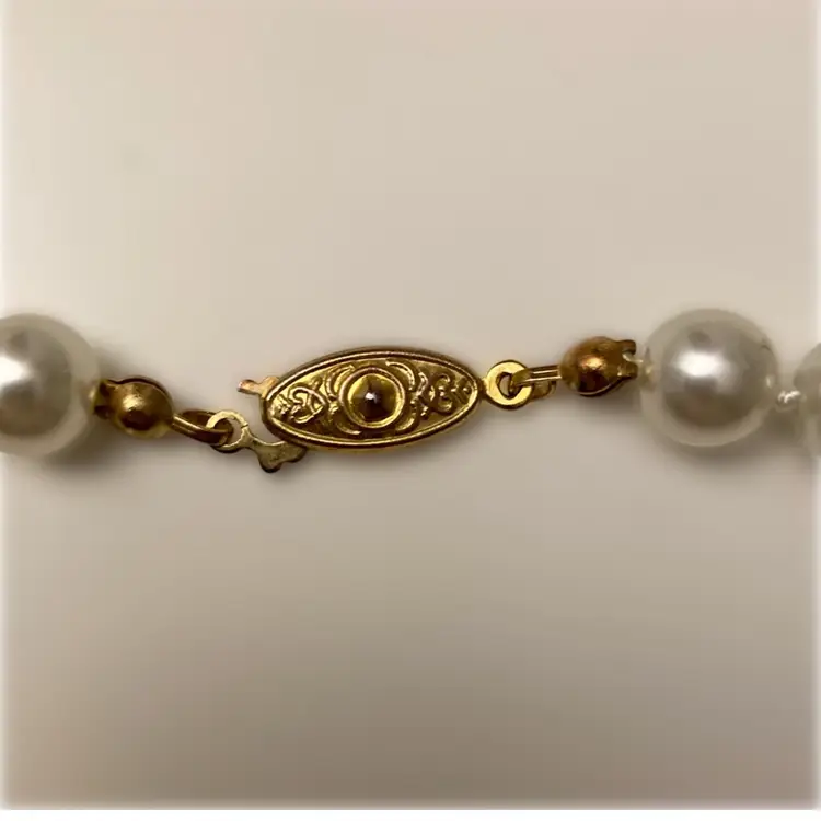 This is a nice quality faux pearl necklace. The glass pearls measure 3/8”. The necklace kength is 19 1/2”. Made in Japan.