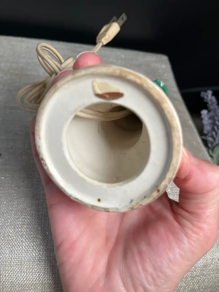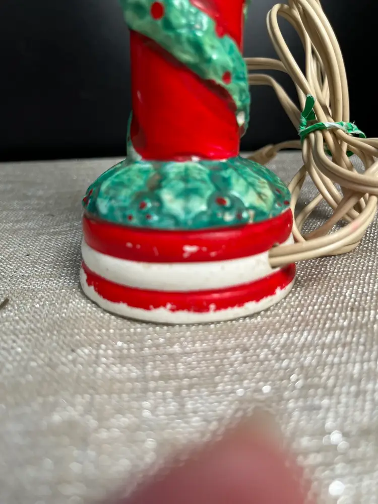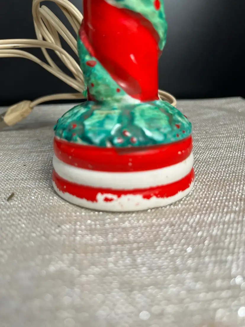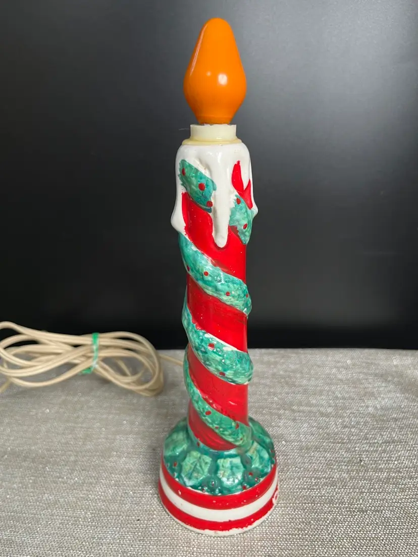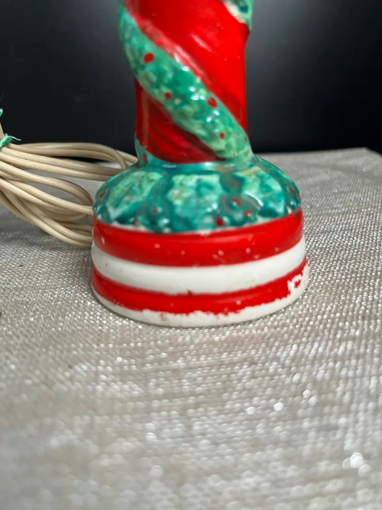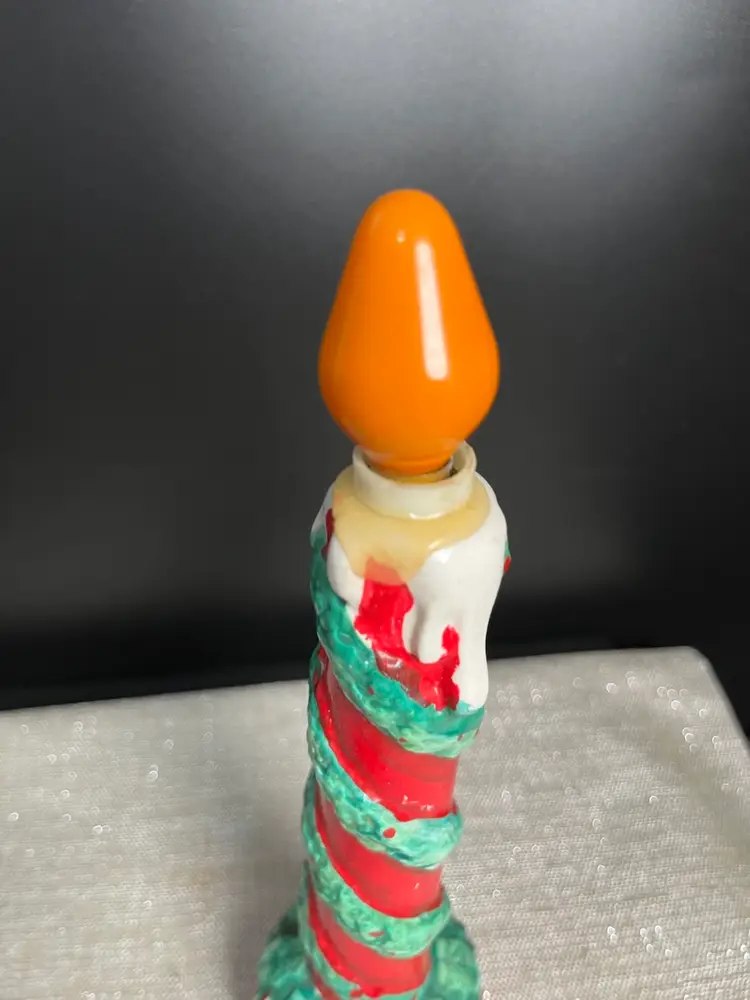 This is hand painted with cold paint and is in fantastic condition. Only very slight paint wear that is consistent with its age (refer to pictures). The glue at top of candle is used to keep the electrical bulb holder is yellowed-this is definitely related to age. This is in working condition and will come with working gold bulb. However, DO NOT PLUG IN & LEAVE ON UNATTENDED. There is no UL sticker-this was probably produced prior to those safety standards. It has a partial Relco sticker on bottom. This is from my personal collection. These are hard to find. It measures approx 7.5"H-without bulb, 2.5" at base, 6.9 Oz. This will ship alone.