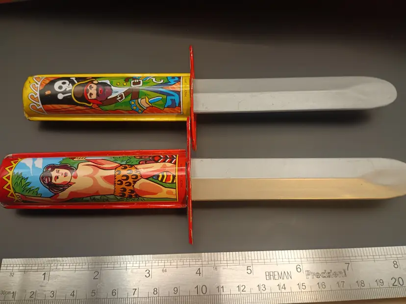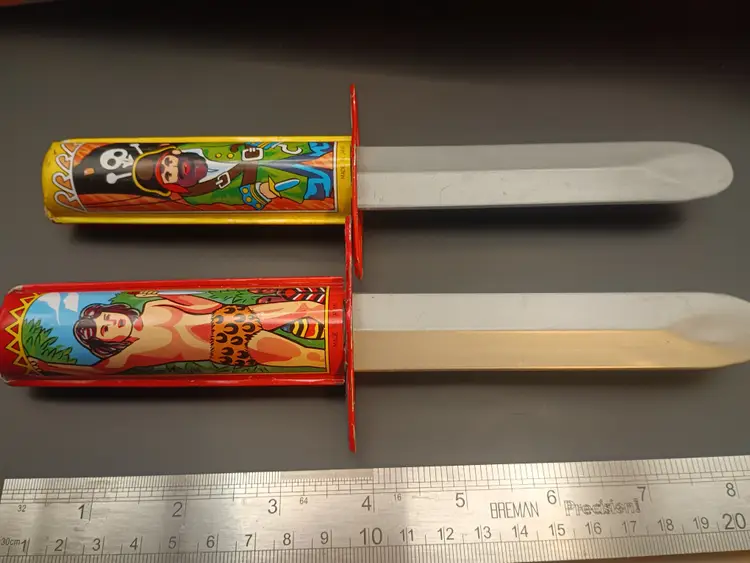 Thanks for viewing my goodies;) In this lot you will receive 2 vintage retractable tin toy knives from the 1960s. One has a Tarzan graphic and one has a Pirate graphic. Both are in great condition and work properly. They measure approximately 8 inches.