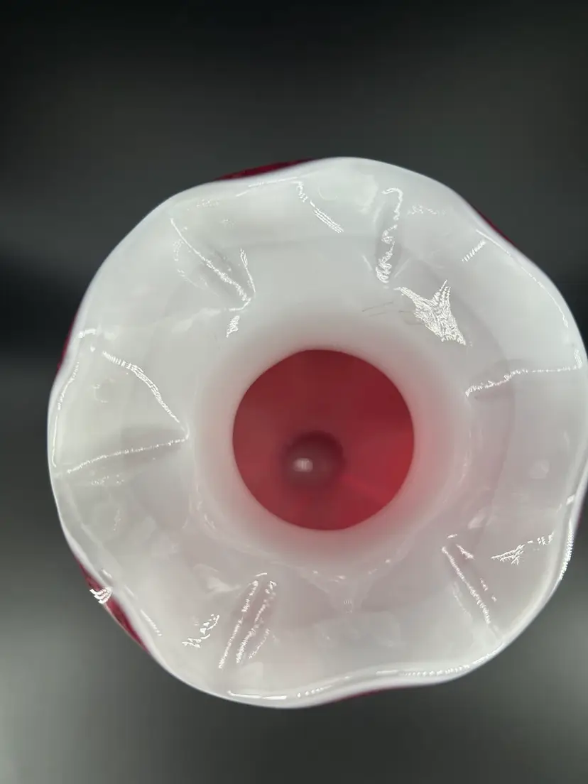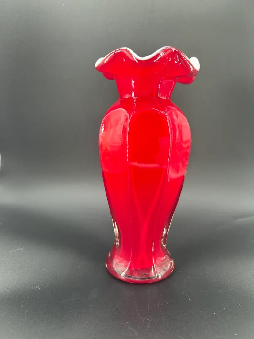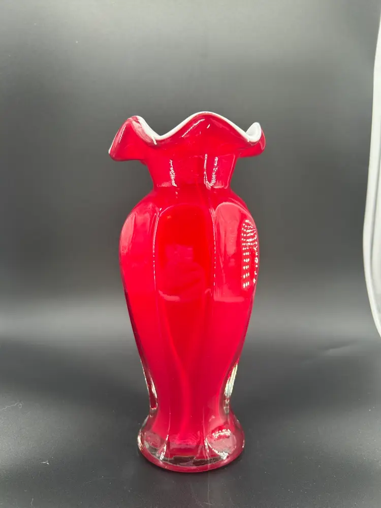 This is a vintage ruby red blown cased art glass vase. It features a vivid red exterior with a ruffled, white interior which provides a striking contrast. It stands 8 inches tall and 3 inches across the top. There are no chips or cracks.