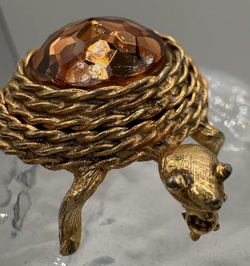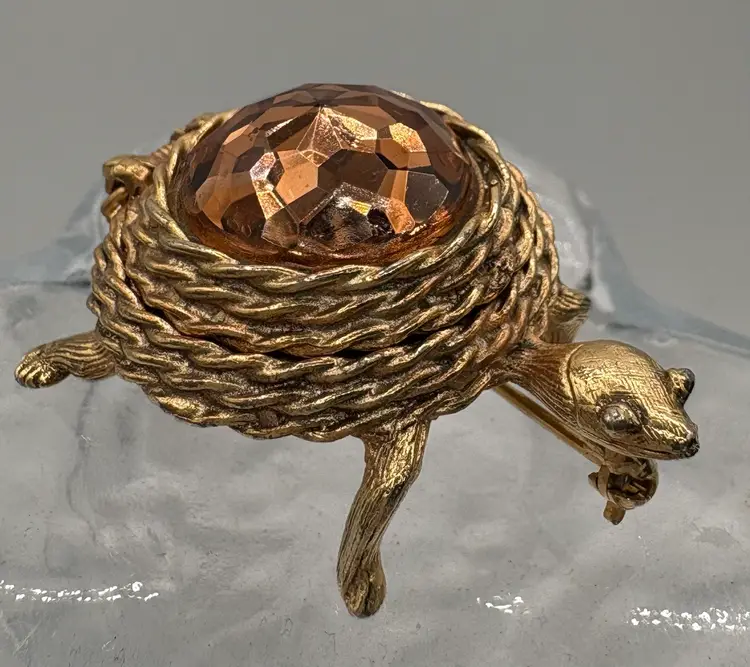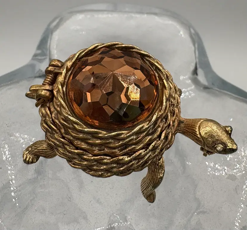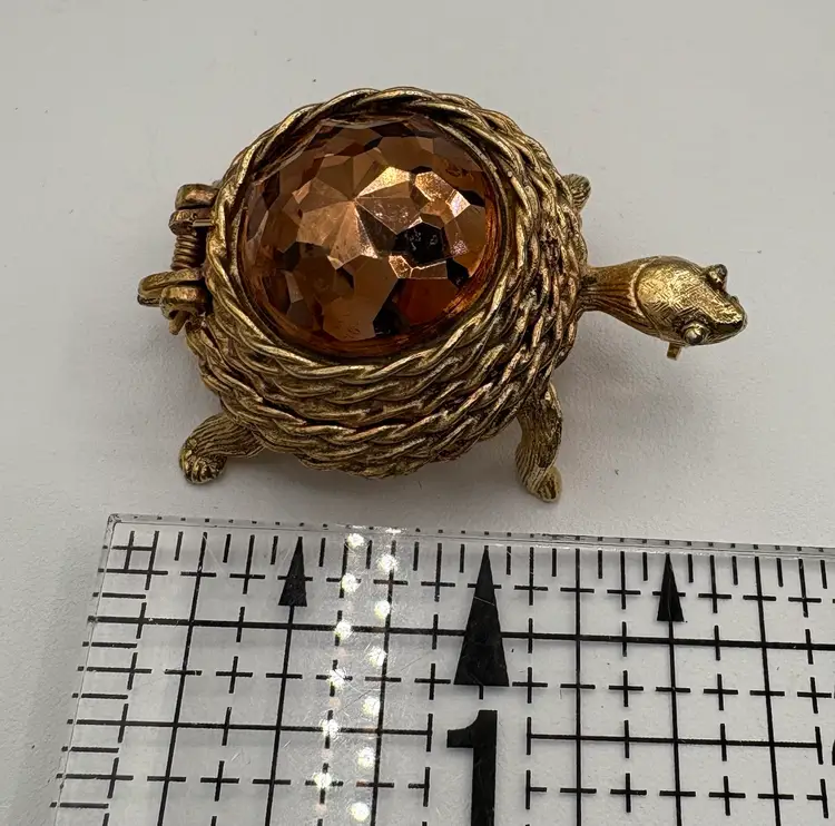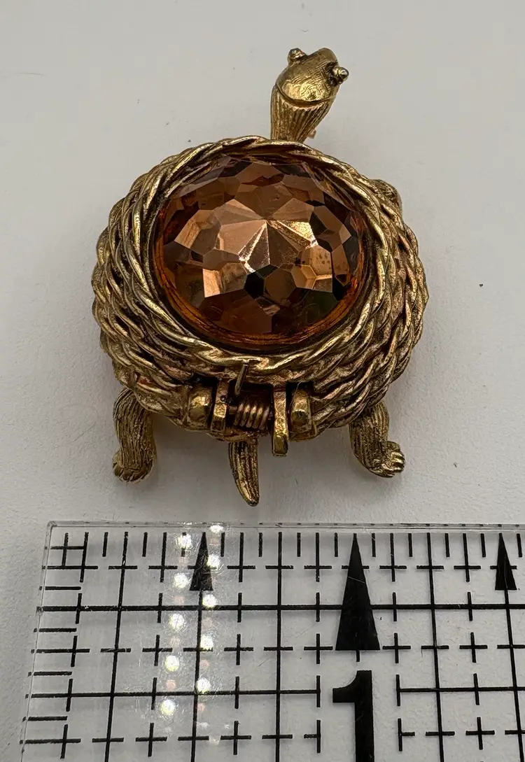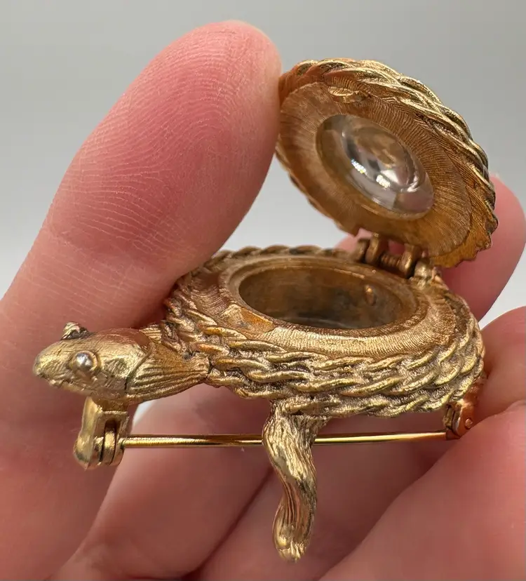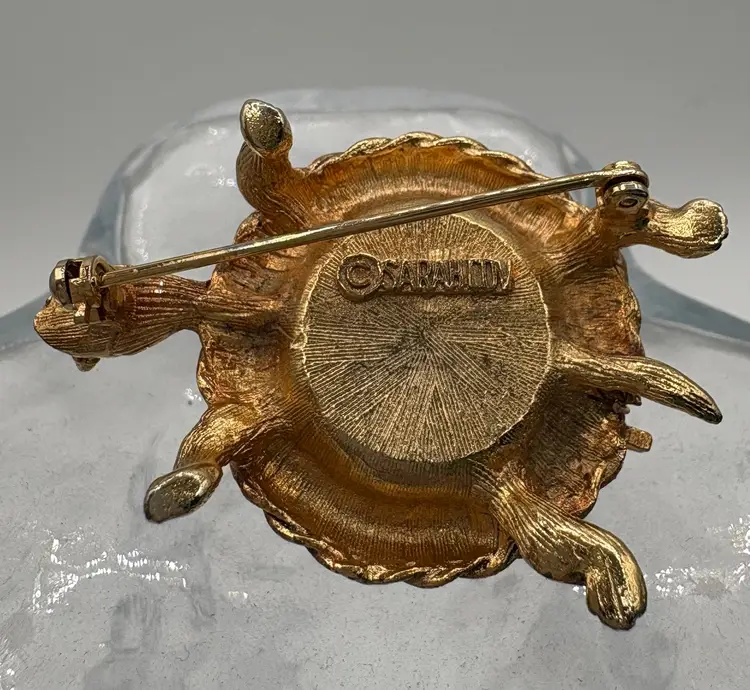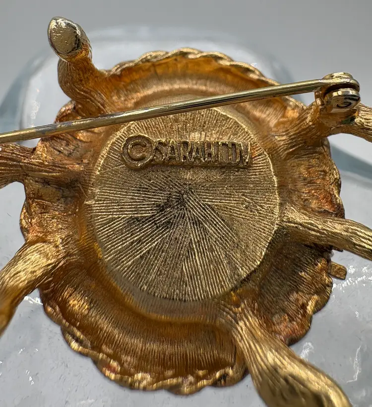 Part of the Perfumed Jewelry line, this is the “Scented Traveler Pin” from 1969. Golden tone with a topaz-colored domed spring lid. Would have held a perfume balm, empty now. The pin does not have a smell. Nice condition, slight wear on the straight pin. Marked “Sarah Cov” on the bottom. 1 1/4”L x 1 1/8”W x 3/4”H