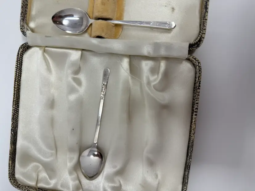 Set of demitasse spoons, APEX electroplated nickel silver. In original snakeskin patterned, satin lined box. Art deco design on each spoon. Spoons are in excellent condition, box is worn but completely functioning. Box 5 x 5.75 x 1” deep Spoons 2.75” long