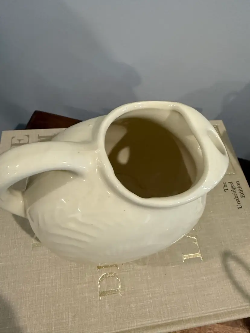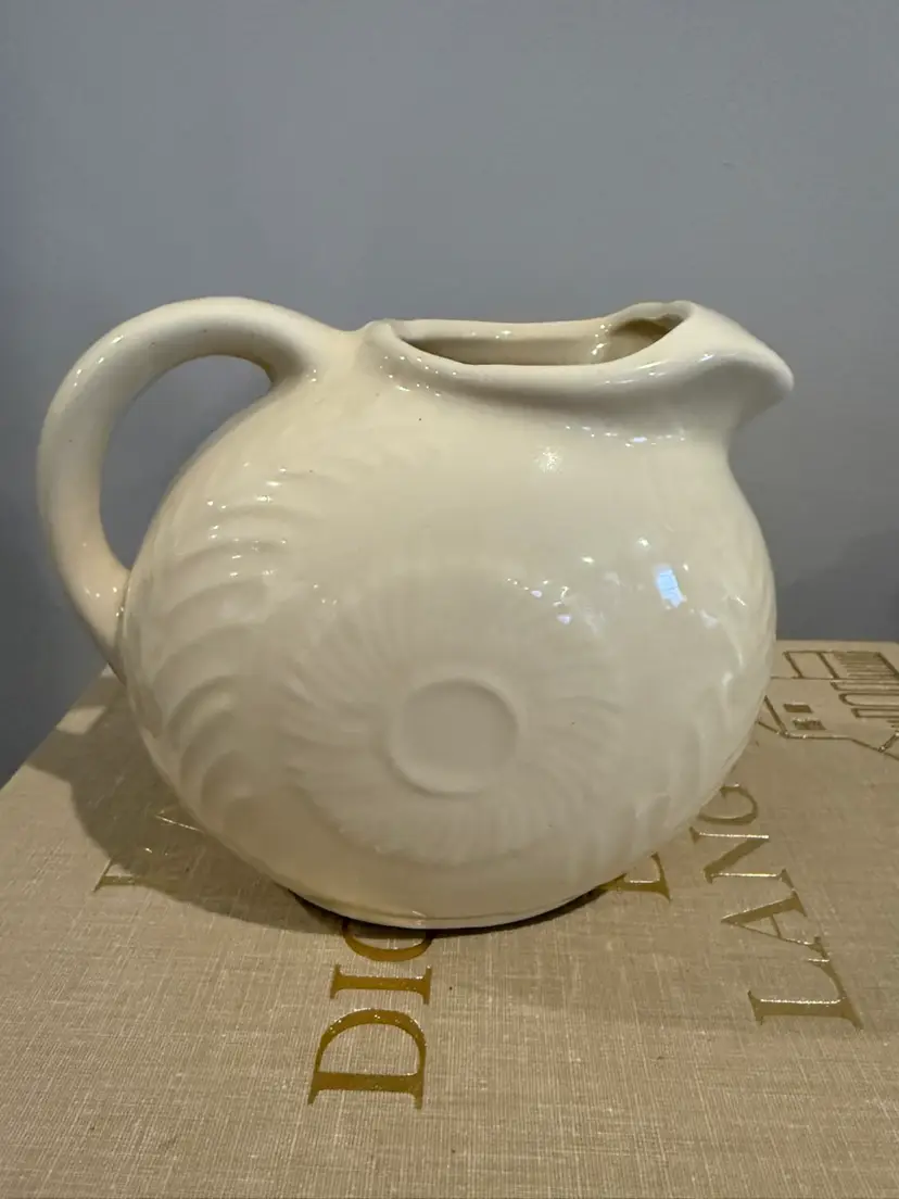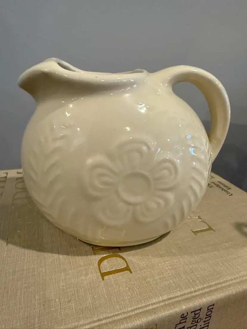 This charming pitcher features an embossed floral and fern motif, finished in a high-gloss off-white glaze. It is a genuine piece of Shawnee Pottery made in the USA, perfect for farmhouse decor, vintage kitchen displays, or as a small milk server.
