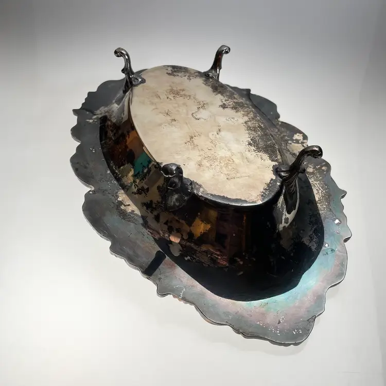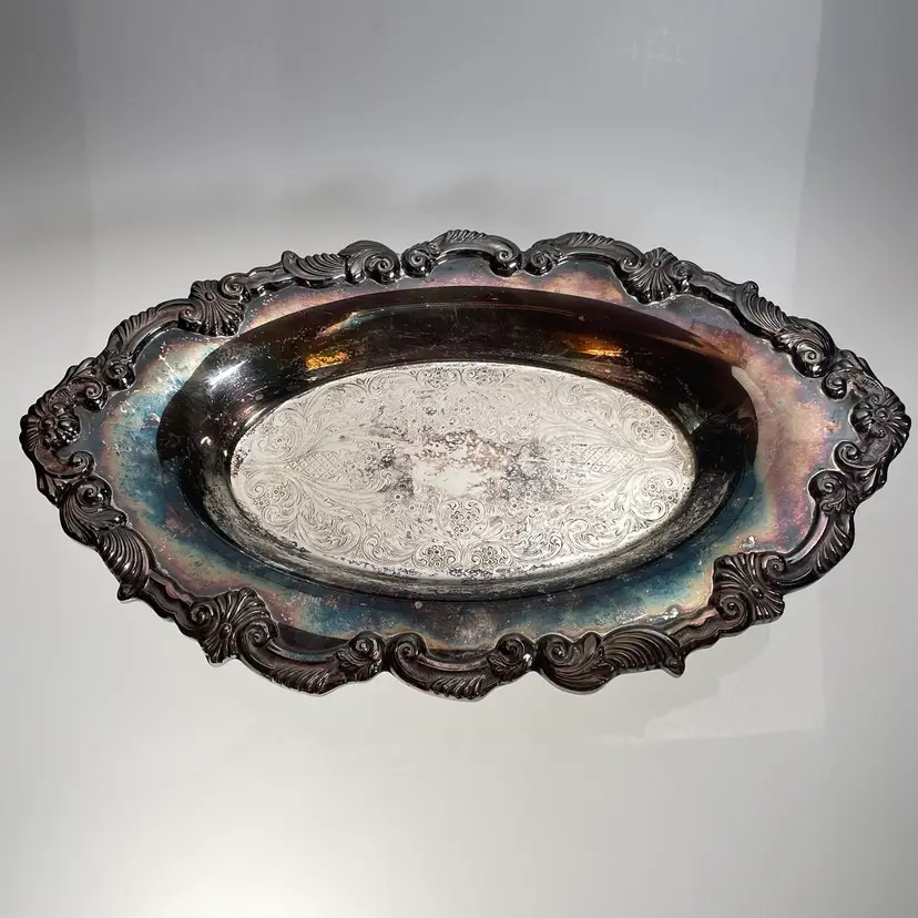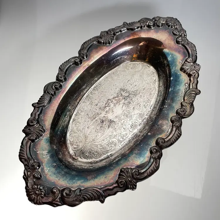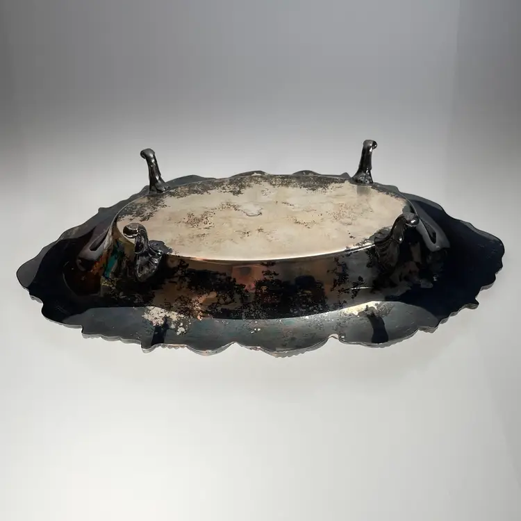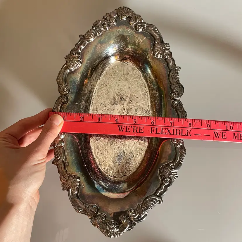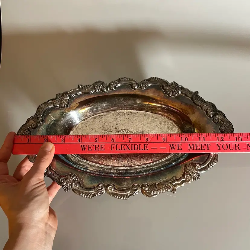 Measurements are approximate: 13 inches long, 8 inches wide (base of platter about 4 in wide x 7.25 in long)