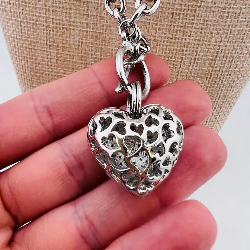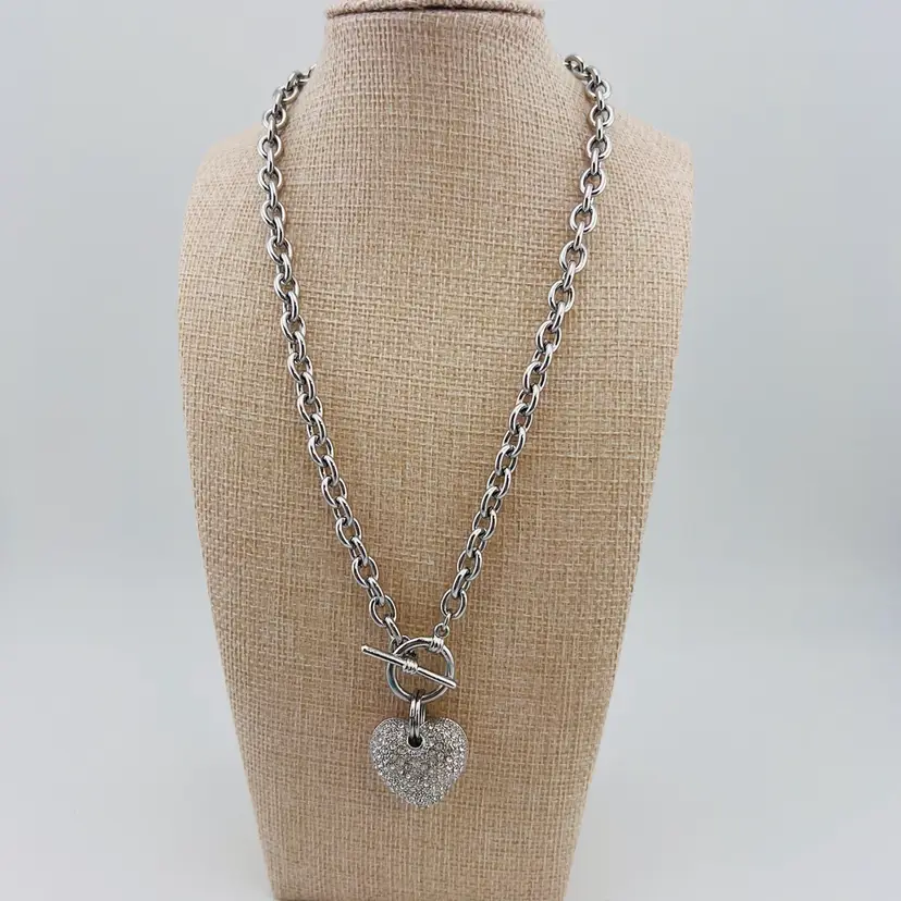 Vintage Silver Tone Puffy Rhinestone Heart Toggle Necklace 10”