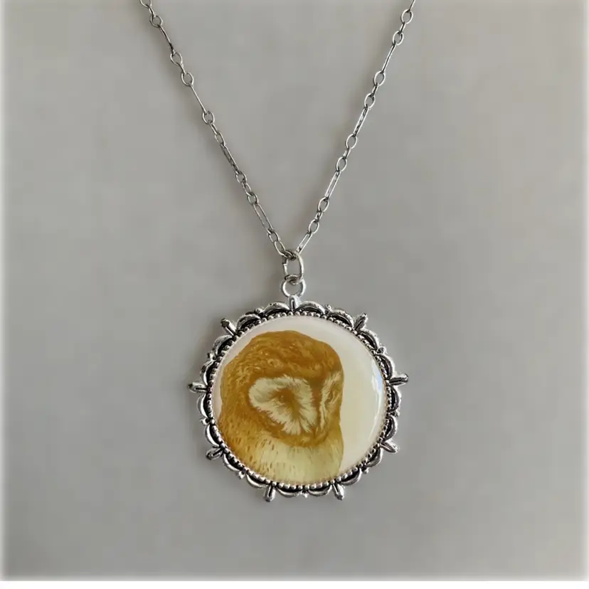 Vintage silver toned barn owl illustration pendant necklace. Pendant measures 1 5/8” x 1 3/4”. The chain measures 24”. This is an upcycled design using vintage jewelry and findings.