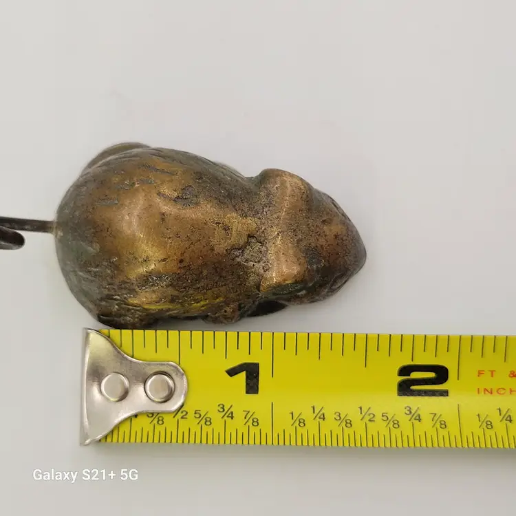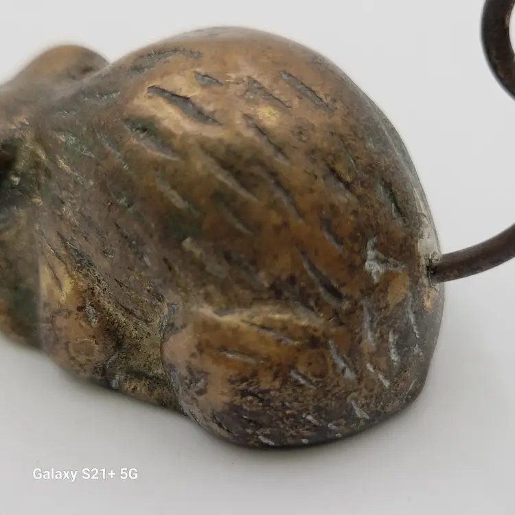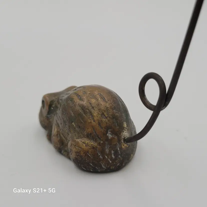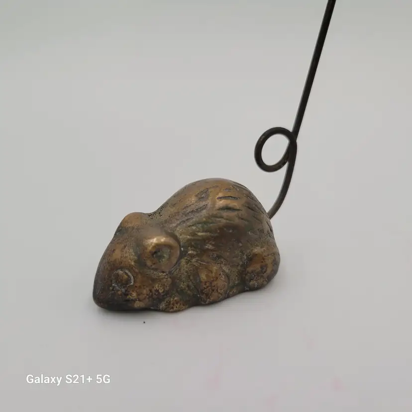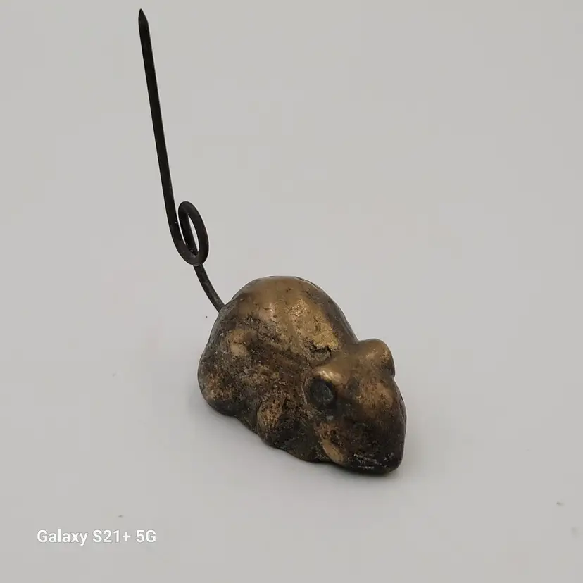 This sweet brass mouse most likely was used as a receipt holder as the tip of his tail is pointed (see photos). It has its original label on the bottom. This little guy measures about 1 1/34 inches long and his tail is about 2 1/4 inches tall. The brass is tarnish and dark in spots. There is a greenish tone in different spots onnthe mouse and lighter accents in some of the details (most likely from a cleaner of some sort).