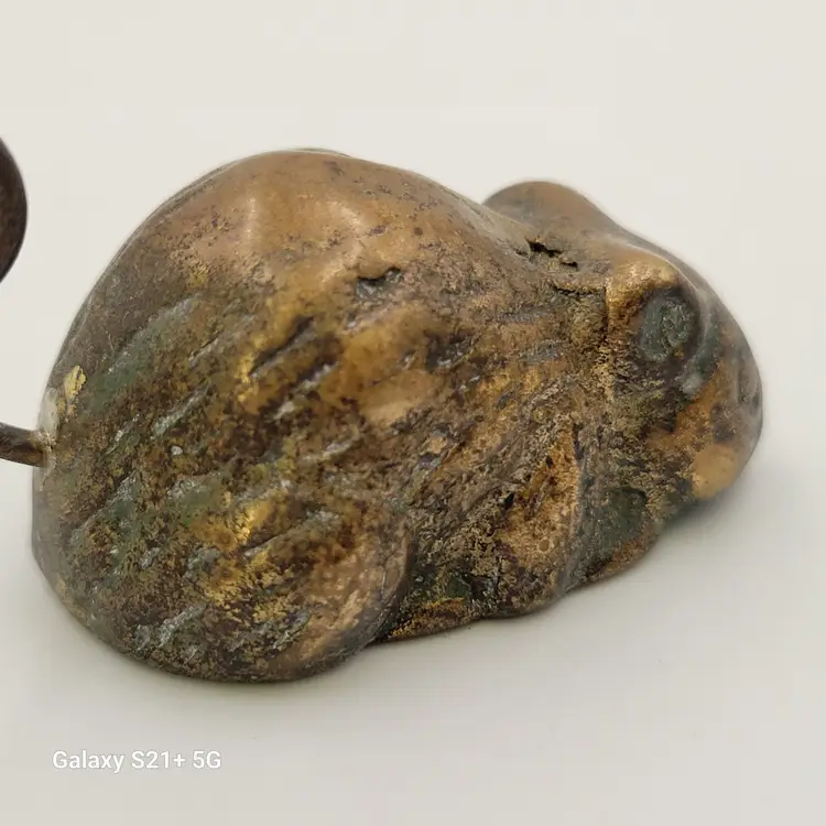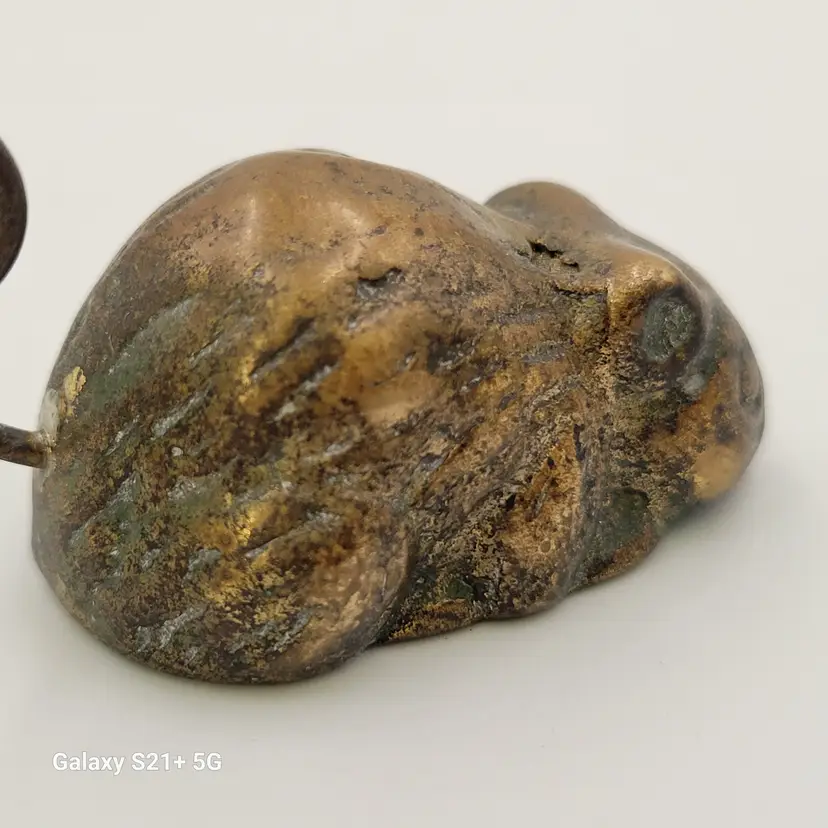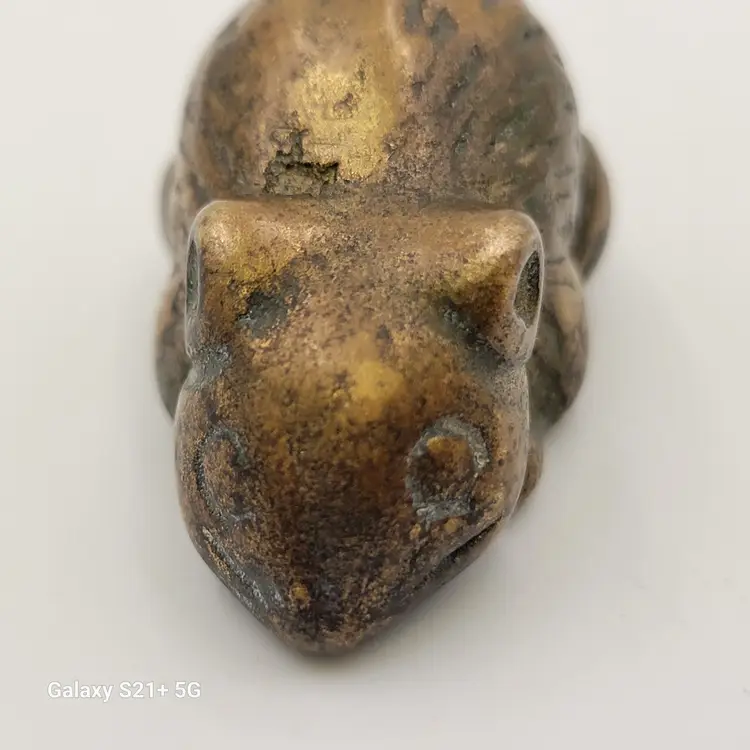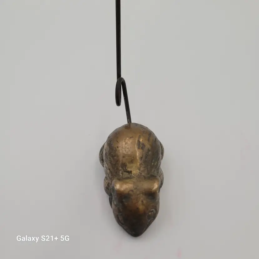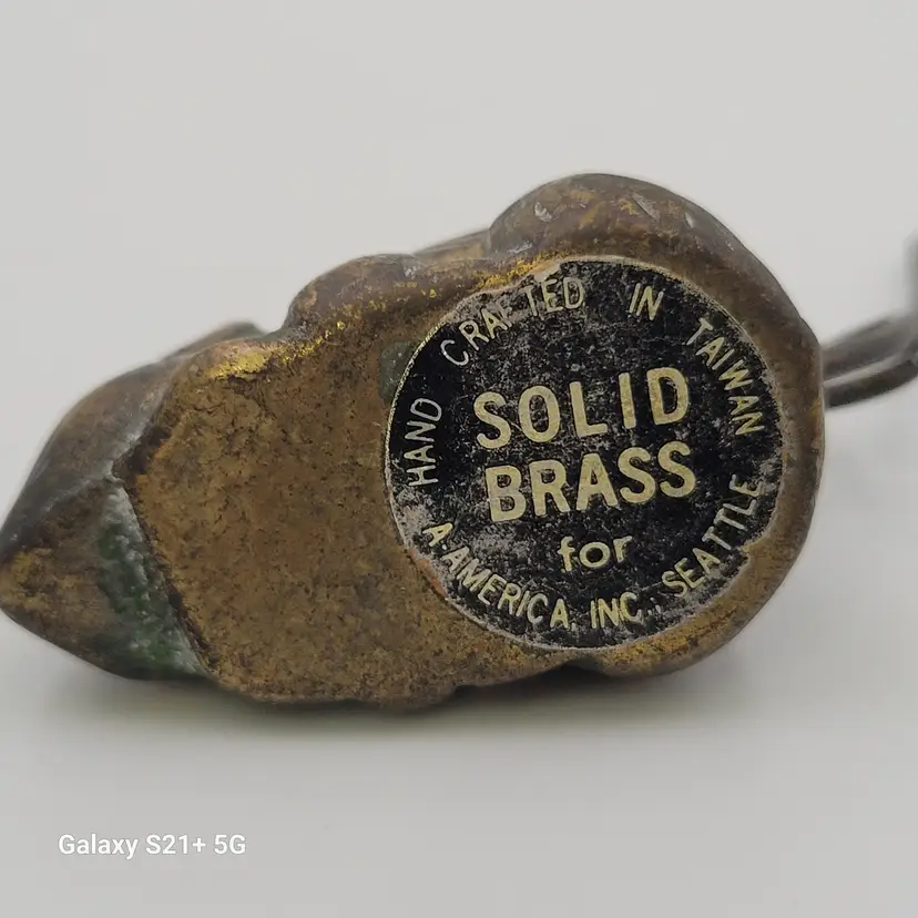 This sweet brass mouse most likely was used as a receipt holder as the tip of his tail is pointed (see photos). It has its original label on the bottom. This little guy measures about 1 1/34 inches long and his tail is about 2 1/4 inches tall. The brass is tarnish and dark in spots. There is a greenish tone in different spots onnthe mouse and lighter accents in some of the details (most likely from a cleaner of some sort).