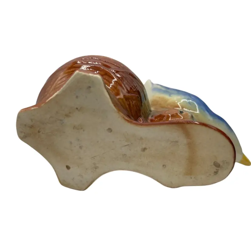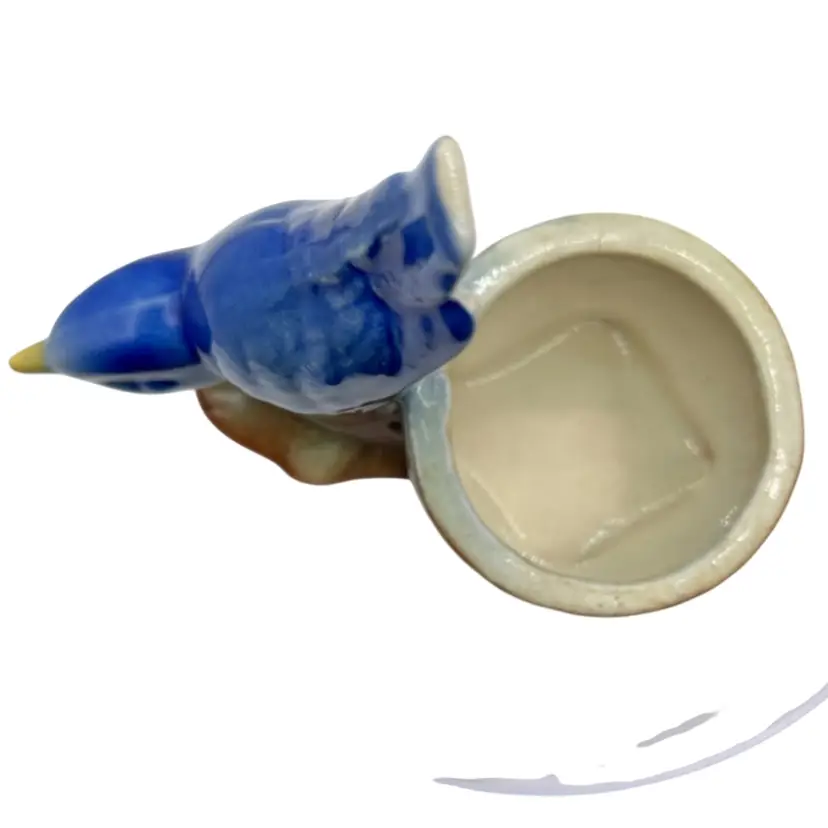 BEAUTIFUL COLORFUL FINCH ON A BASKET HAND PAINTED CERAMIC. PERFECT FOR A SMALL PLANT OR A DESK ORGANIZER FOR PAPER CLIPS OR WHAT NOTS. THERE IS NOT MARK IS SHINY GLAZE INSIDE AND OUT WITH A UNGLAZED BOTTOM. THERE IS SOME CRAZING INSIDE THE BOWL BUT NO CHIPS OR CRACKS. THERE ARE WHAT LOOKS LIKE CRACKS ON THE RIM BUT THEY ARE NOT JUST CRAZE LINES.