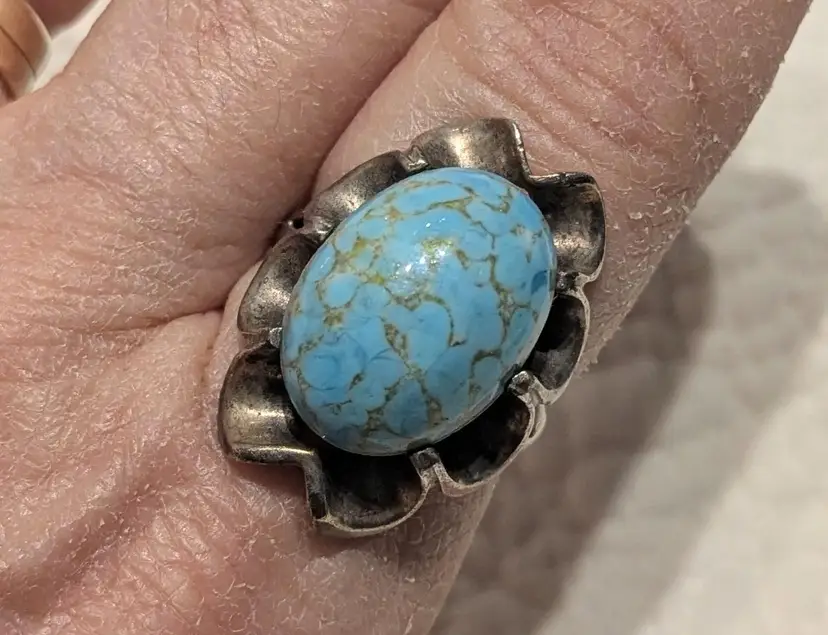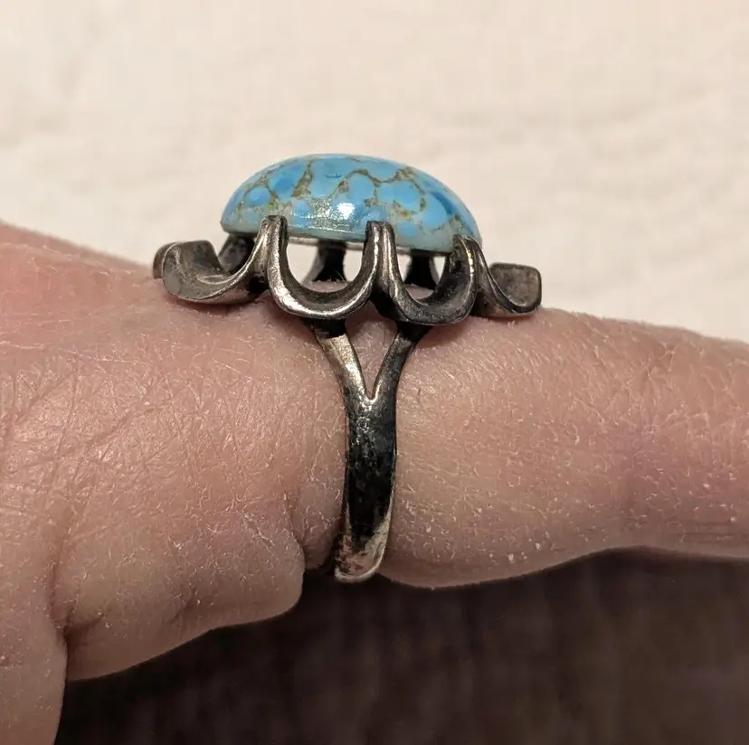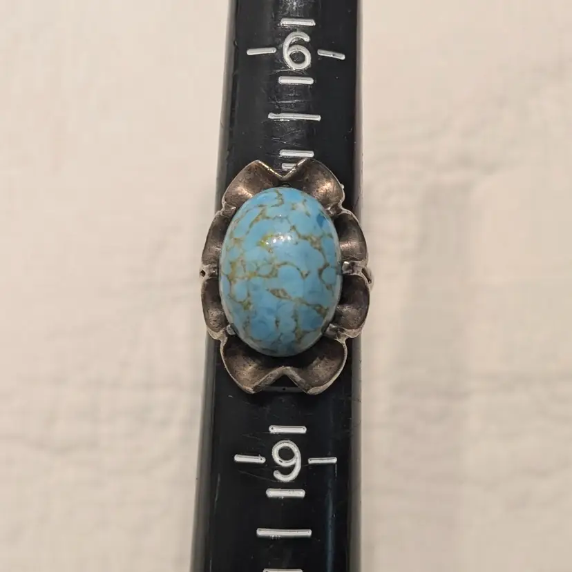 Vintage Sterling Silver Ring with Sky Blue Art Glass Cabachon, Size 7.75