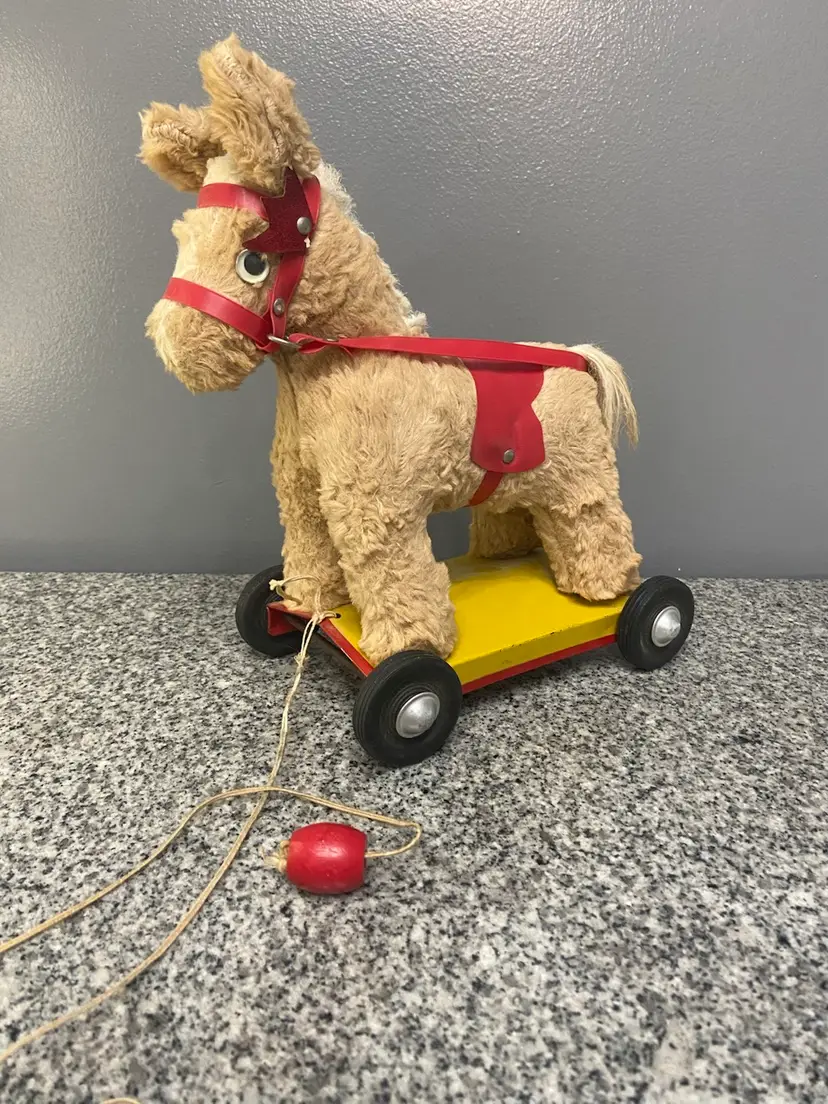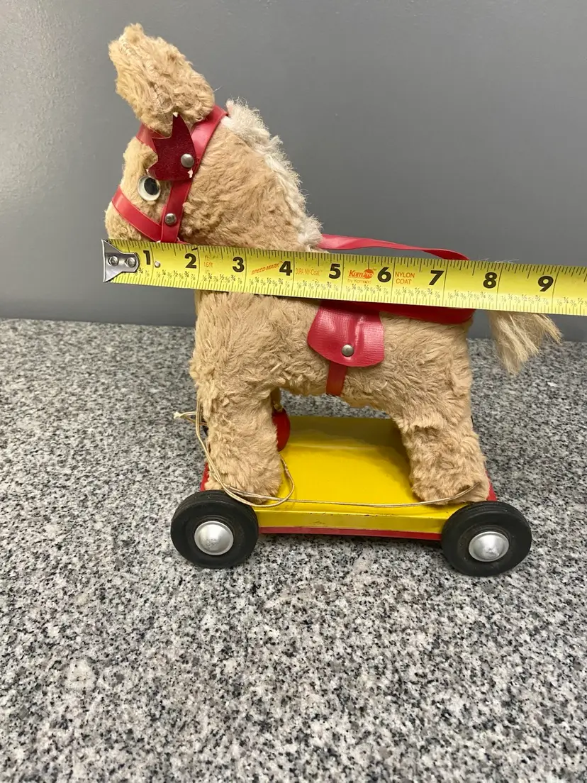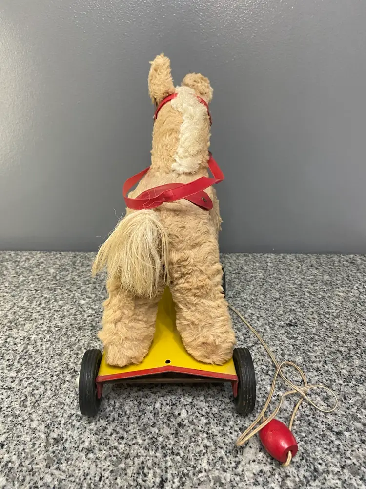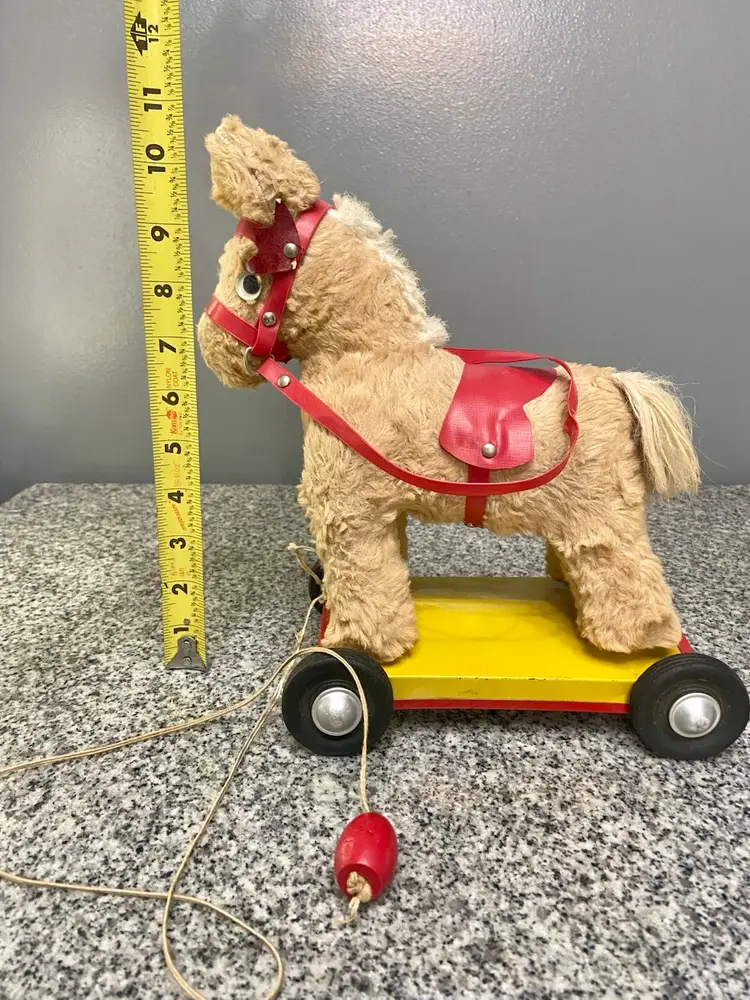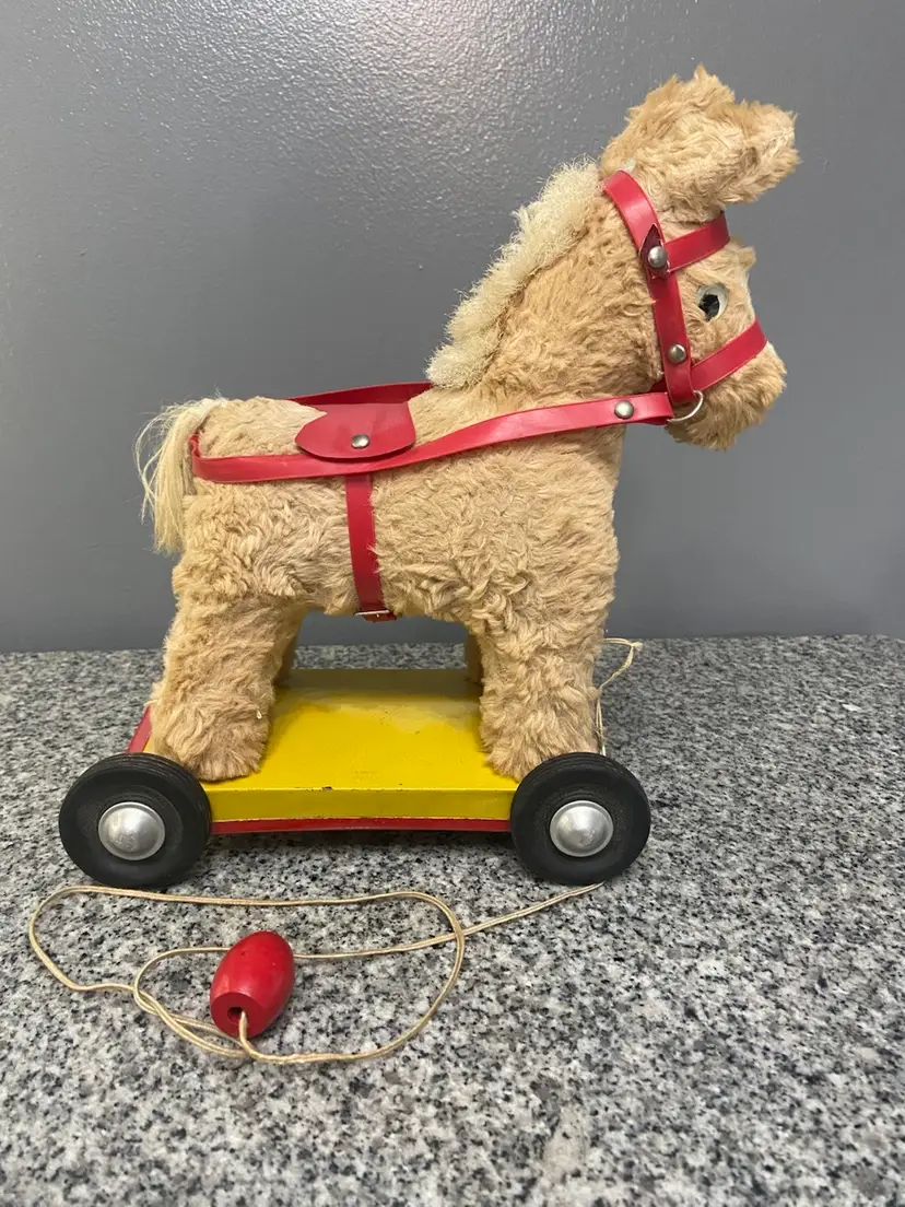 This pull toy with a stuffed horse on top of a metal cart on wheels is a rare find and reminds us of simpler times. Believed to be from the 50-60s. In vintage condition. Some damage to the bridle.