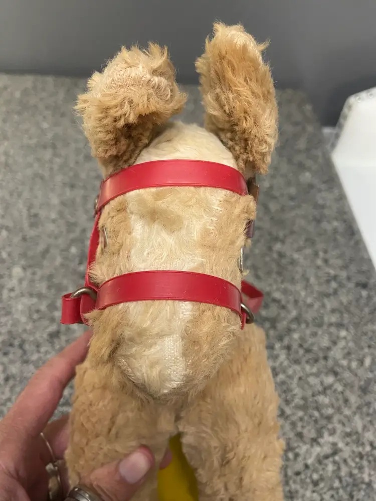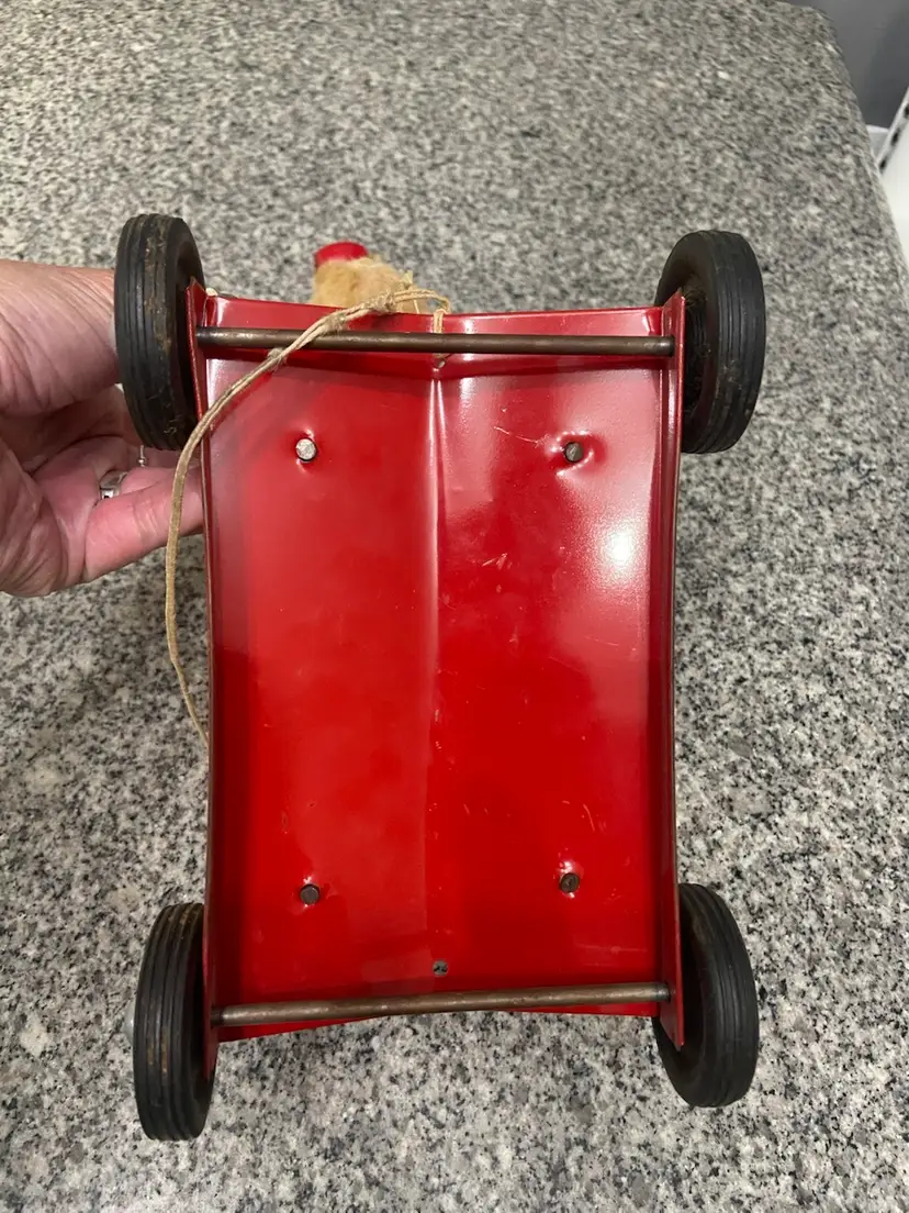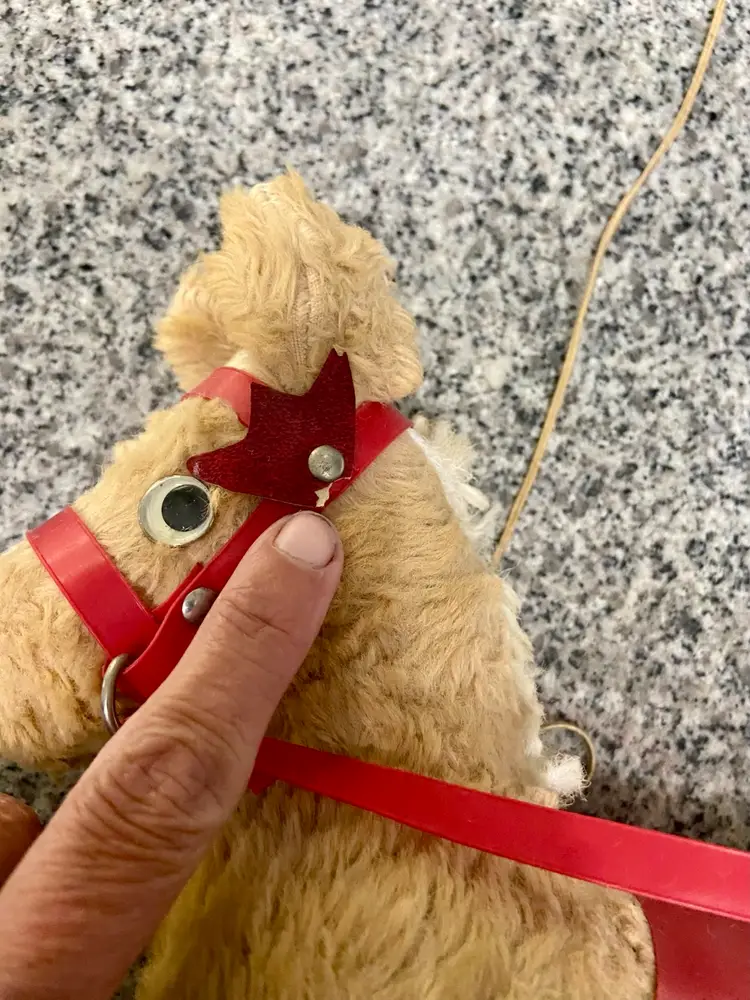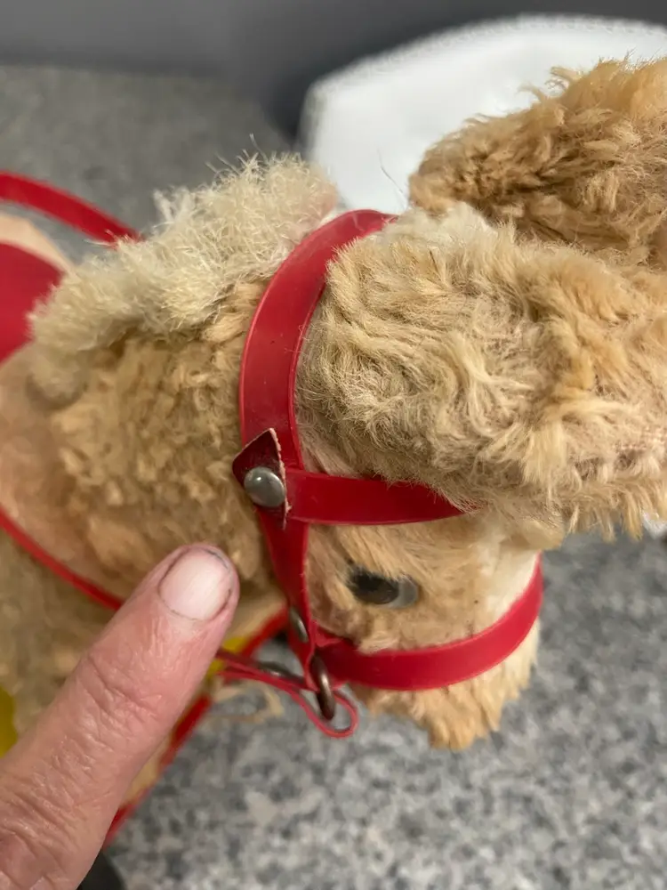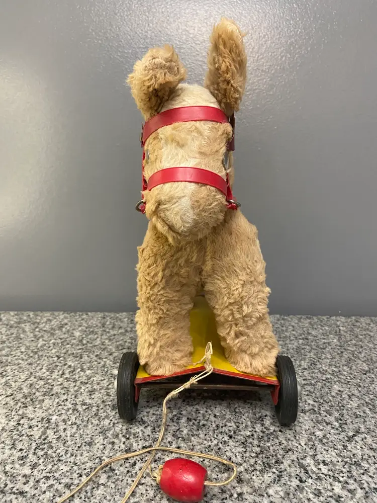 This pull toy with a stuffed horse on top of a metal cart on wheels is a rare find and reminds us of simpler times. Believed to be from the 50-60s. In vintage condition. Some damage to the bridle.