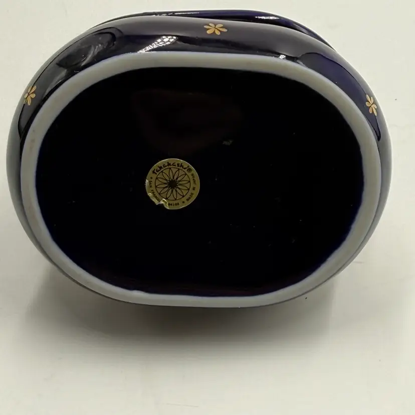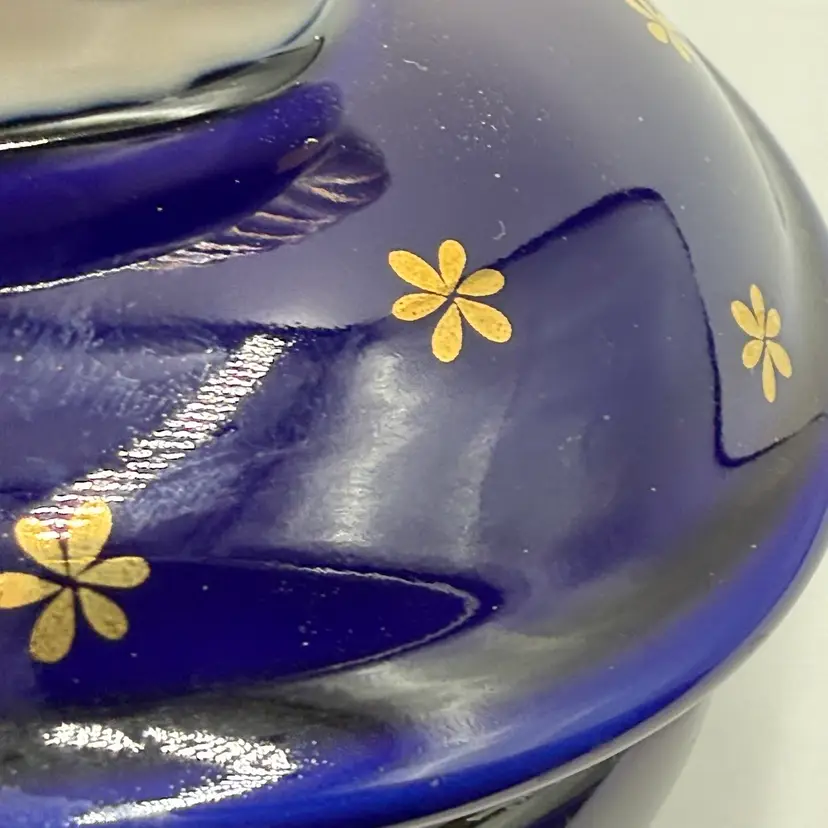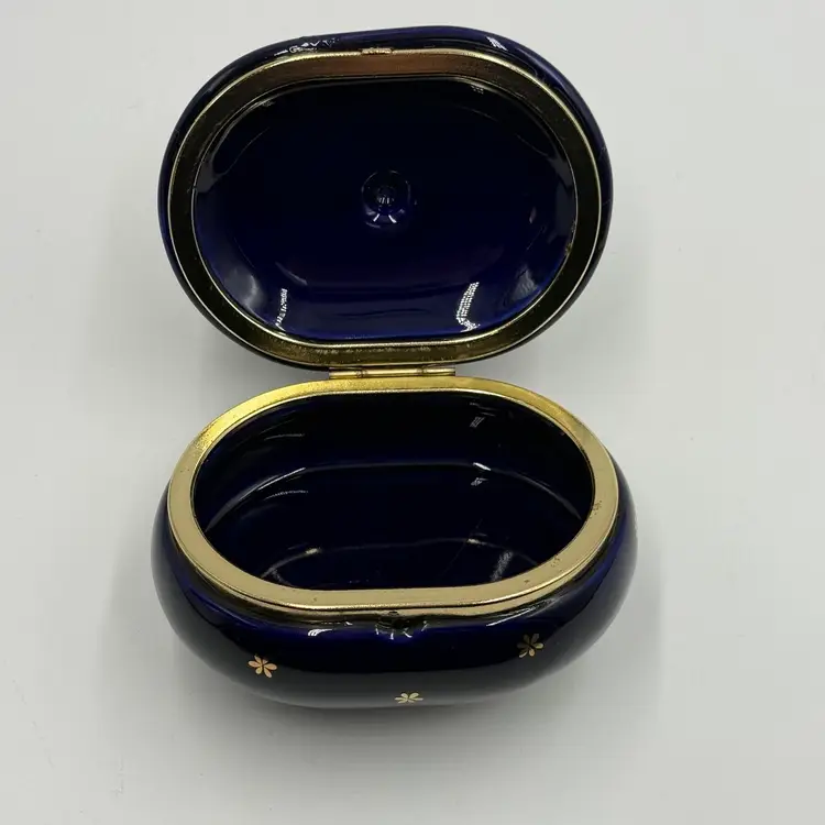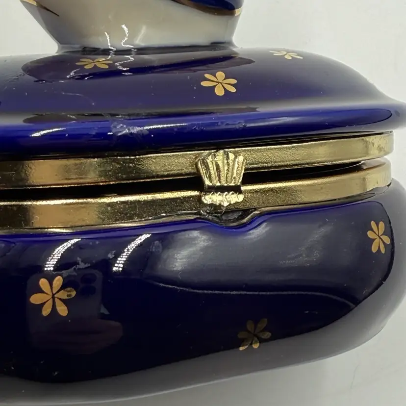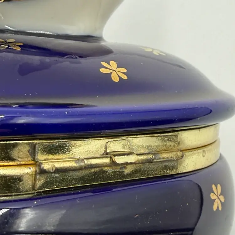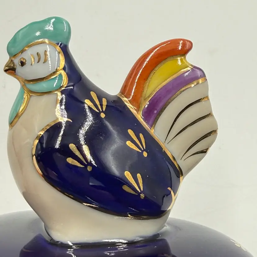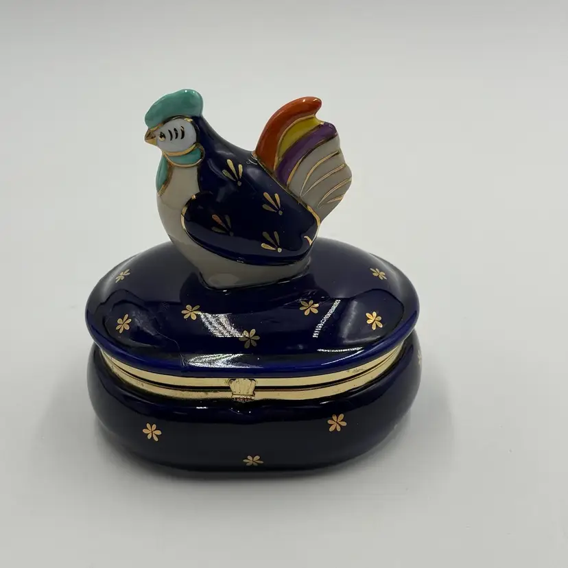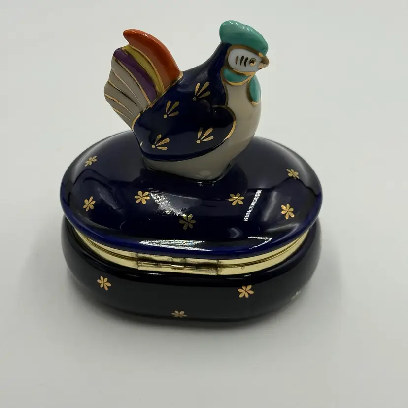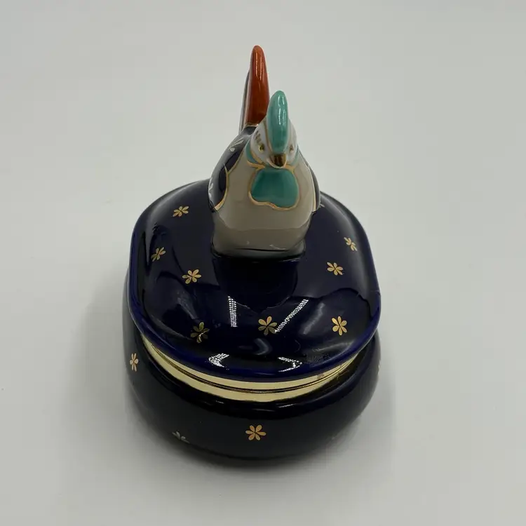 Vintage Takahashi Japan Porcelain Chicken Rooster Jewelry Trinket Box Blue Gold AS IS
