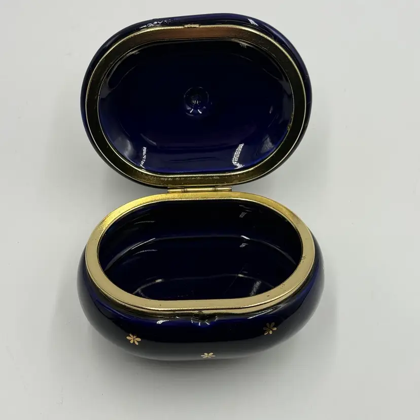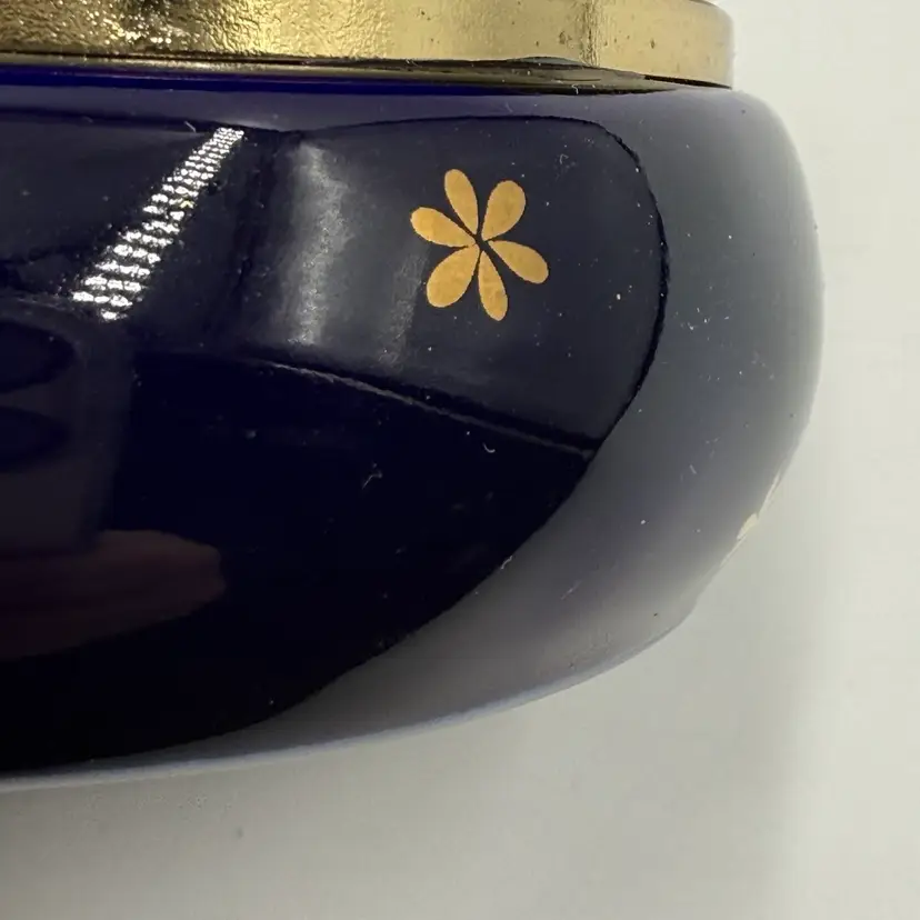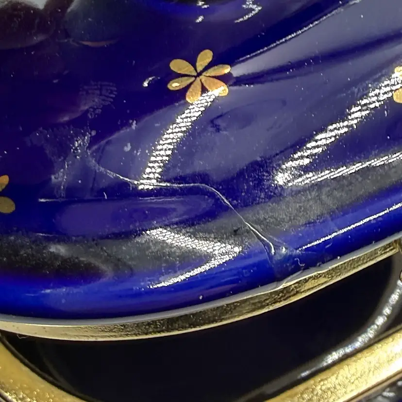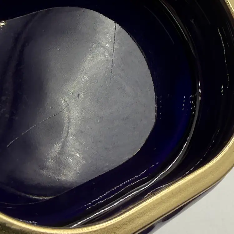 In AS IS condition due to having a crack on the top of the lid and scratching on the inside bottom. Measures 4 3/4 inches tall and the 4 1/2 inches long.