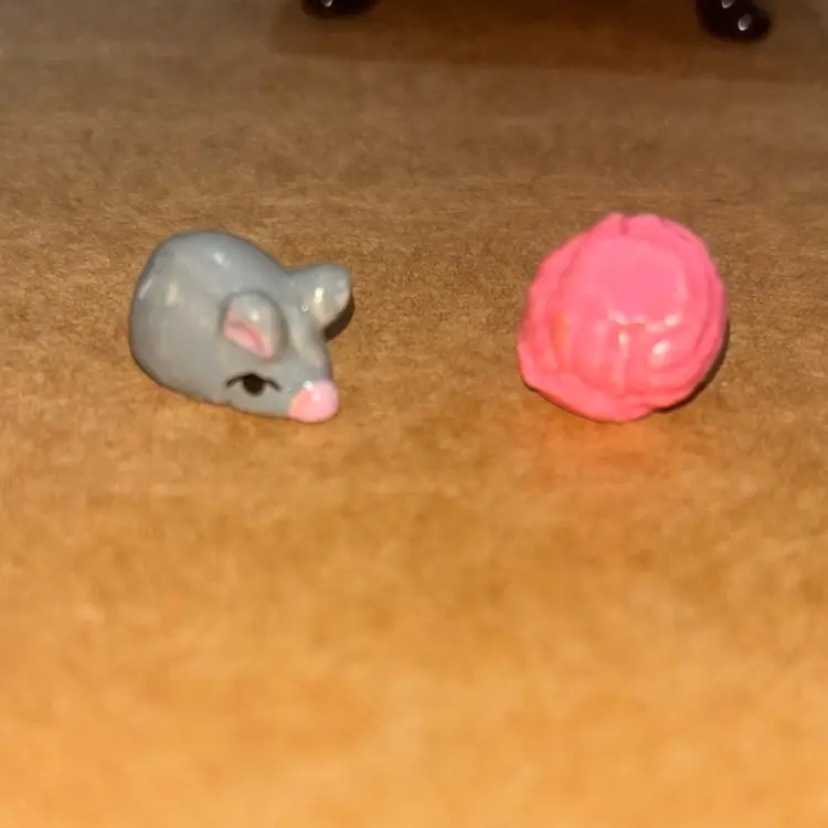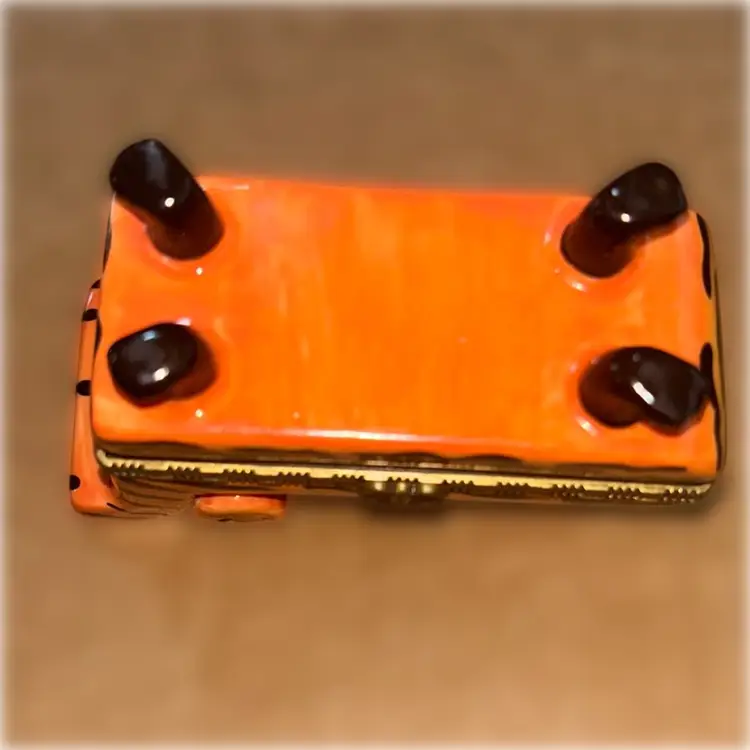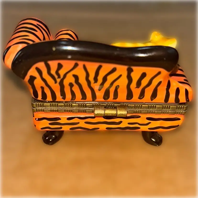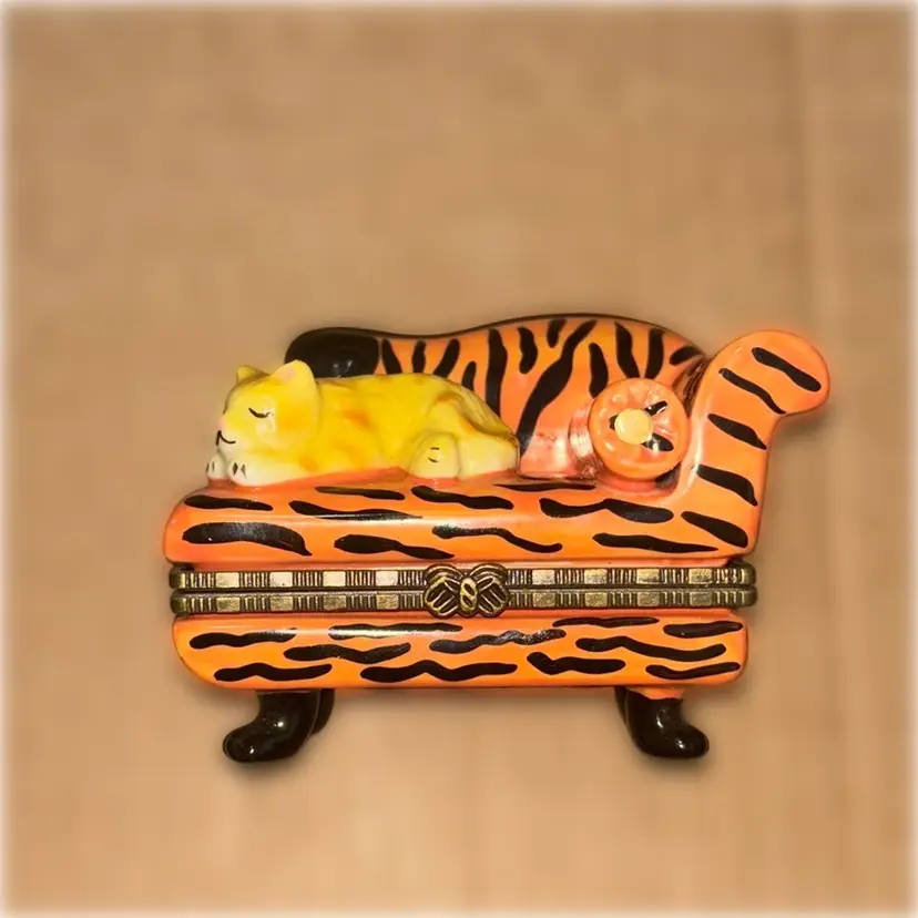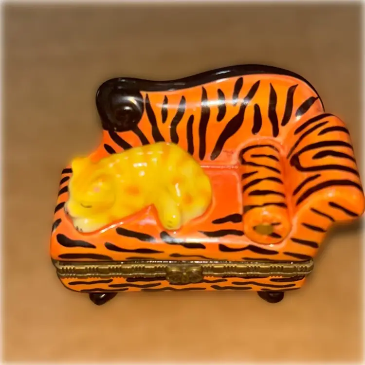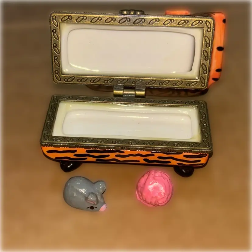 This is a ceramic trinket box with a cat on a sofa and inside a mouse and a ball of yarn