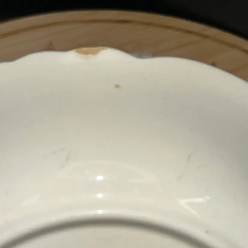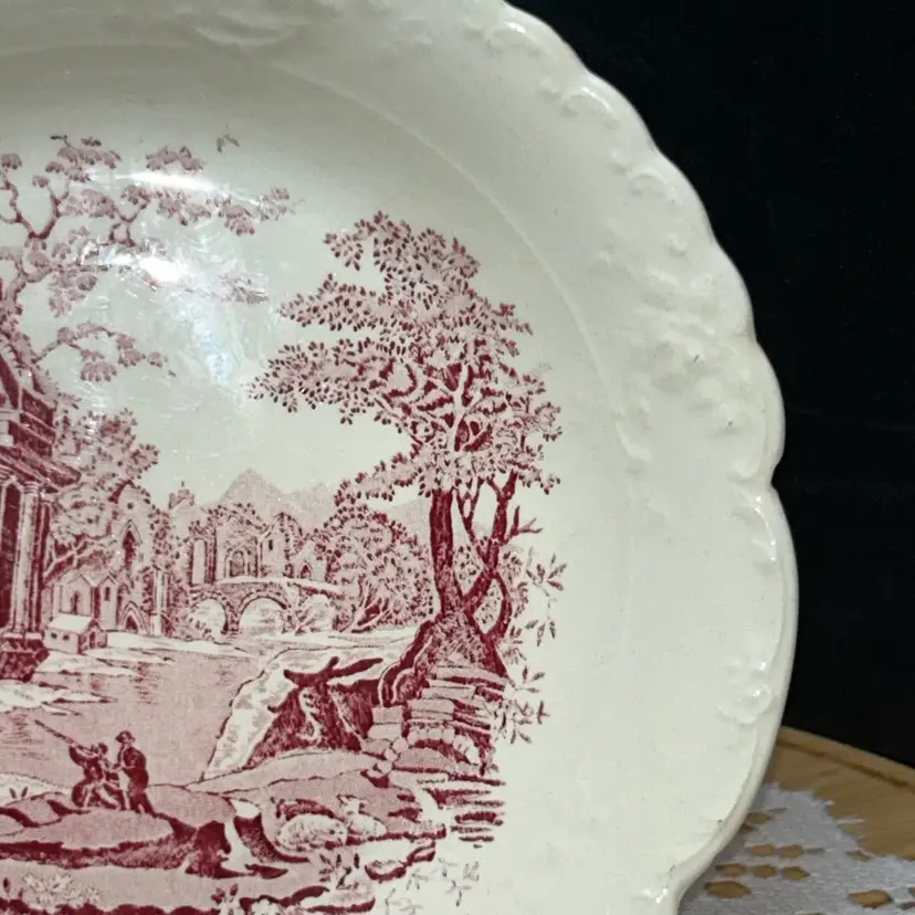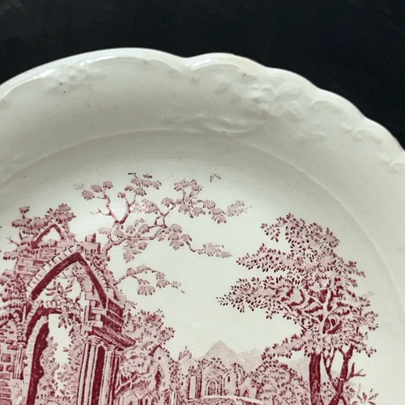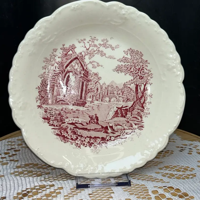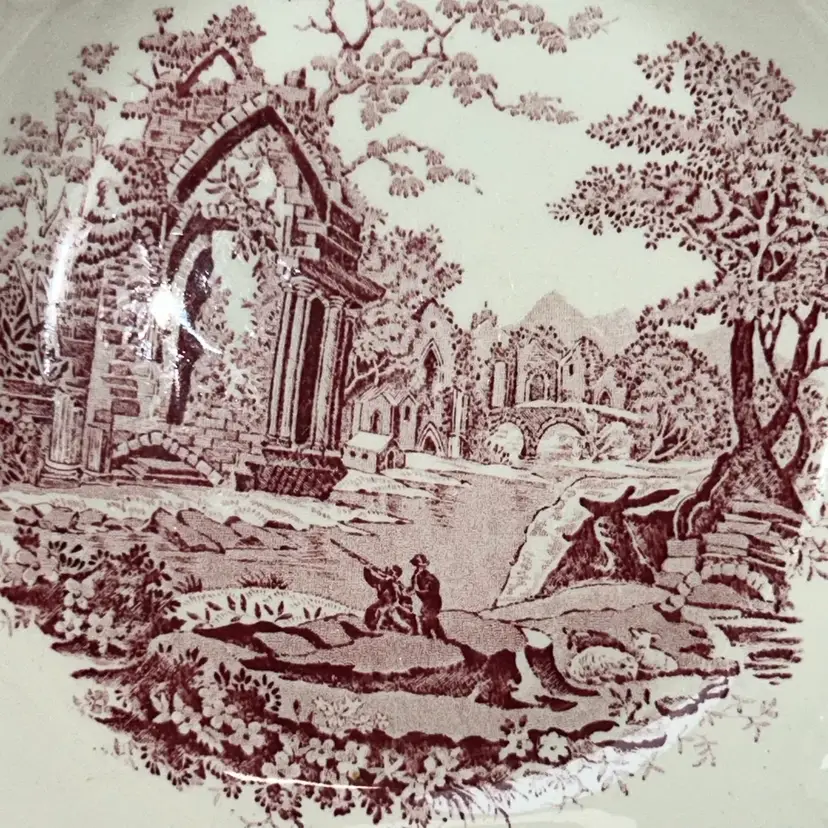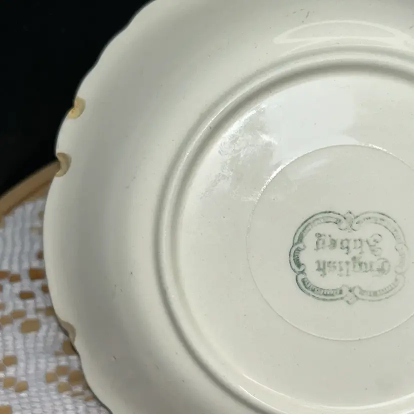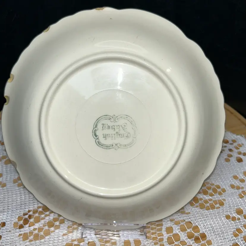 The bowl is 1.5”tall and 7.5” wide. The green “English Abbey” bask stamp is present. Very good condition. There are 3 small chips (old) on the back side of the bowl. Shown in the photos. Transfer color is very good.