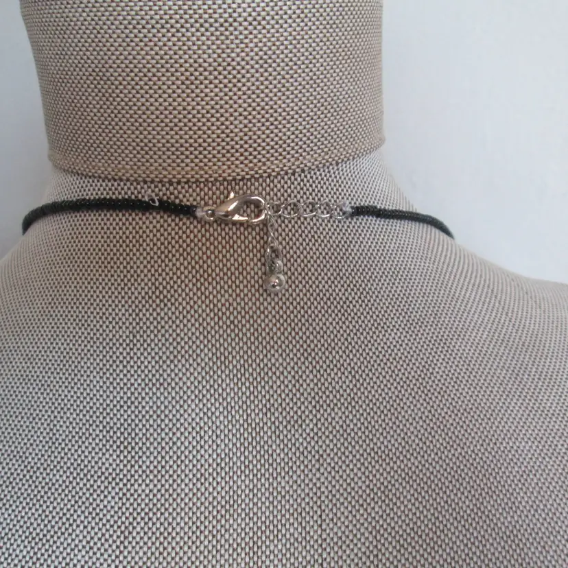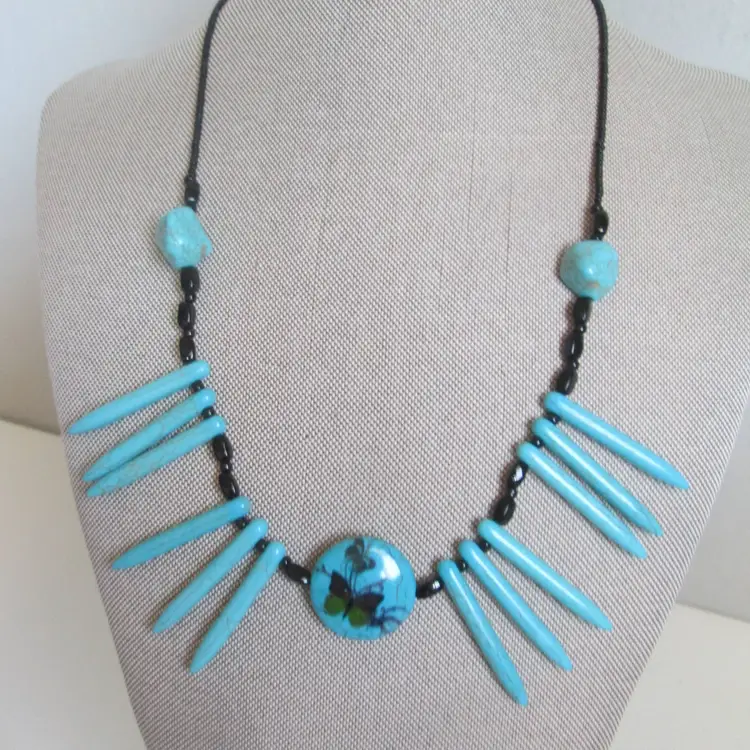 Vintage turquoise dyed Howlite points and black glass beaded necklace with pretty butterfly pendant. Necklace length is 20" to 21" with adjustment. This is an upcycle design created with vintage beads and findings.