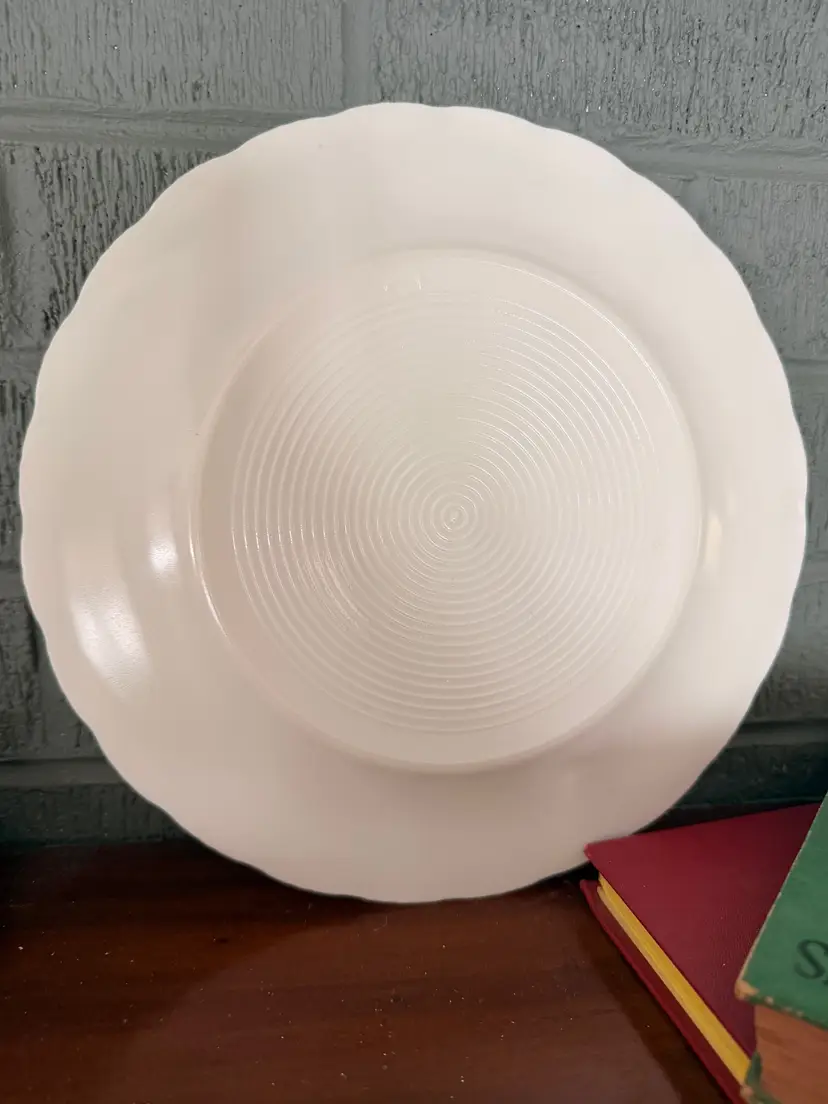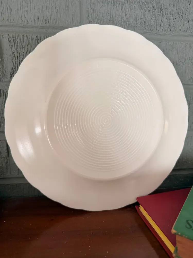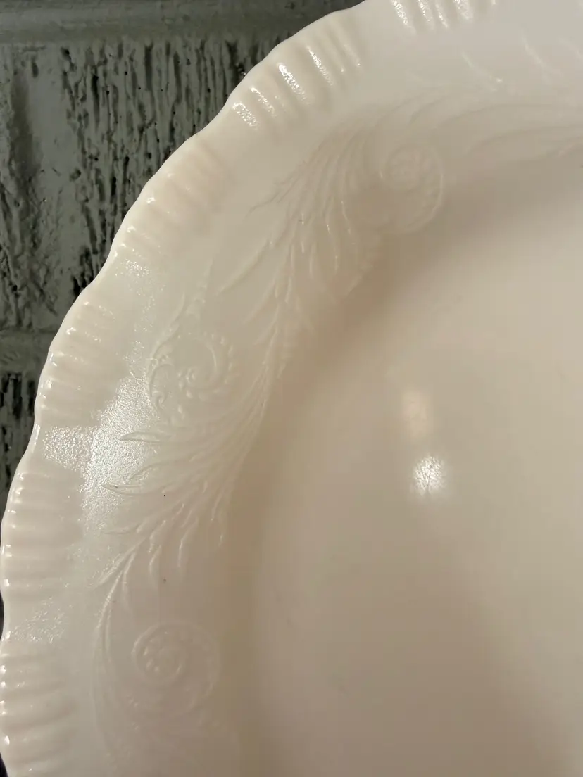 Beautiful vintage uranium milk glass dinner plate with a softly scalloped rim and elegant embossed scroll detailing. This plate measures approximately 9.5 inches in diameter and features a classic opaque white milk glass body.