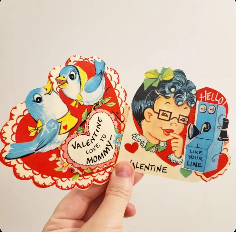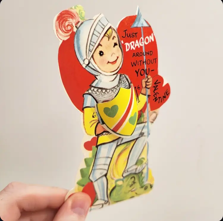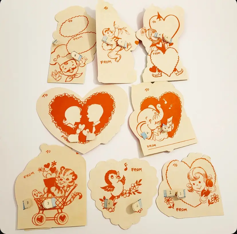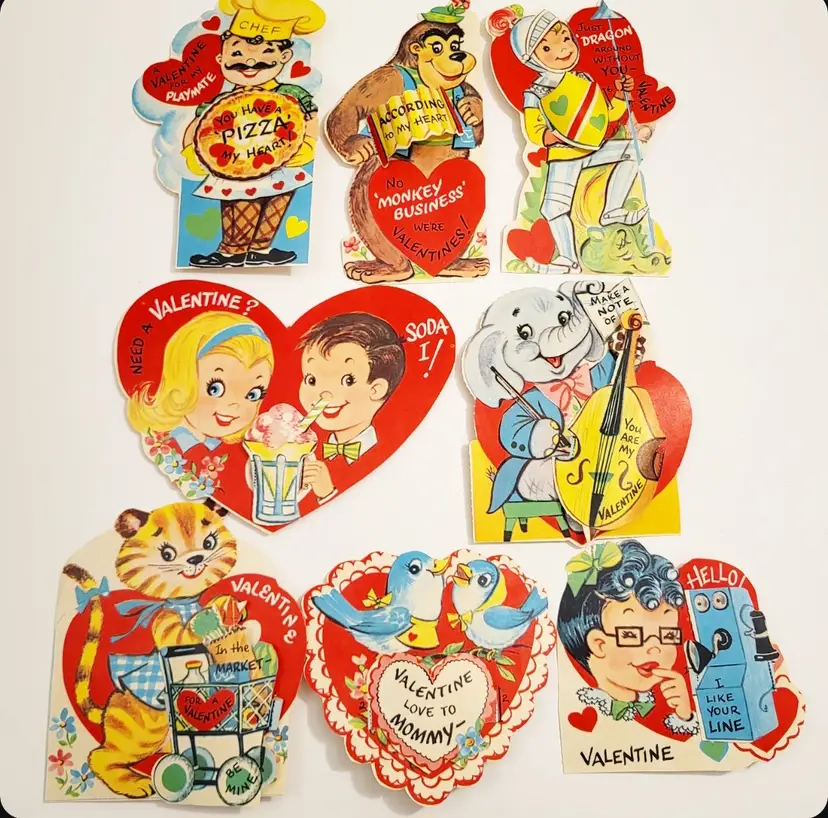 Vintage Valentines card lot of 8 cards that have 3D elements. All cards are unused/not signed. Each card has a 3D element tab that goes through the front of the cards and folds at the back. Scroll through all photos for details! Knight- 5.5 in x 3.5 in Chef- 6 in x 3.5 in Elephant- 4.5 in x 3.75 in Tiger- 4.5 in x 4 in Gorilla- 4.75 in x 2.75 in Phone Lady- 3.5 in x 3.75 in Soda Kids- 6 in x 4.5 in Blue Birds- 4 in x 4 in