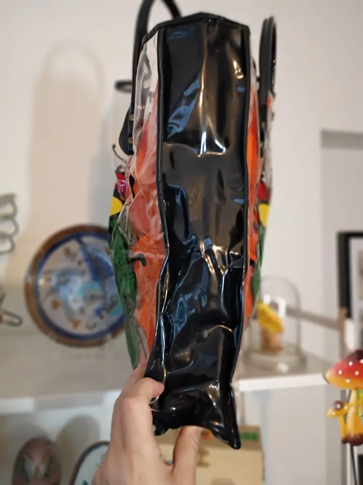 It's a fantastic vintage clear and black vinyl bag with a green ladybug, perfect for the beach or shopping. It measures approximately 14 in tall, 12 in long, and 4 in deep. It's in great condition.
