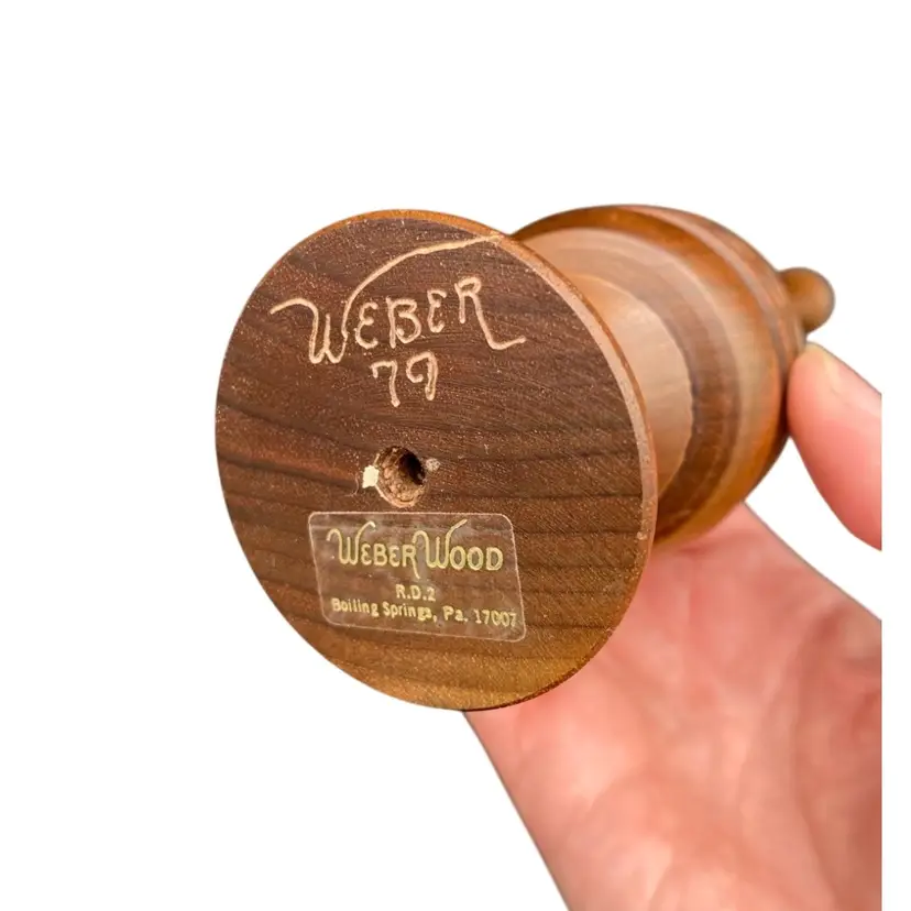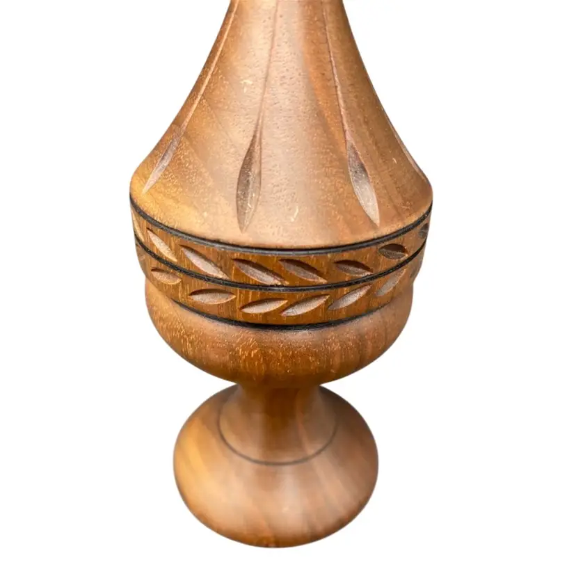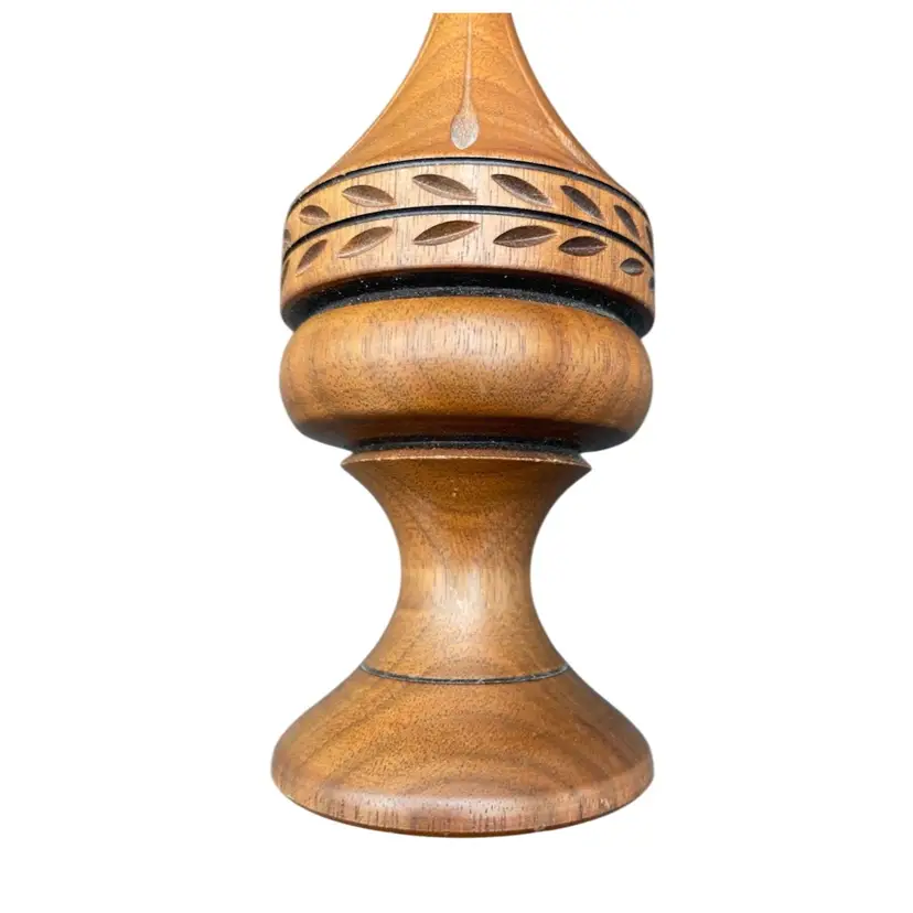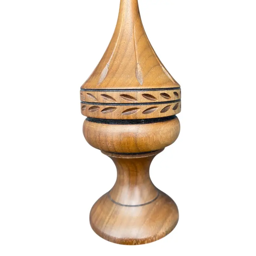 This vintage Weber Wood candle holder or finial is a beautiful addition to any collection. Hand crafted by Jay Weber in 1979, this holder stands at 8.5 inches tall and is made of natural finished wood. (I believe the wood is Maple.) The intricate design reflects the abilities of a true craftsman and is a perfect fit for all occasions. The candle holder/finial is lightweight at 2.8 ounces and has a width of 2.5 inches. This piece is a true collectible and a perfect gift.