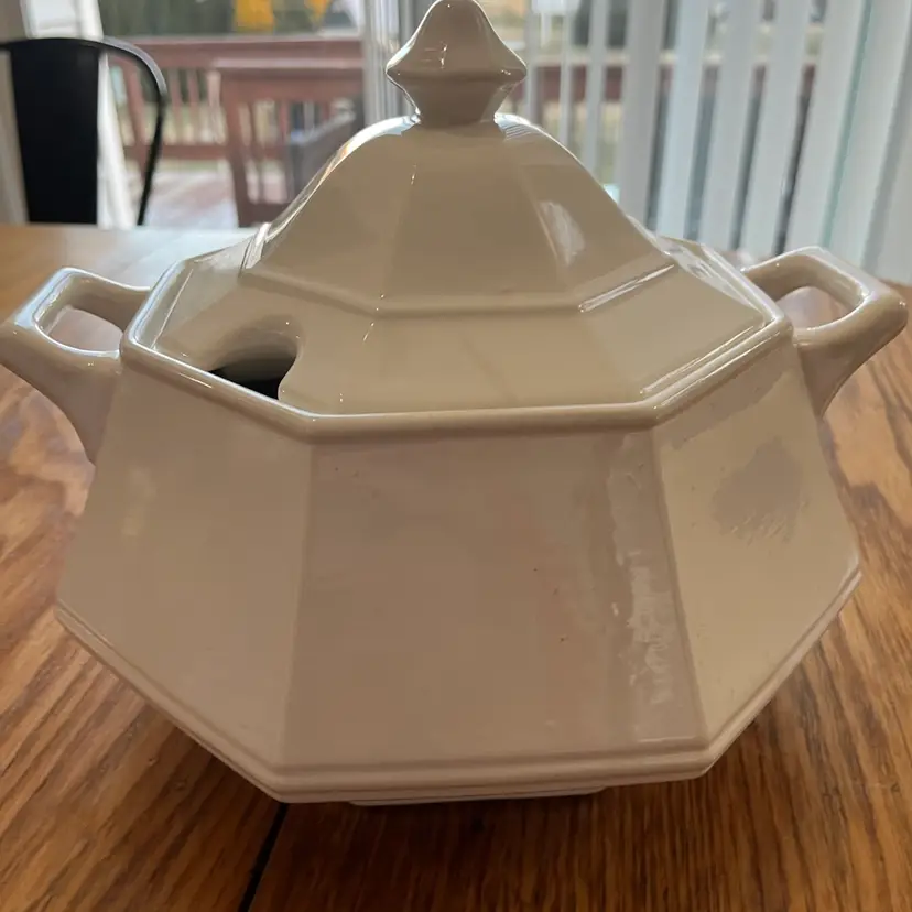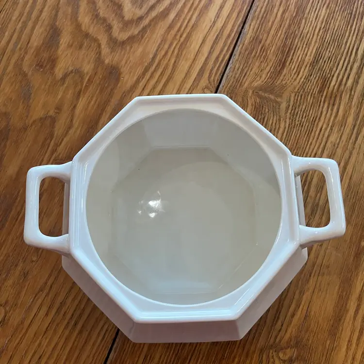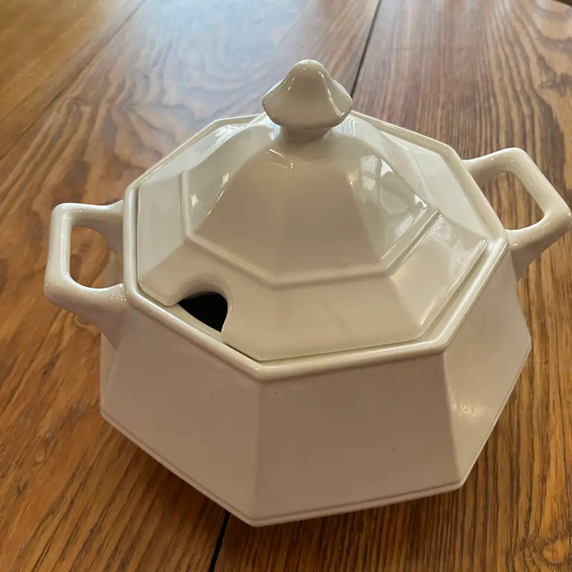 Ceramic tureens, particularly those made in Italy, have a rich tradition of craftsmanship. This particular tureen, with its octagonal form and functional design, likely dates from the mid-20th century, a period when such pieces were popular for both everyday use and special occasions.