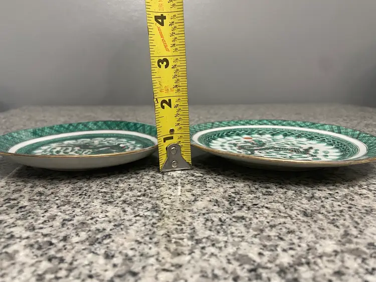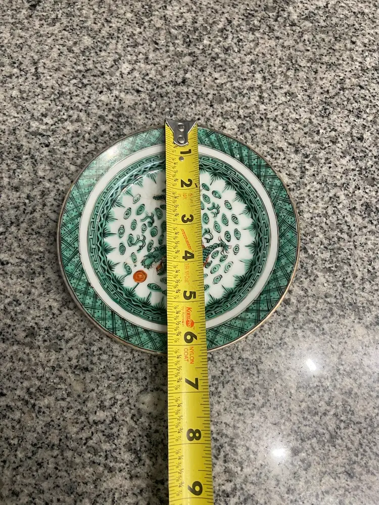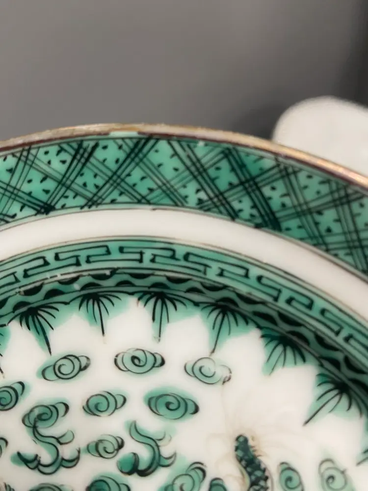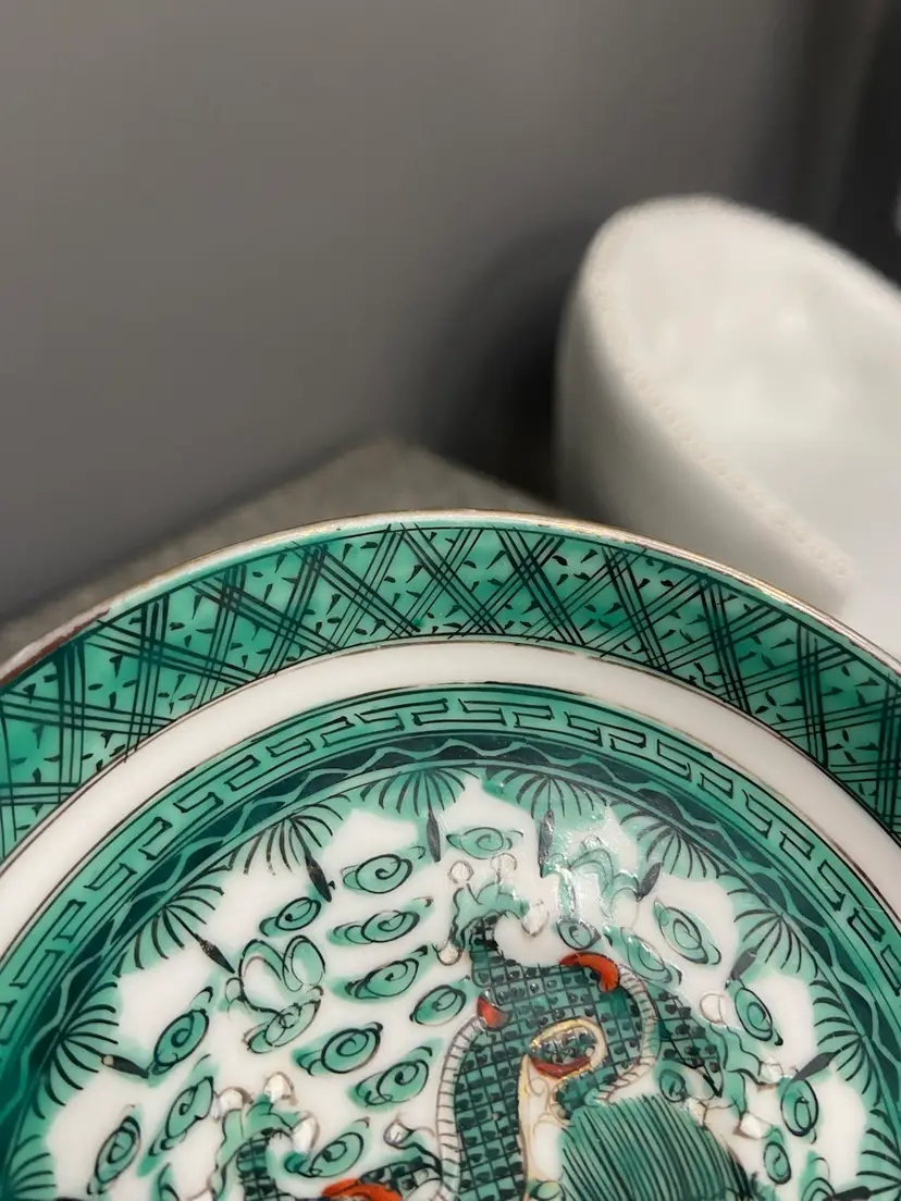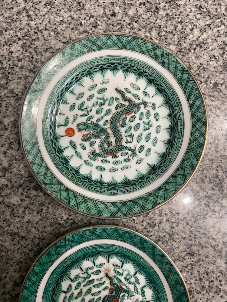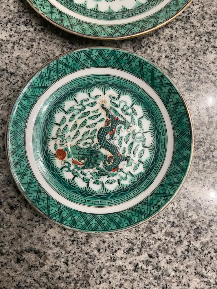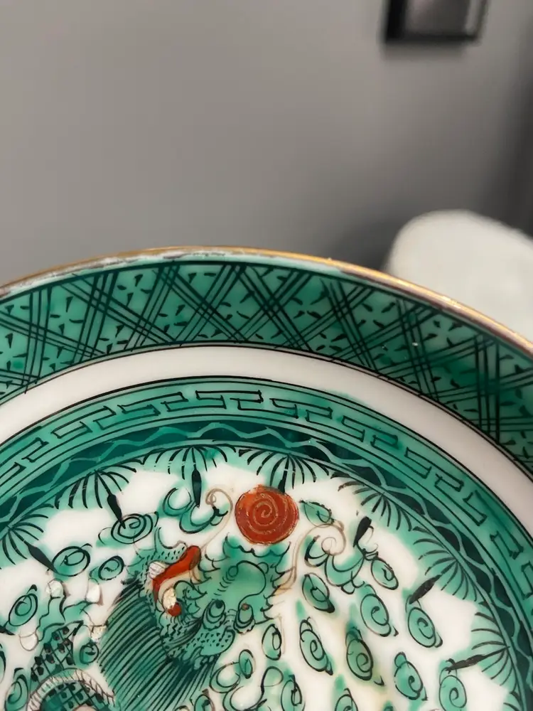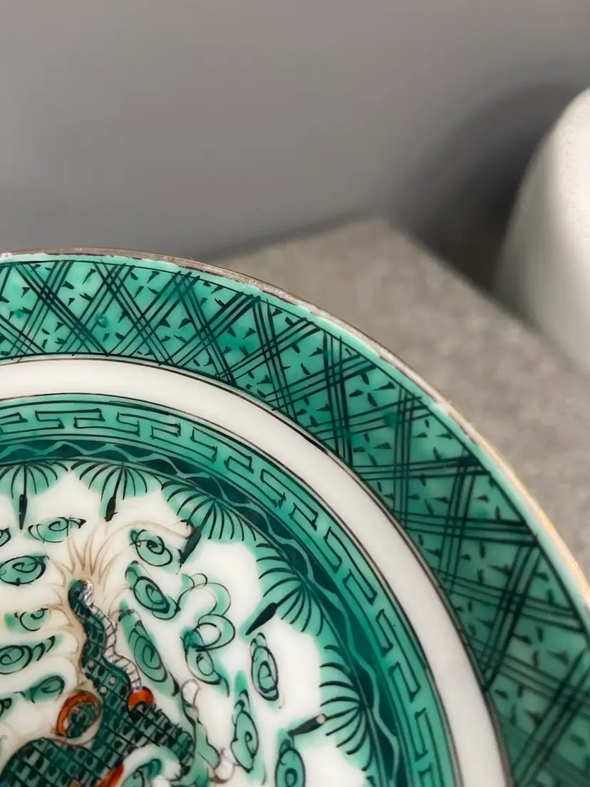 Vintage porcelain plate featuring a green dragon design with gold trim, originating from Hong Kong in the 1950s-1970s. This piece embodies the rich cultural heritage and craftsmanship of Chinese art from that era, making it a unique and collectible item for those interested in Asian decor and vintage pieces. The green dragon motif and intricate gold detailing add a touch of elegance and charm to any space, showcasing the beauty and tradition of Chinese culture.