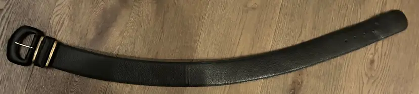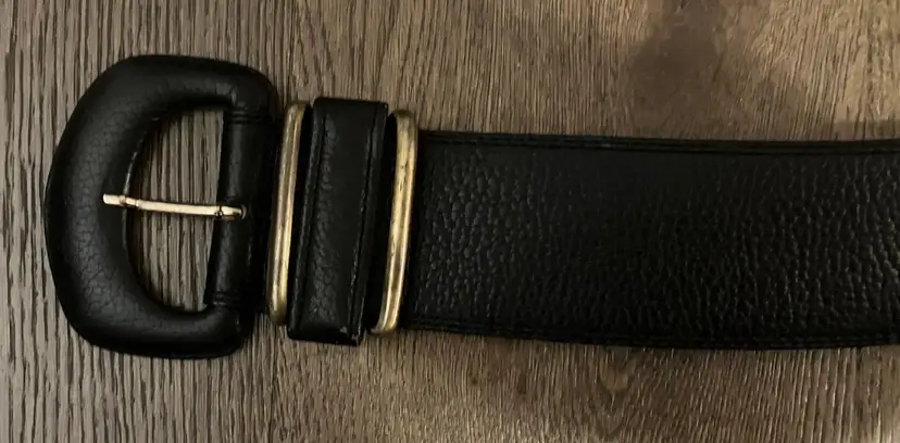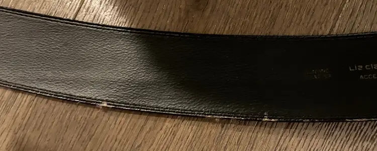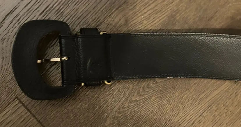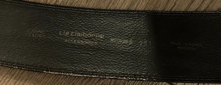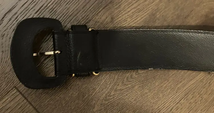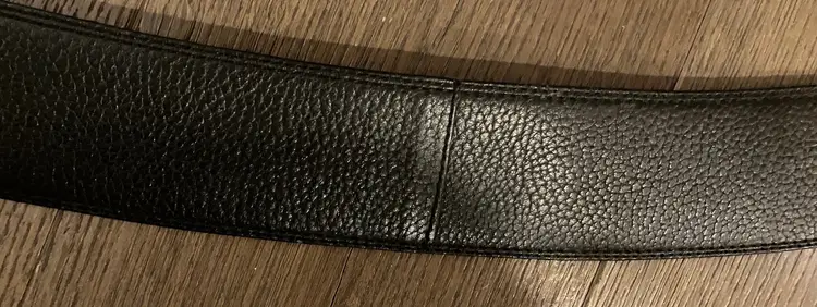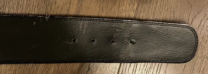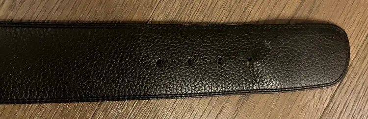 Brass Loops and Covered buckle. Dimensions: 36" long without the buckle and 38 1/4" long including the buckle, 2 1/4" wide. Wear on the edges and one of the holes.