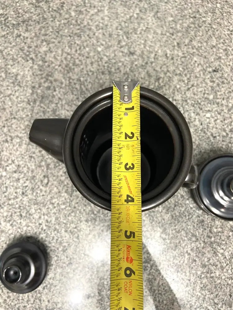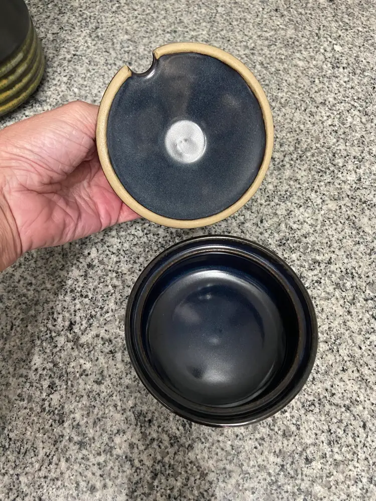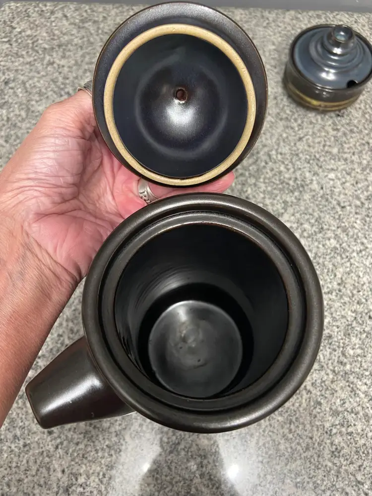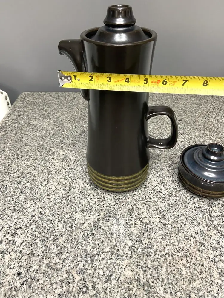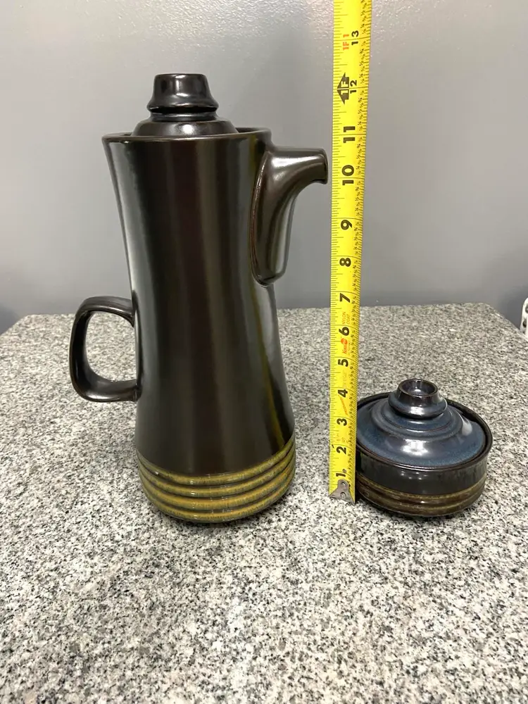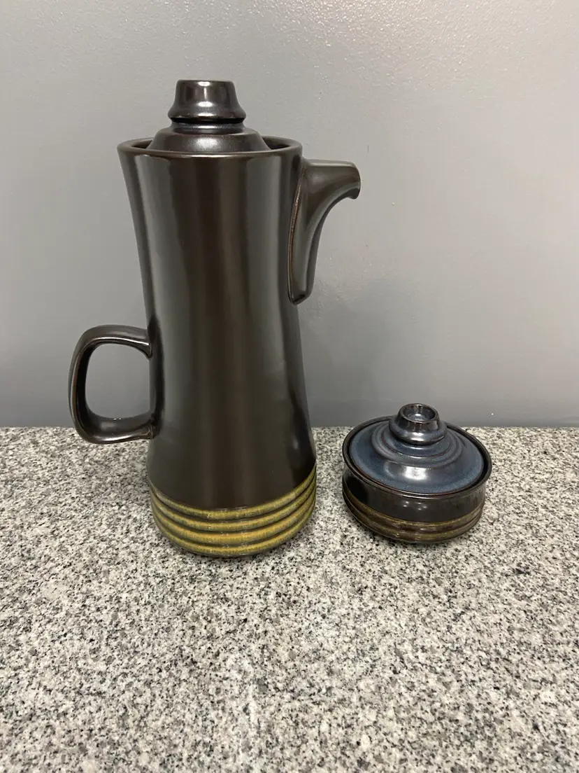 This vintage Denby Kismet Bokhara coffee pot and sugar bowl set from the 1960s in England exudes a mid-century modern style with a deep brown color with underlying blue hues. Handmade with a lead-free glaze, this limited edition set features a round shape and comes with a handle & knobs on the lids, for easy use. The set is a perfect addition to any retro-loving collector's kitchen, adding a touch of nostalgia to tea and coffee serving.