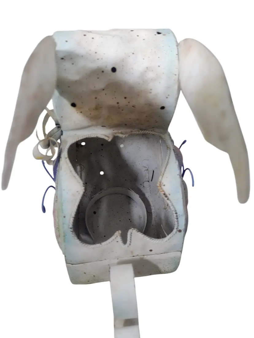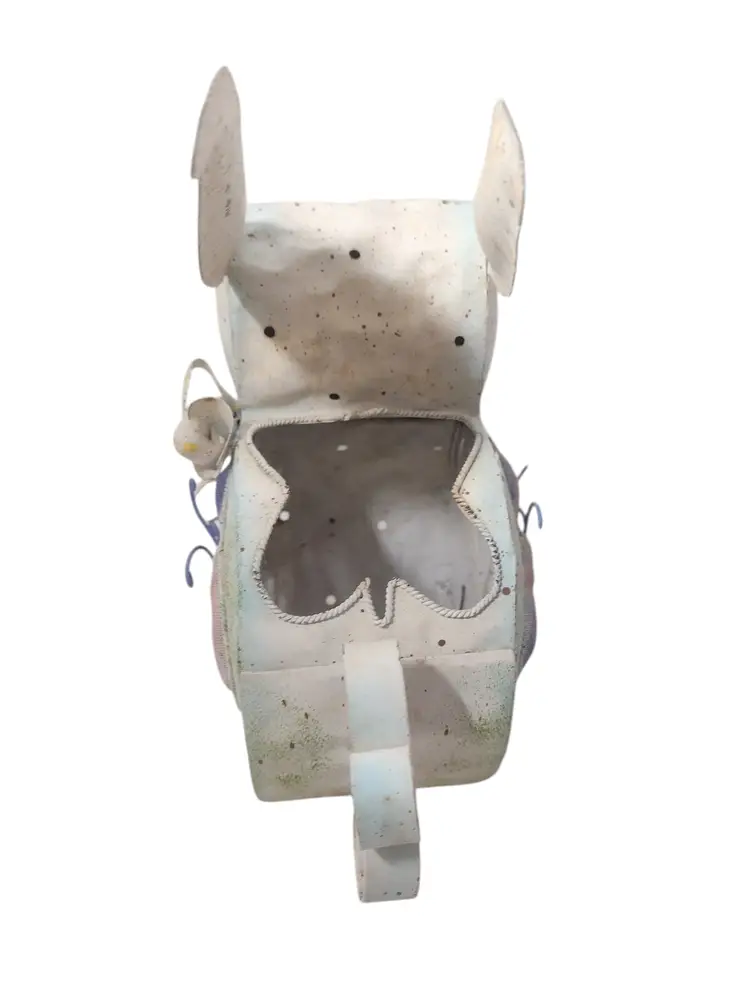 This is a happy little hammered metal bunny with a curly tail and pastel butterflies on the sides. The light shines through the mesh in the butterfly & cutouts in the front of the face. Bunny measures 8" tall x 8" long x 3.5" wide.