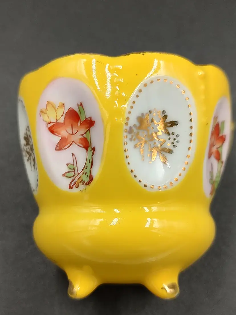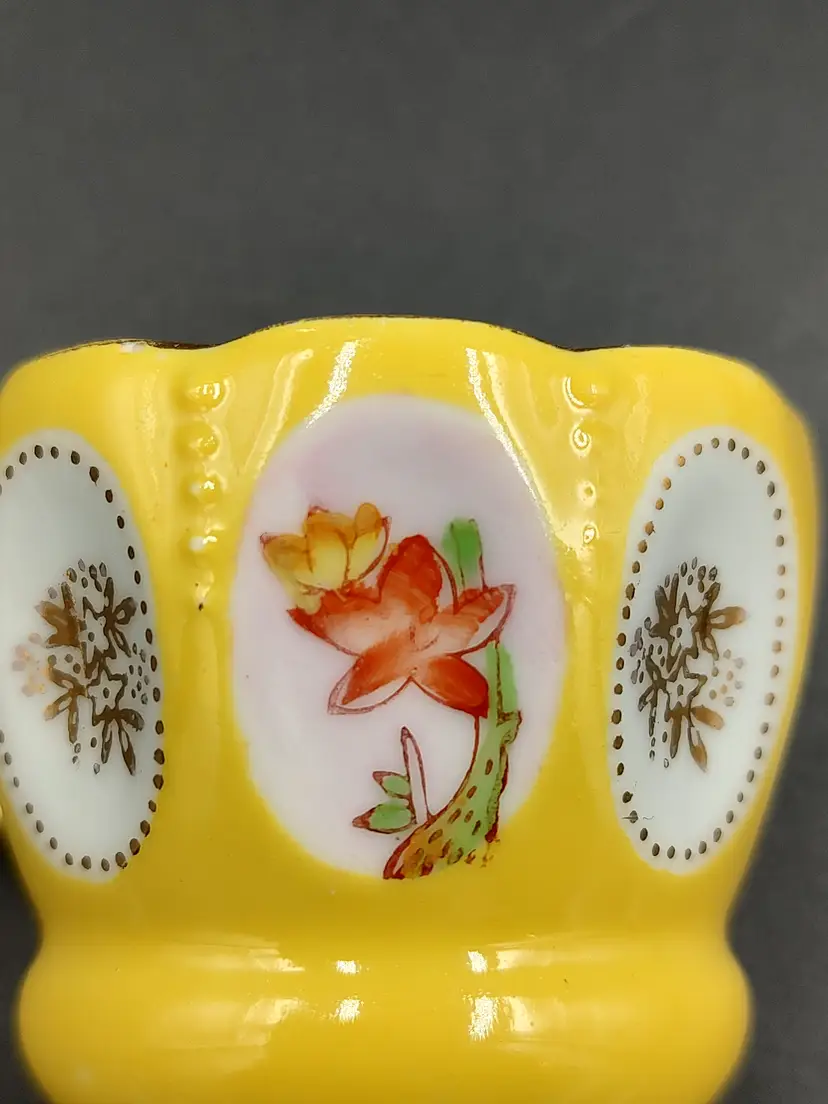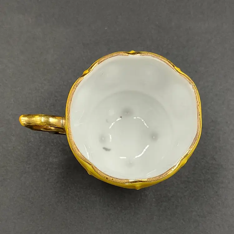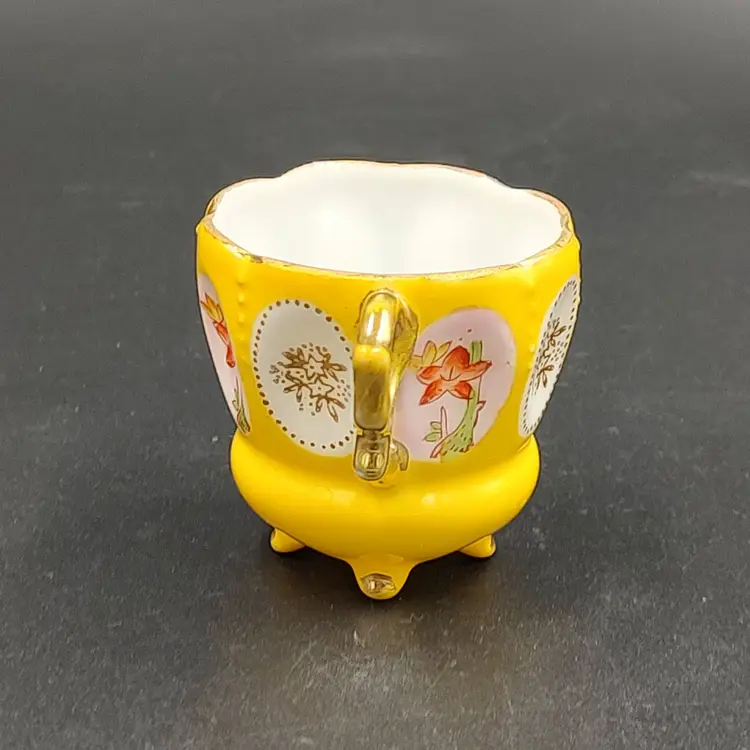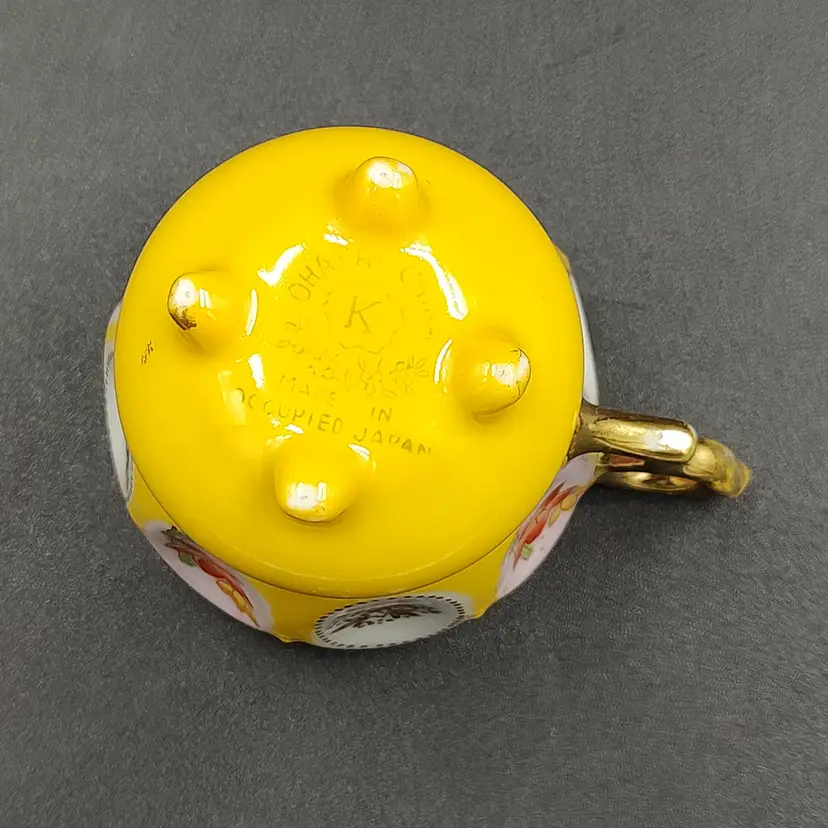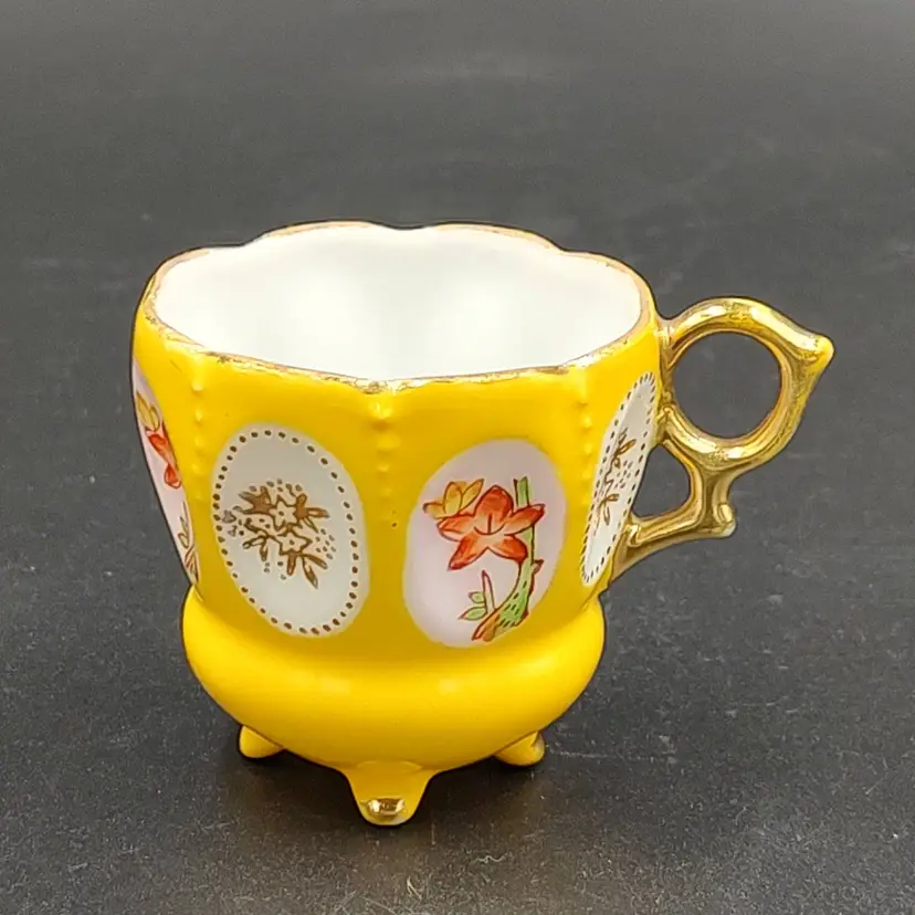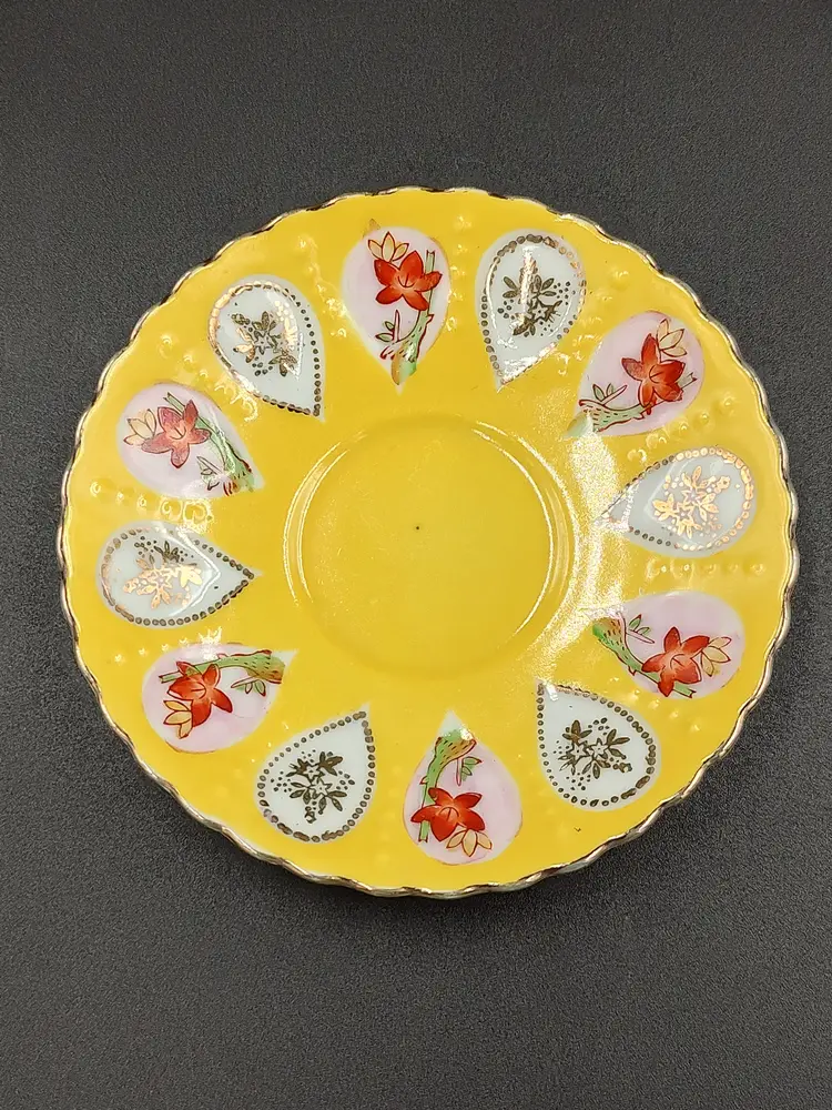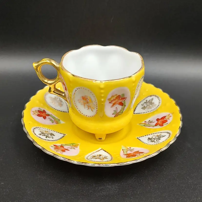 Vintage 1954-1952 (K) Kama Omashi China Yellow Demitasse Teacup and Saucer Set With Floral Motif and gold trim.Teacup height 2" x diameter 2" holds 2 ounces. Made in Japan