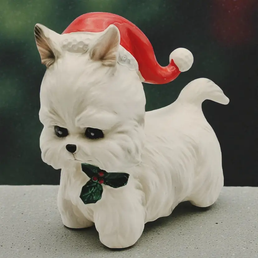 Vtg Lefton Christmas White Westie Dog W/ Santa Hat & Holly Figurine Japan