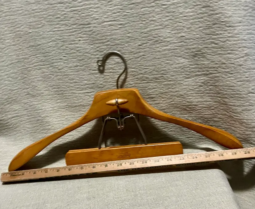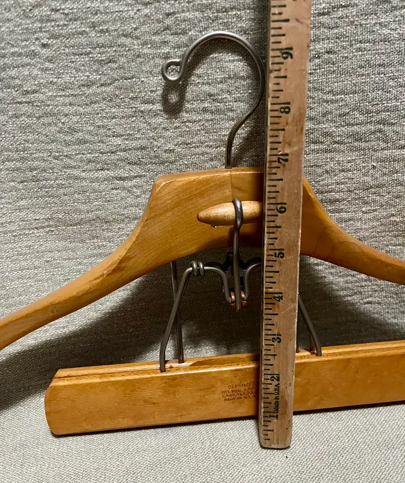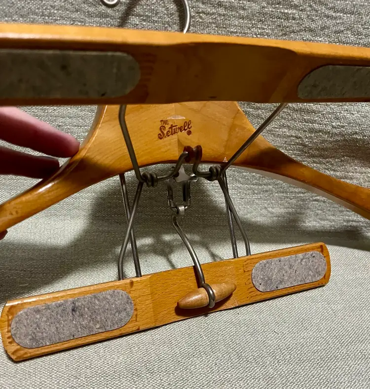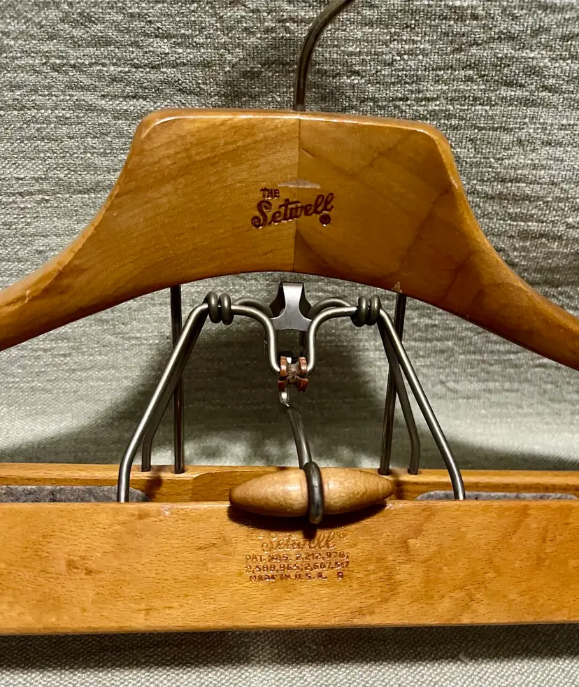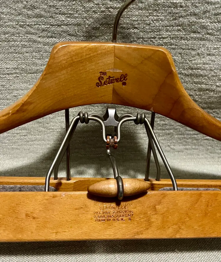 This vintage MCM 1950s men's suit and tie heavy-duty wooden hanger set is a stylish and practical addition to any wardrobe. Made with high-quality maple wood, this contoured shoulder jacket hanger features a beige color and a tailored look, perfect for everyday use. With a unique trouser (or skirt) clamp design, peg to hang a Collar or Tie over and durable sturdy construction, this Setwell hanger set is the perfect accessory to help keep your clothes looking sharp and organized, particularly heavy clothing. Proudly made in the USA, this exudes quality and sophistication. As an authentic piece, this additionally can be a great period piece for a PROP, theatre, set design, TV or movie.