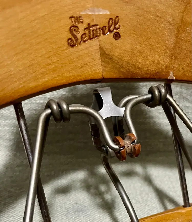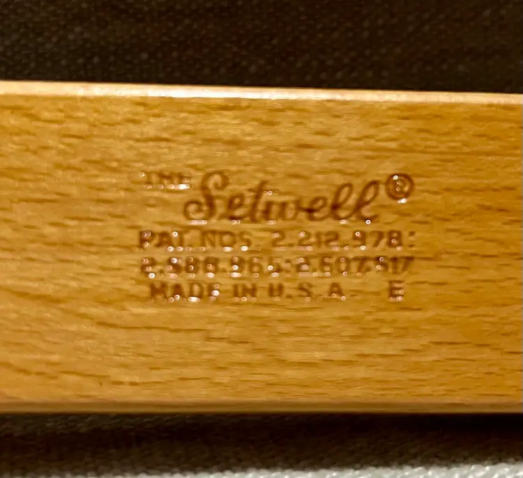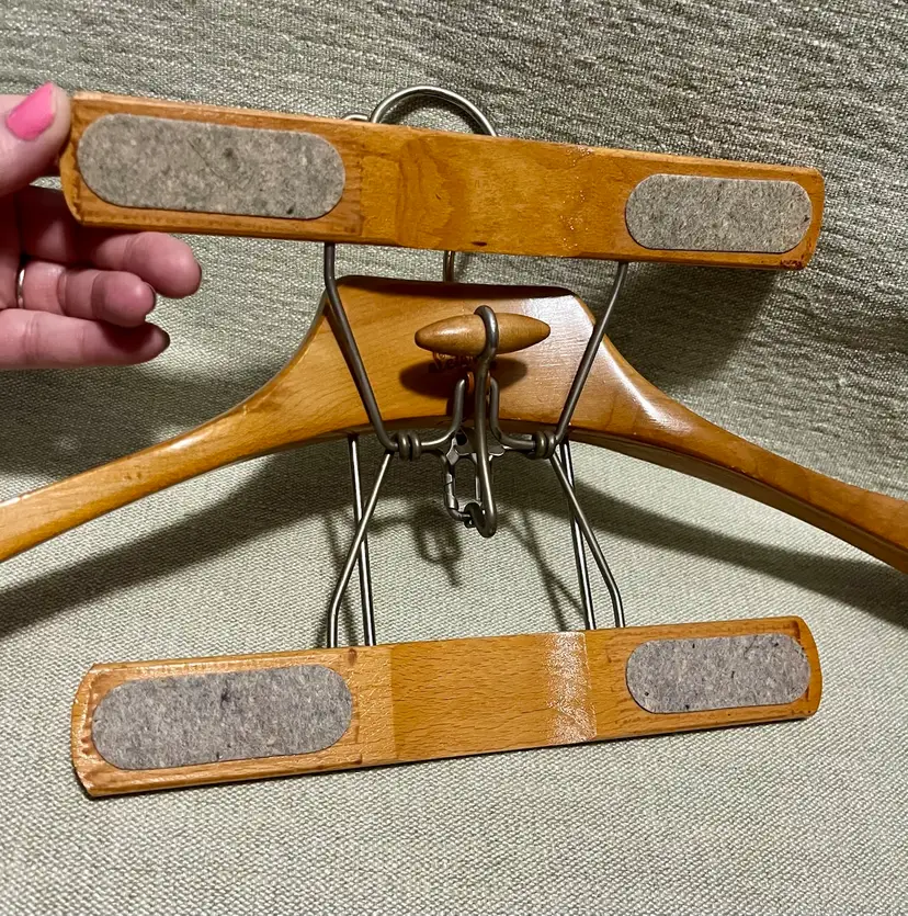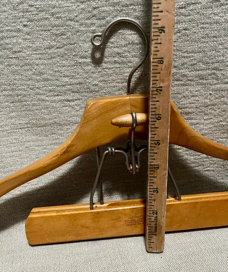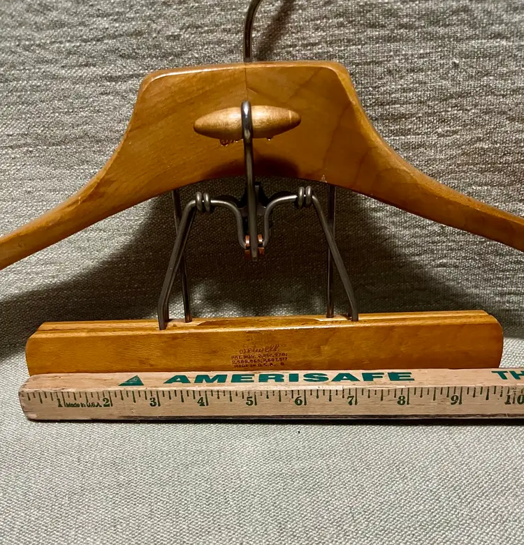 This vintage MCM 1950s men's suit and tie heavy-duty wooden hanger set is a stylish and practical addition to any wardrobe. Made with high-quality maple wood, this contoured shoulder jacket hanger features a beige color and a tailored look, perfect for everyday use. With a unique trouser (or skirt) clamp design, peg to hang a Collar or Tie over and durable sturdy construction, this Setwell hanger set is the perfect accessory to help keep your clothes looking sharp and organized, particularly heavy clothing. Proudly made in the USA, this exudes quality and sophistication. As an authentic piece, this additionally can be a great period piece for a PROP, theatre, set design, TV or movie.
