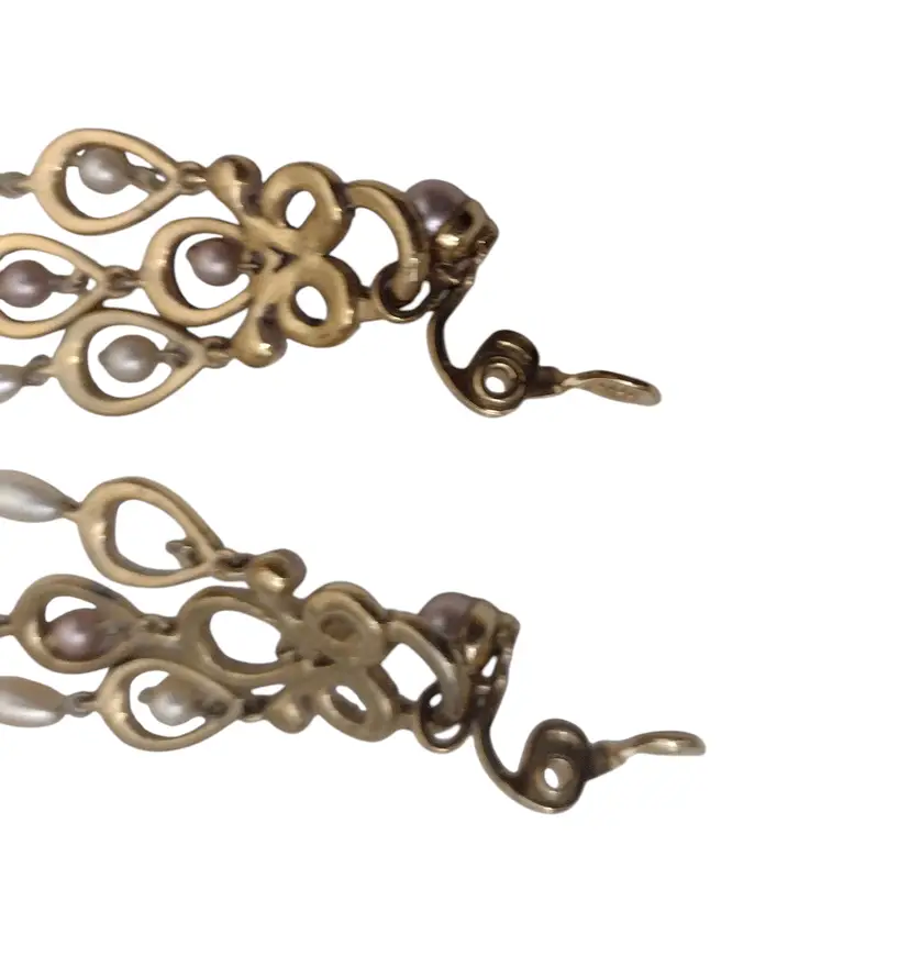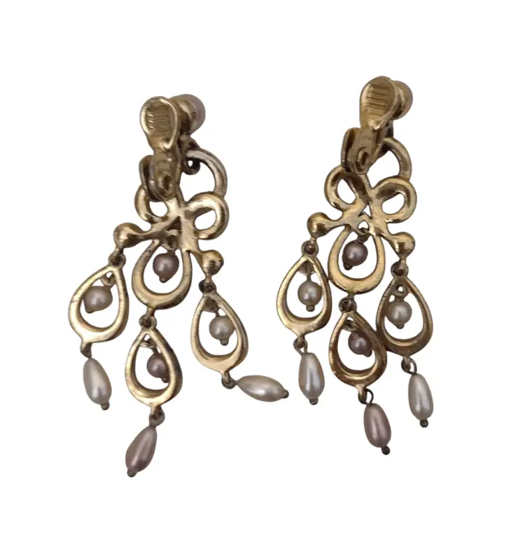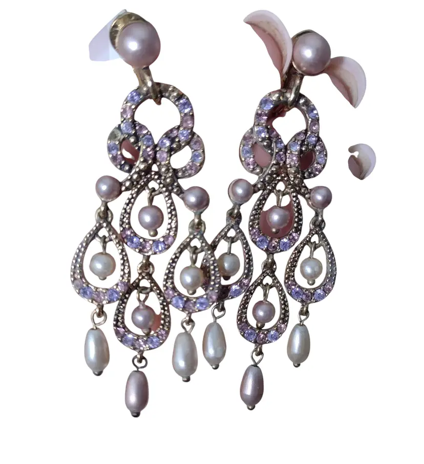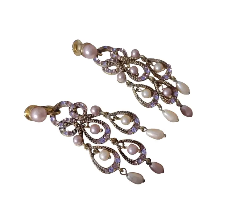 These are beautiful Chandelier style clips on dangle earrings in an ornate gold tone with Lavender faux pearls & rhinestones. Earrings measure 2.5" long x 1" wide