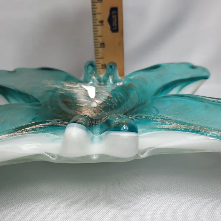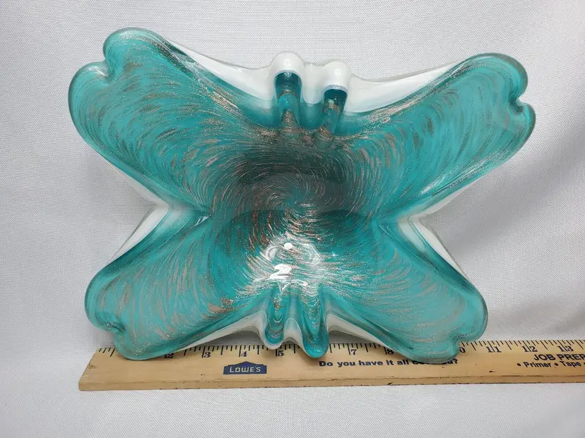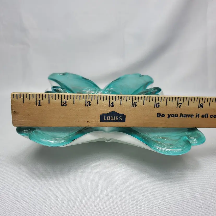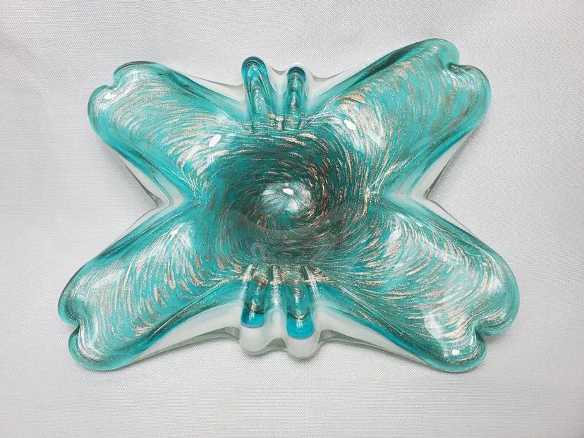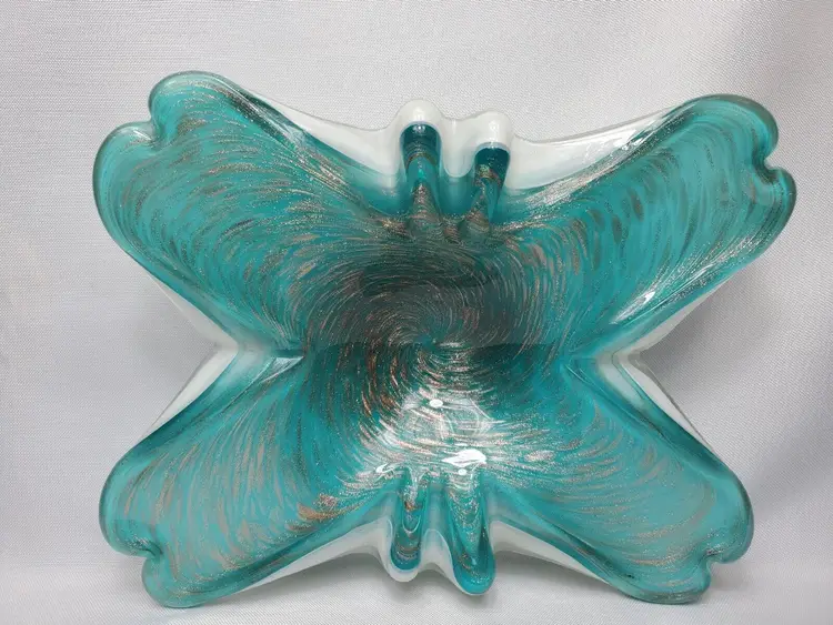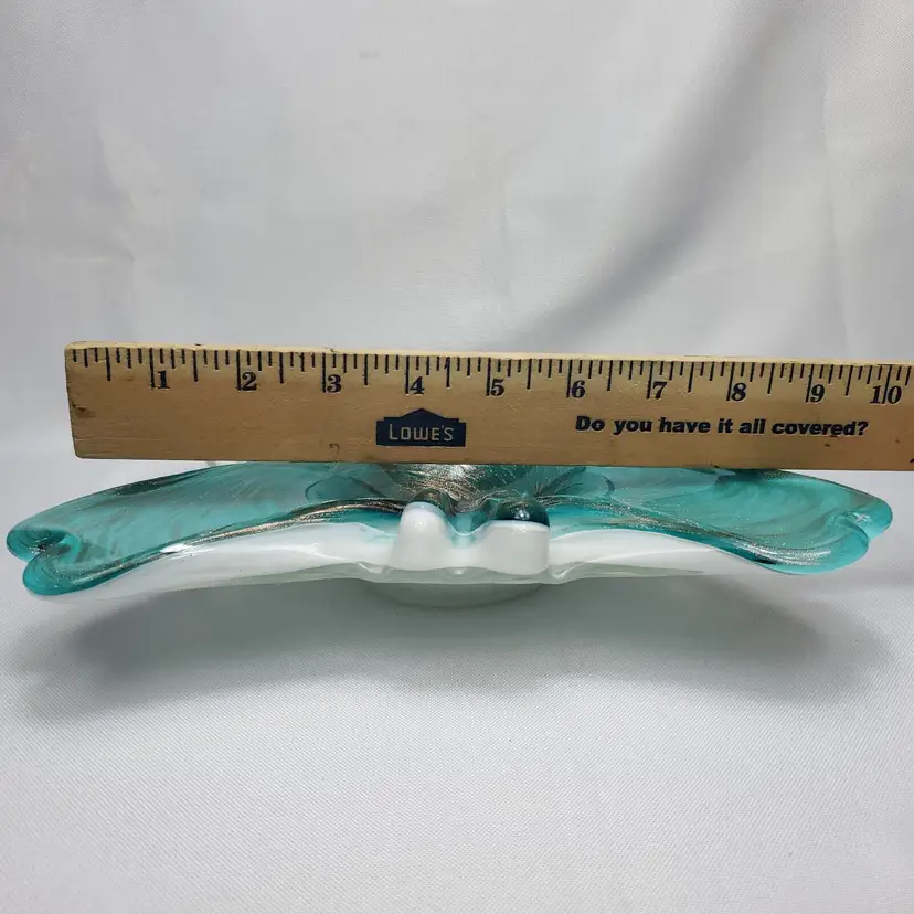 VTG Murano White Case Teal Glass Swirl Ashtray Gold Flake Butterfly Shape