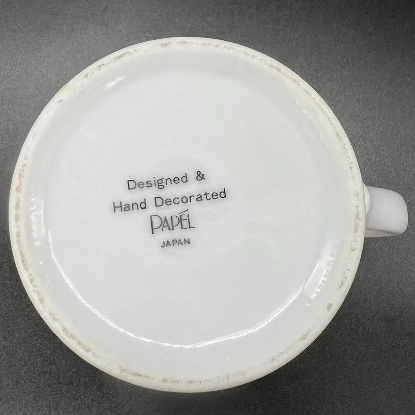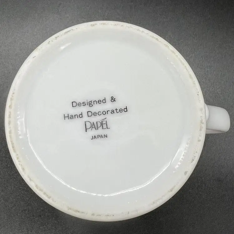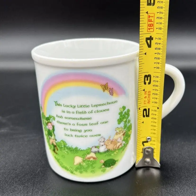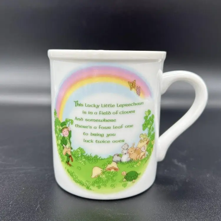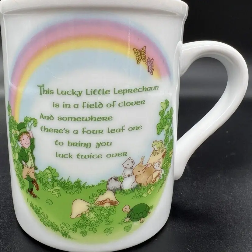 This charming vintage mug by Papel Japan is perfect for St. Patrick's Day or any occasion. It stands at 3 1/2 inches tall and features a delightful Leprechaun Poem. The multicolor design includes a variety of characters such as a turtle, butterfly, mouse, frog, rainbow, mushroom, squirrel, bunny, and of course, a leprechaun. Great condition. No chips or cracks. There is a stain on the edge as pictured.