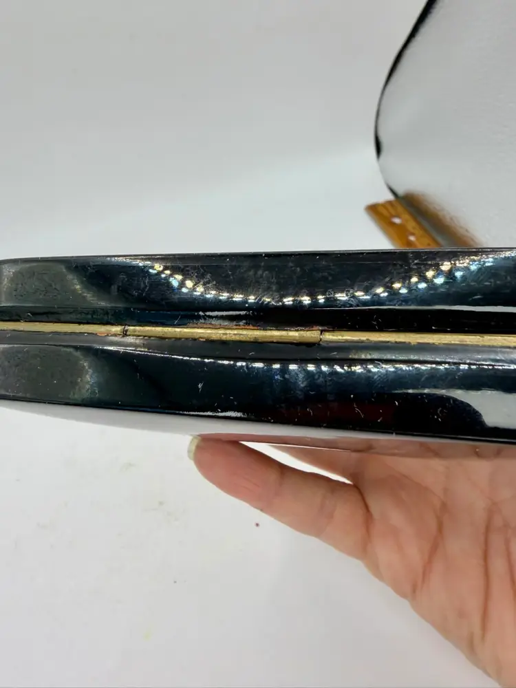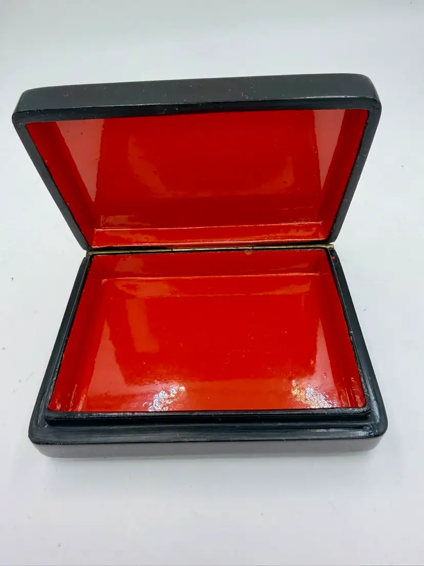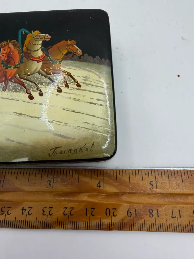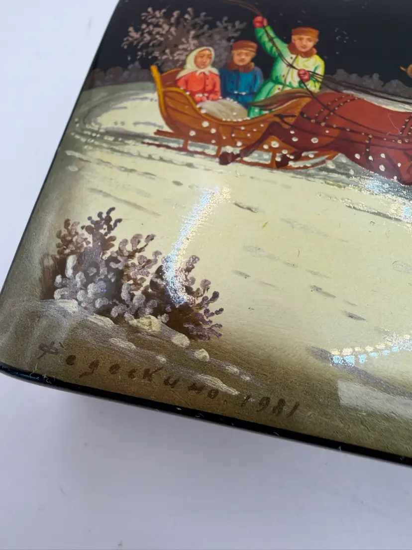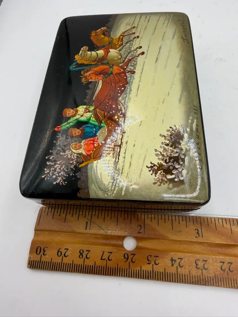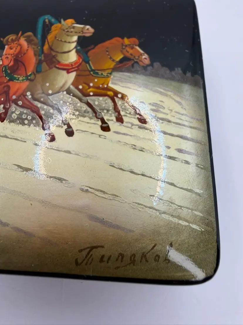 Vtg Russian Hand Painted Black Lacquer Winter Scene Trinket Box Horse Sleigh Signed