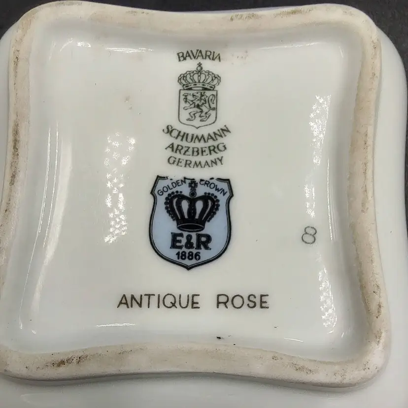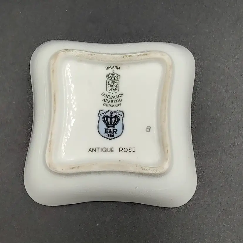 Vintage 1960-1970 Schumann Arzbery Bavaria Porcelain Trinket Dish With Antique Rose Pattern Trinket/Candy Dish. Height 1 3/4" x width 3.5" x length 3.5". Made in Germany