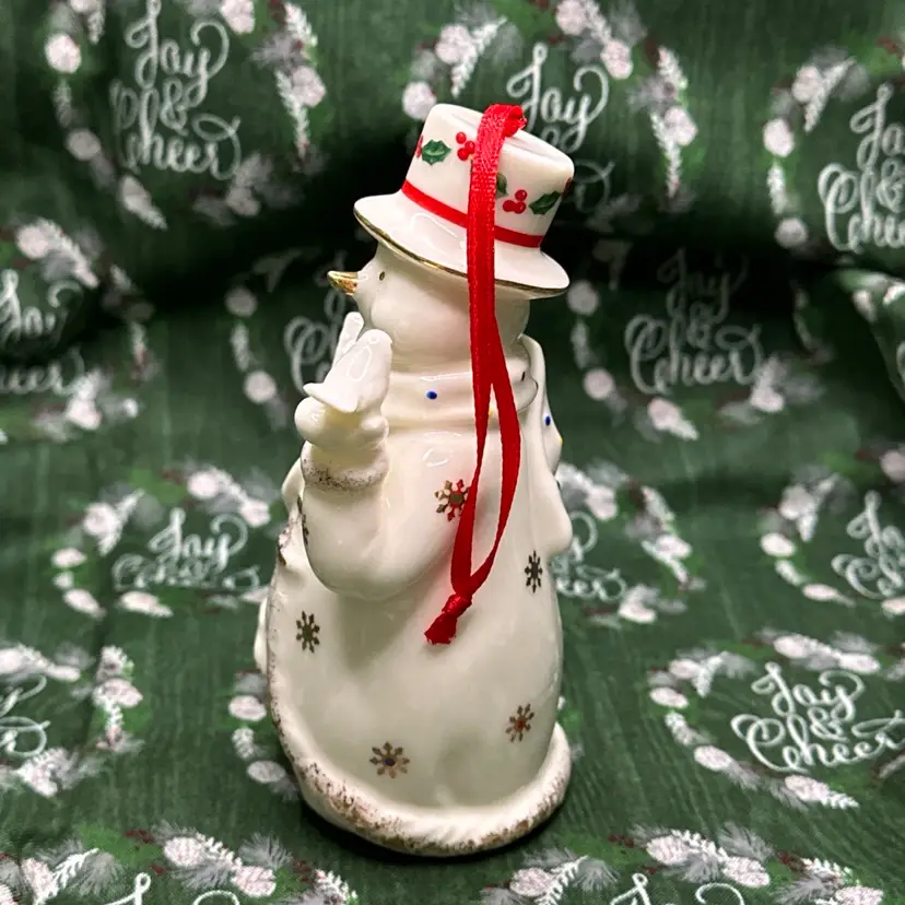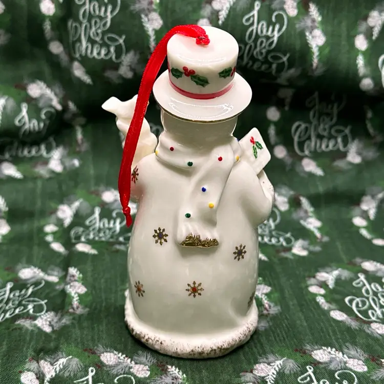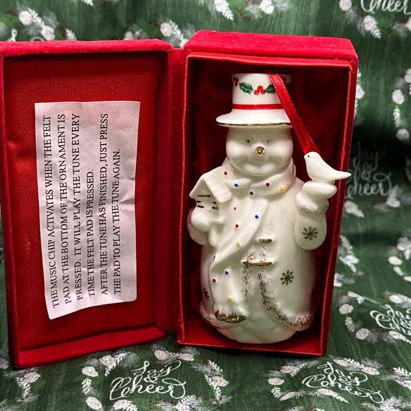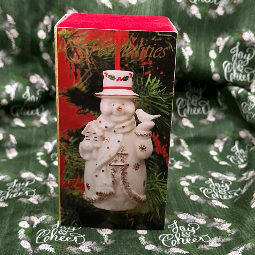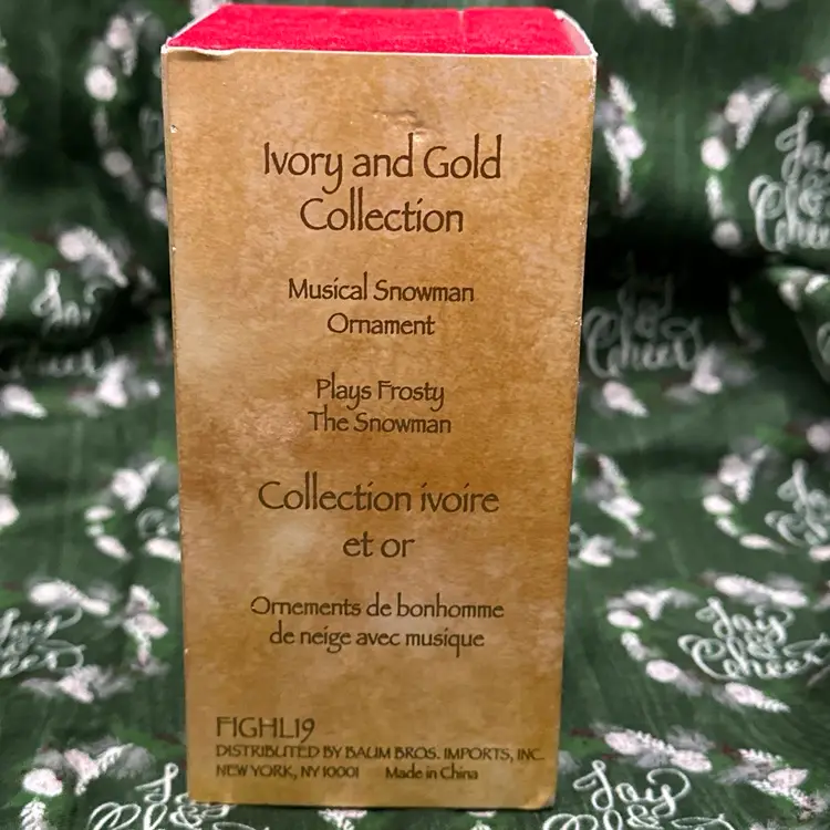 Vintage Snowman Baum Bros Snowman Ornament. The porcelain ornament features a beautiful ivory gold color with holly details and a velvet box. Plays “Frosty the Snowman”It is perfect for any recipient and occasion, especially Christmas.