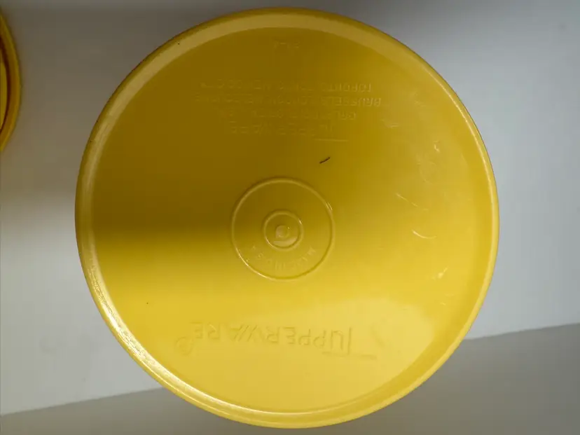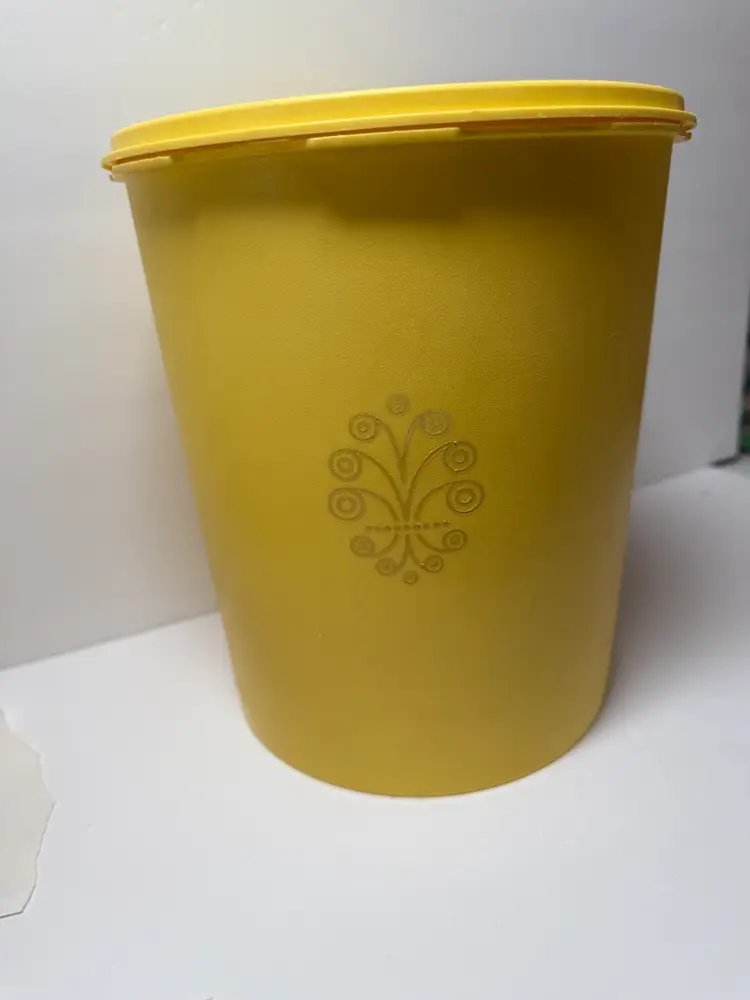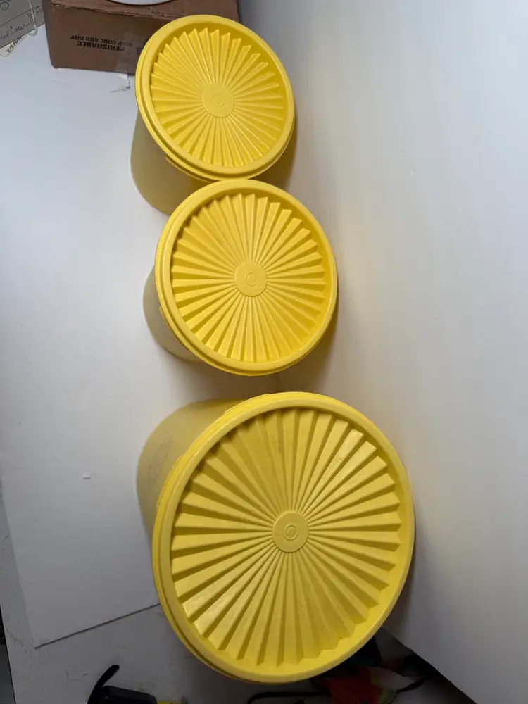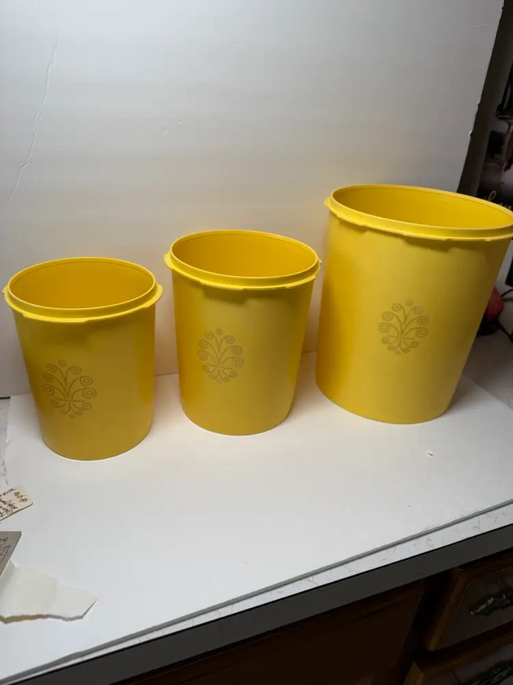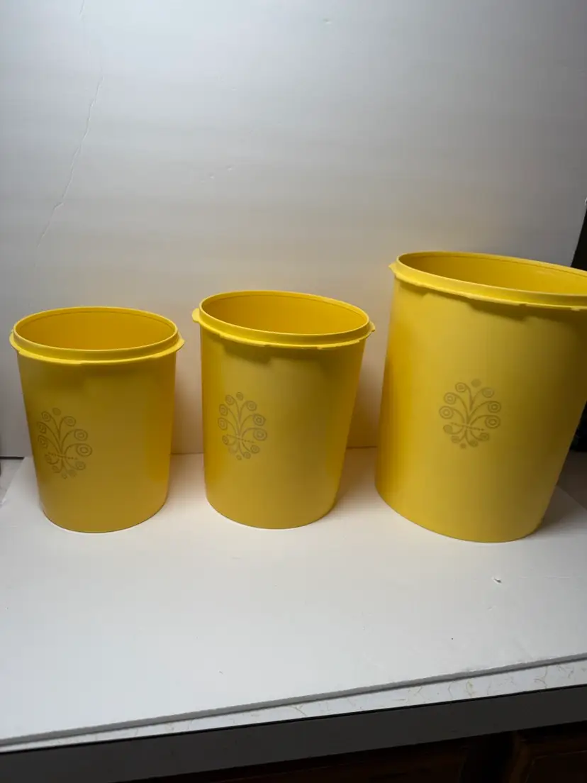 Tupperware yellow SERVALIER Nesting Canister set of 3 with lids; 805-2: 8 1/4;” H x 7 1/2” Diam.; 809-14: 6 3/4”H x 6” Diam.; 811-4: 6”H x 5” Diam. Very nice condition (please SEE photos; from smoke-free home.