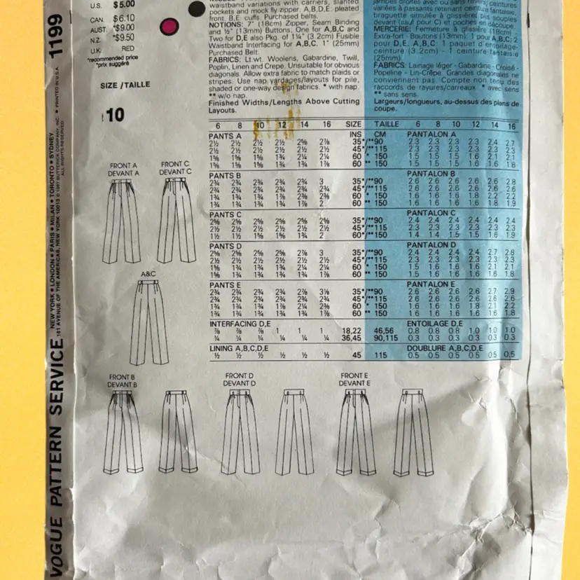 Vtg Vogue Basic Design Pattern 1199 Pants Sz 10 Uncut FF Please see photos. Let me know if you have any questions. Thank you for stopping by.