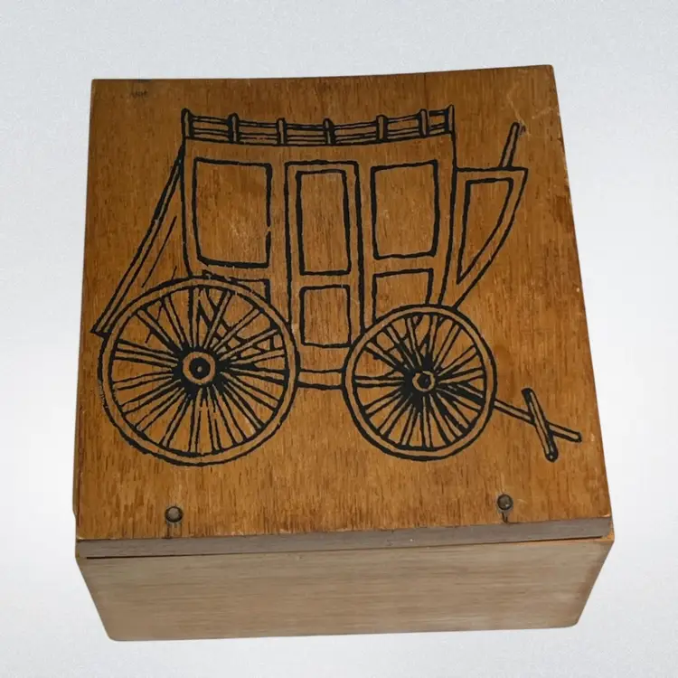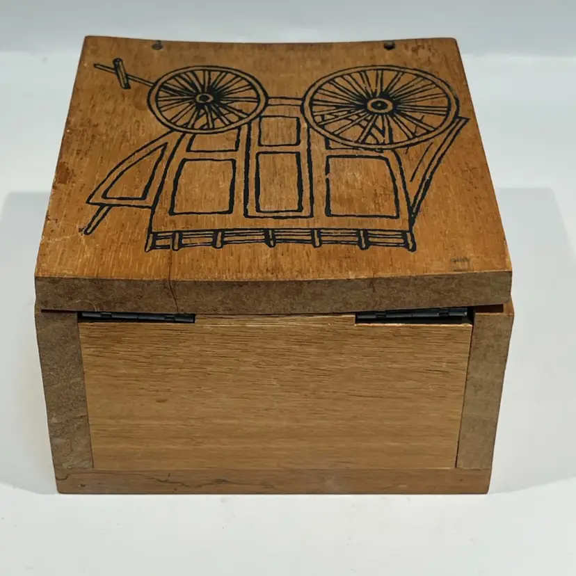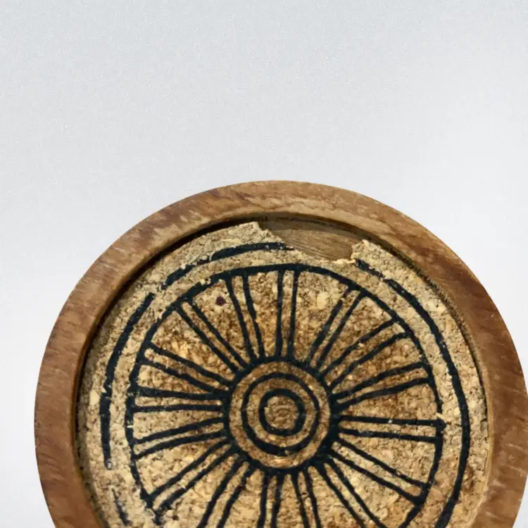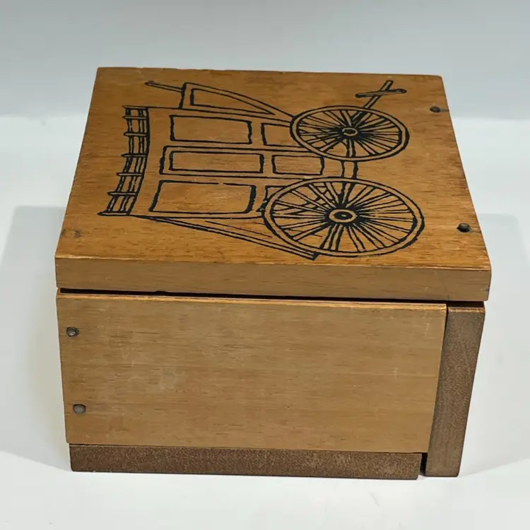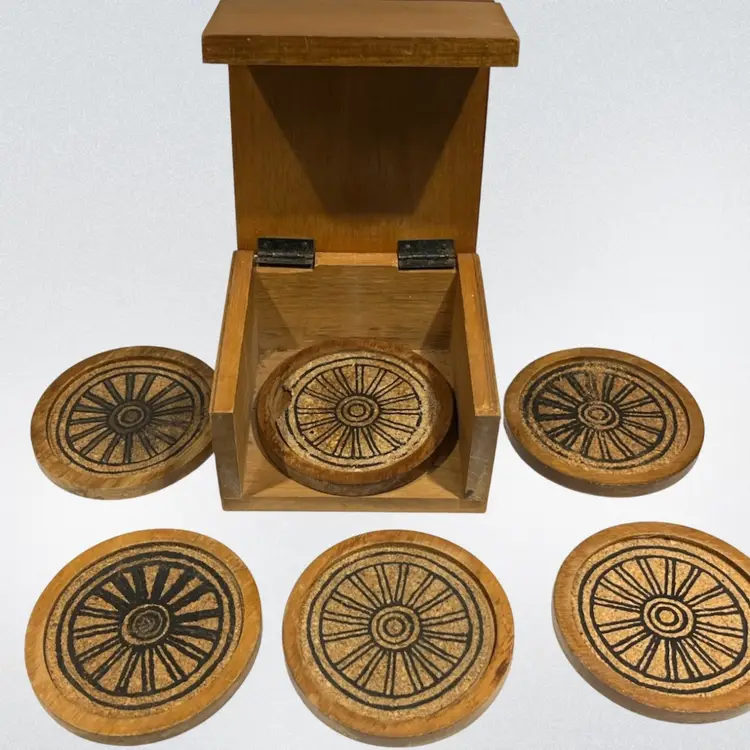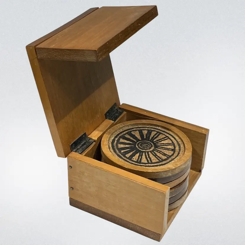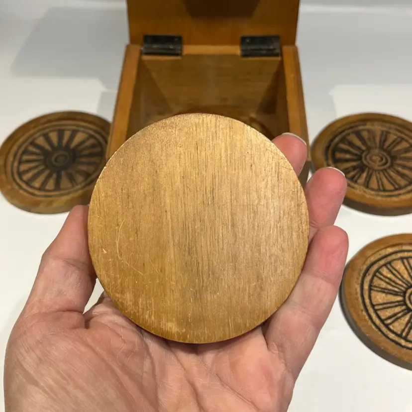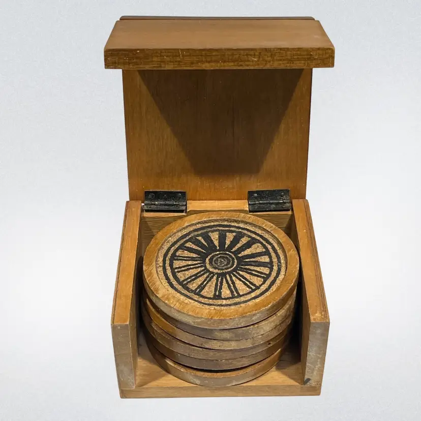 Great vintage condition- box displays nicely open or closed- one coaster has wear on cork as shown.