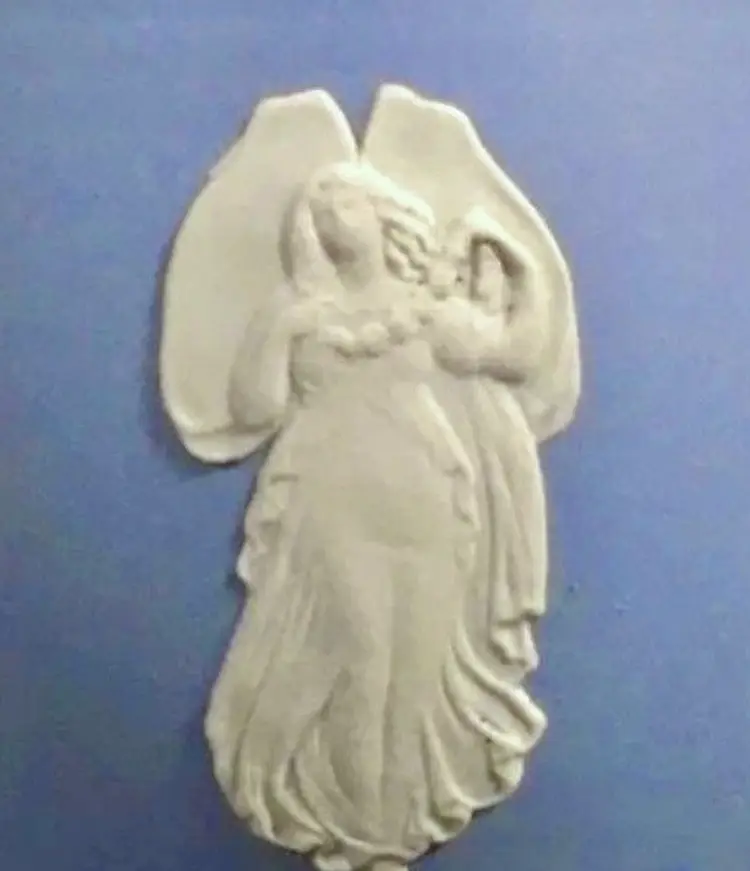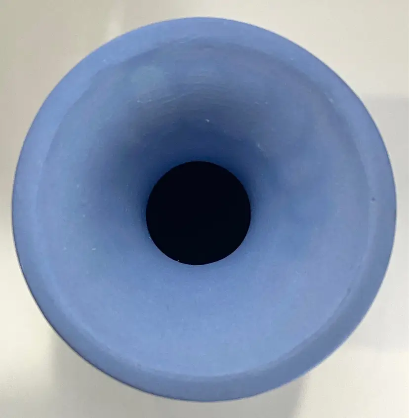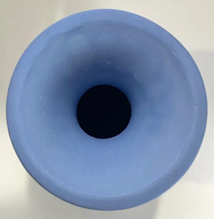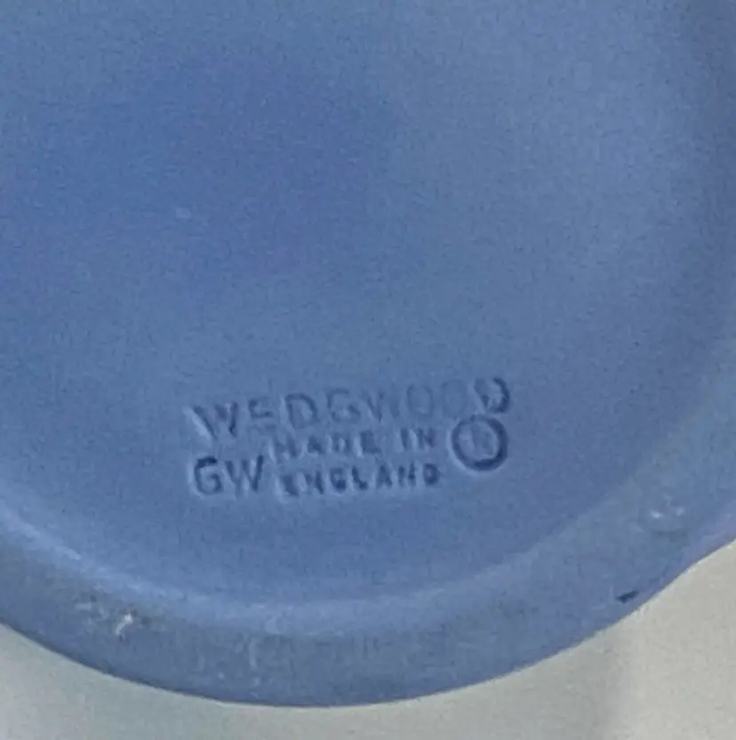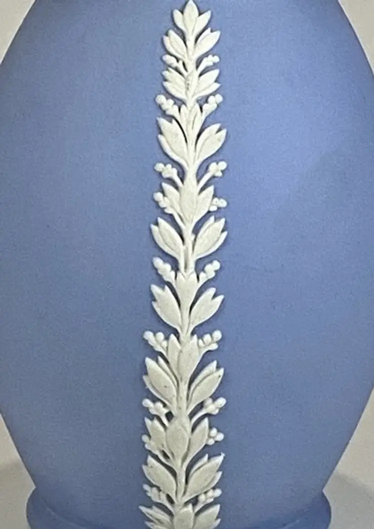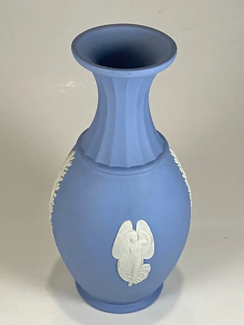 This blue bud vase by Wedgwood Jasperware measures about 6" in height by 2/3/4" in diameter and is stamped on the base 'Wedgwood Made in England'. It has an elegant matte finish and neoclassical design. There are raised white details of leaves and vine as well as angel figures on the face. This item is in good pre-owned condition. No chips or cracks.