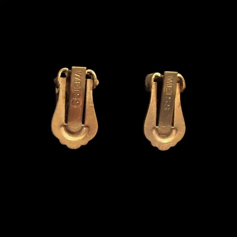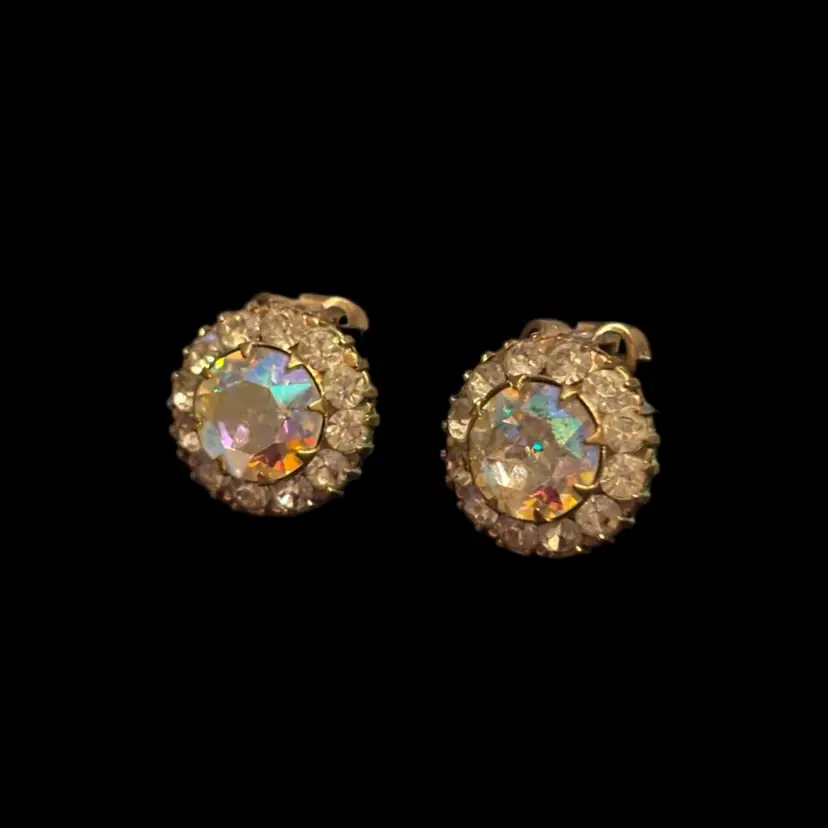 Beautiful AB rhinestone, gold tone Weiss clip-on earrings. 0.5” In good condition, minimal wear to metal