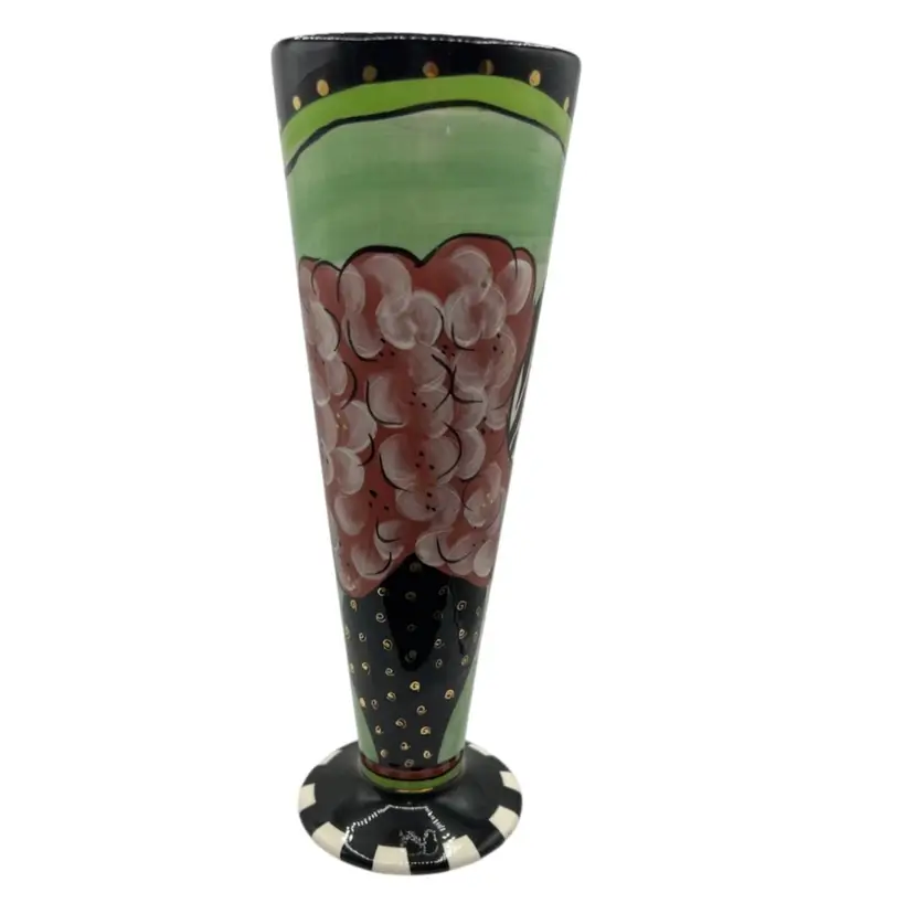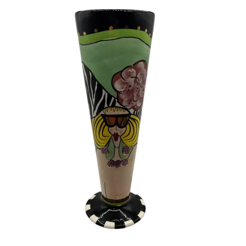 WHIMSICAL AUNT GERDIE IS A SWAK VASE BY LYNDA CORNEILLE. SHE IS FUN AND BRIGHT AND SIGNED BY THE ARTIST LYNDA CORNEILLE. SHE WILL BRIGHTEN UP ANY ROOM IN THE HOUSE.
